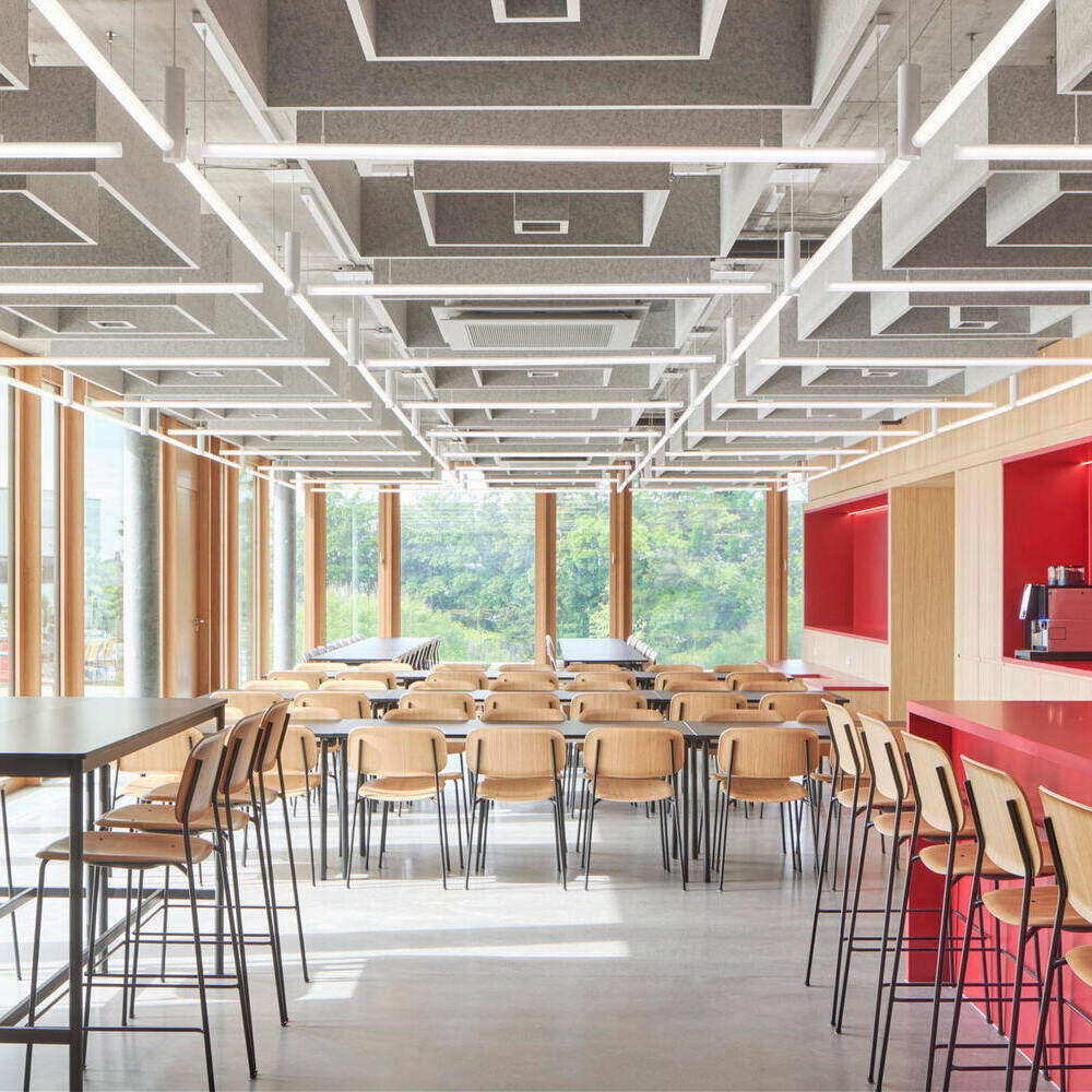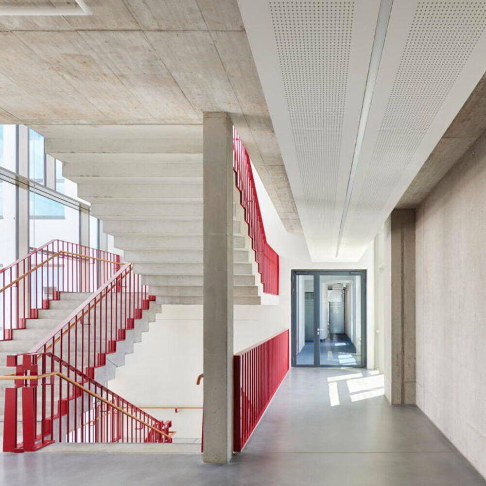 Im Spannungsfeld zwischen der hochtechnologischen Ausrichtung des Unternehmens und einer einladenden, patientenfreundlichen Atmosphäre gestalteten Dannien Roller Architekten + Partner die Räume hell und offen – ohne auf die notwendige Diskretion zu verzichten. Materialien und Farben strahlen eine angenehme Wärme aus, die Haptik der Oberflächen ist einladend und angenehm gestaltet. Sie vermittelt Zugewandtheit zu Patient:innen und Mitarbeitenden. Die Teamzonen mit Teeküchen, Aufenthaltsbereichen und Cafeteria sind wie einzelne Perlen einer Kette über das gesamte Gebäude verteilt. Mit ihrer auffällig kräftigen roten Farbgebung heben sie sich von der ansonsten harmonisierenden Farbpalette ab und markieren die identitätsstiftenden Gemeinschaftszonen in den verschiedenen Unternehmensbereichen. Das neu gestaltete Treppenhaus verknüpft diese „Perlen“ miteinander. Sein rotes Geländer fungiert wie ein Band, das die übergeordnete Logik der Raumsequenzen und deren Kohärenz verstärkt.