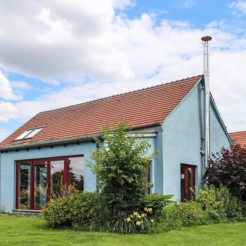Die ehemalige Scheune, nun ein lichtdurchflutetes Atelierhaus, verleiht dem Ensemble eine kreative Note. Hohe Decken, warme Holzelemente und ein Kamin als zentrales Gestaltungselement schaffen eine inspirierende Atmosphäre. Große Fenster lassen das Spiel von Licht und Schatten in den Innenräumen lebendig werden und geben den Blick frei auf den weitläufigen Garten, der das Haus mit der Natur verbindet.