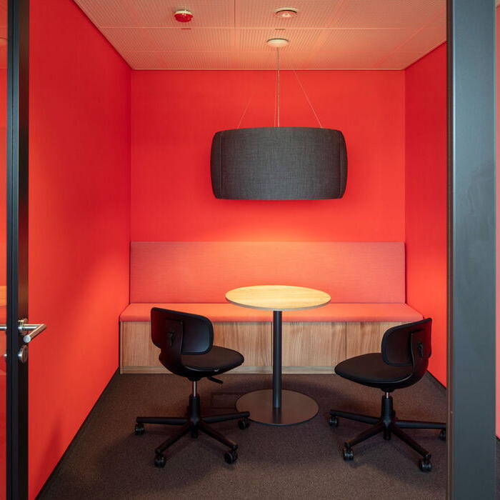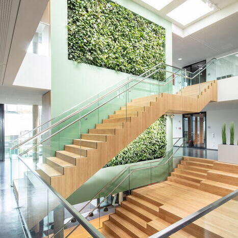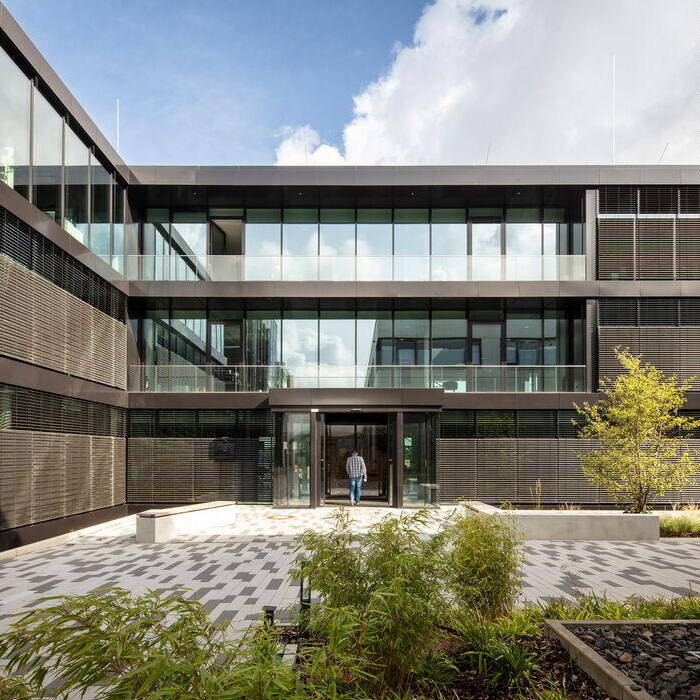 Auf dem rund 5.240 m² großen Teilgrundstück hebt sich das geradlinig geplante Gebäude leicht aus der Topografie heraus. Fast schwebend wirkt der vollverglaste Baukörper mit außenliegendem dunklem Sonnenschutz, der durch schmale, schwarze Metallbänder gegliedert ist. Zu einer Seite gibt es durchlaufende Balkone, deren gläserne Brüstung genau wie die Fassadenverglasung für Spiegelungen und Lichtreflexe sorgt. Der Wow-Effekt lässt beim Betreten des Gebäudes nicht lange auf sich warten. Die dunkle Eleganz geht in wohltuende Helligkeit über. Am Gelenk des L-Grundrisses sorgt ein über alle Geschosse offener Bereich für maximale Großzügigkeit. Oberlichter lassen das Tageslicht an den vertikal begrünten Wandflächen vorbei ins Innere strömen. Den Bezug zur Natur unterstreichen zudem helle Holztreppen, die im Erdgeschoss und erstem Obergeschoss als breite Sitztreppe ausgebildet sind. In den beiden Flügeln liegen moderne Arbeitswelten nach einem Open-Space-Konzept, zu dem Besprechungsnischen, Telefonboxen oder Think-Tanks sowie Besprechungsräume und ein Kickerraum gehören. Jeder Bereich erhält durch eigene Farbakzente eine individuelle Note. Aufgrund der voll verglasten Fassade, die nur wenig vor Schall schützt, wurde großer Wert auf die Akustik gelegt. Im Ergebnis führten akustische Simulationen zum Einsatz von speziellem Akustikputz, Teppichen und Wandabsorbern sowie entsprechendem Mobiliar mit akustisch wirksamen Oberflächen, die den Schall entsprechend den Anforderungen für Openspace reduzieren. Das Gebäude erreicht den KfW 70 Standard, was bei dem hohen Glasanteil nur durch Sonnenschutzverglasung und einen außenliegenden Sonnenschutz sowie eine maßgeschneiderte Be- und Entlüftung erreicht werden konnte. Das Dach ist zudem extensiv begrünt.