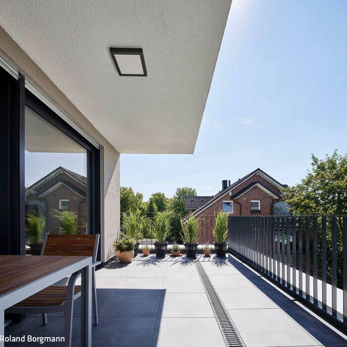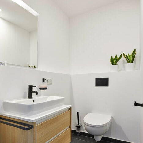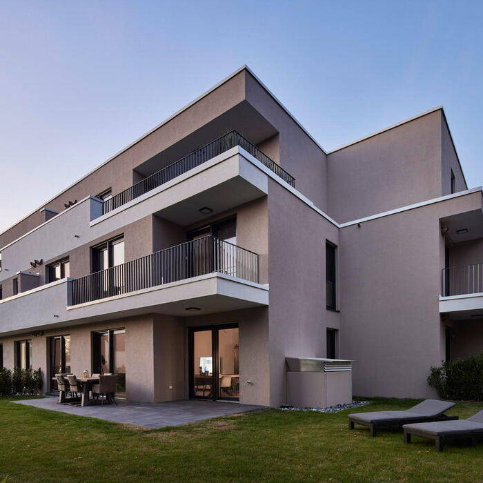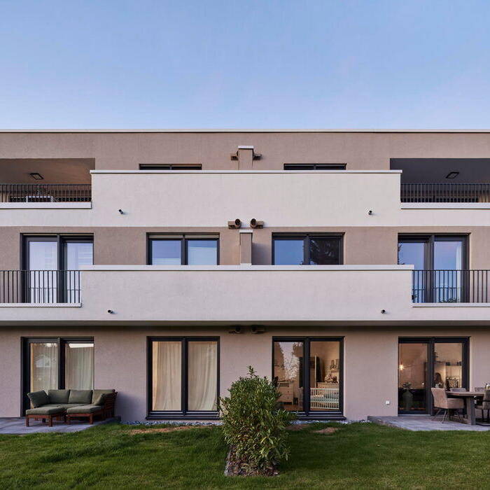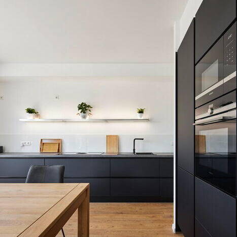 Auf der Rückseite weist das Gebäude Vor- und Rücksprünge auf, die den Baukörper zusammen mit den Brüstungen der umlaufenden Terrassen filigran und individuell wirken lassen. Hier wird zugleich der große Abstand zu den Nachbarn mit viel Grün dazwischen deutlich. Auch die bebaute Fläche hat ein Stück Natur in Form eines begrünten Daches zurückerhalten. Die Wohnungsgrößen variieren zwischen 70, 100 und 130 m² und sind jeweils mit offenem Wohn-Essbereich, zwei separaten Zimmern, Gäste-WC inklusive Dusche und einem zusätzlichen Bad en suite ausgestattet. Sämtliche Räume verfügen über natürliches Licht und fast alle haben einen Außenzugang – entweder zum Garten oder, in den oberen Etagen, zu Balkonen. In den Penthousewohnungen entwarf das Architekturbüro außerdem die Küchen. Diese sind in schwarz ausgeführt und bilden damit einen eleganten Akzent zu den hellen lichtdurchfluteten Räumen. Die Ästhetik des Hauses schließt nicht einmal die Luftwärmepumpe aus, die nicht wahrnehmbar auf dem Dach positioniert ist.