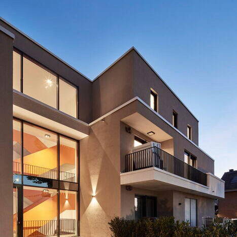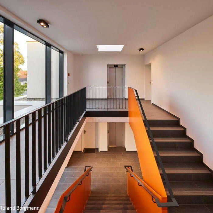 So war klar: Das barrierefreie Gebäude mit zehn Wohneinheiten und Tiefgarage soll einen möglichst großen Abstand zur Nachbarschaftsbebauung mit seinem Mix aus Ein- und Zweifamilien- bis hin zu Mehrfamilienhäusern haben, eine verträgliche Kubatur aufweisen, damit die städtebauliche Struktur erhalten bleibt, und unterschiedliche Wohngrößen vorhalten. Für Aufsehen sorgt zudem das großzügige, verglaste Treppenhaus mit seiner orangefarbenen skulpturalen Stahltreppe: ein Ort der Begegnung, der Anonymität keinen Raum lässt und zugleich ein kulturelles Statement darstellt. „Orange ist die Lieblingsfarbe des Bauherrn und die Farbe der Aussichtstürme im für seine Gestaltung vielfach ausgezeichneten Lippepark Hamm, die unser Büro geplant hat. Das zu hören, hat ihn begeistert“, erläutert Architekt Jens Berghaus. Straßenseitig macht das Gebäude mit der durchgängigen Treppenhausverglasung und dem Gebäudeversatz eher den Anschein, dass dort zwei große Villen stehen, anstatt eines Mehrfamilienhauses.