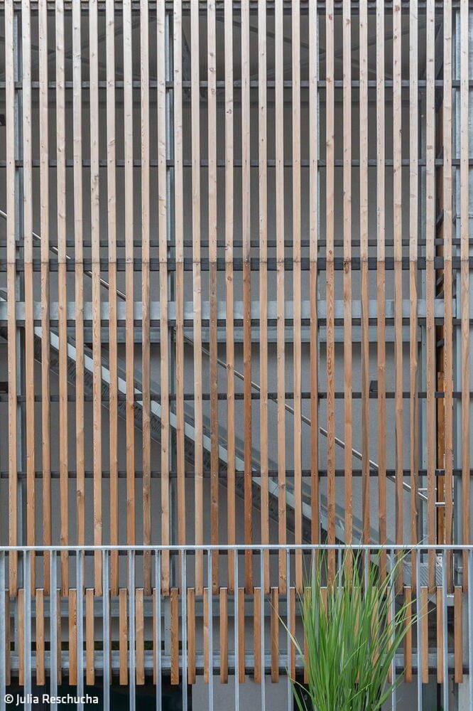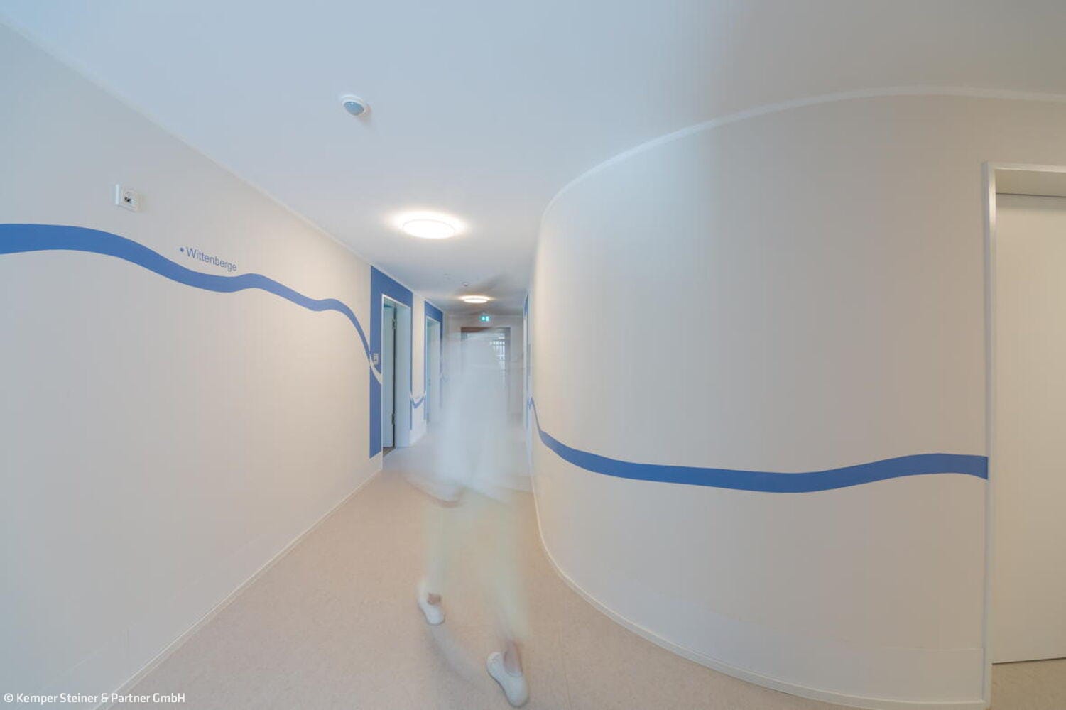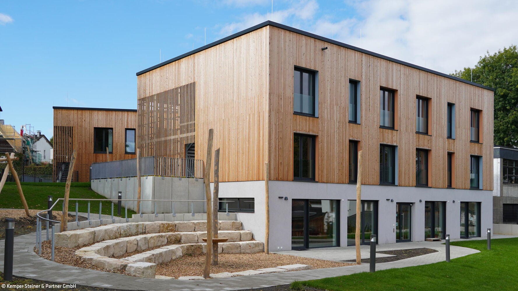 Der Neubau präsentiert sich mit einer klimafreundlichen, warmen Holzfassade und liegt südöstlich der Bochumer Innenstadt. Straßenseitig weist das Gebäude eine Rundung auf, in der sich der einladende Eingangsbereich befindet, um sich dann wie ein umgekehrtes „U“ zu entfalten. Dadurch entsteht ein geschützter Außenbereich, der verschiedene Spielmöglichkeiten und Erholungsflächen bereithält. Zweigeschossig geplant, sorgt eine starke Hanglage des Gebäudes für ein Souterrain, das als stützendes Element fungiert. Es ist mit einer Putzfassade versehen, wohingegen das restliche Gebäude in eine hinterlüftete Fassade mit unbehandelter Lärche gehüllt ist, die eine einladende und beruhigende Wirkung ausstrahlt. Auf rund 1.000 m² Nutzfläche finden 16 rollstuhlgerechte Zimmer inklusive Bad, zwei Elternzimmer mit Bad, ein Pflegebad mit höhenverstellbarer Pflegewanne sowie Gemeinschaftsflächen mit angrenzender Küche Platz. Zusätzlich gibt es einen Raum der Begegnung, einen Snoezelraum für Entspannung und Therapie sowie einen Kreativraum. Im Souterrain befinden sich eine große Küche, die sich für Kochkurse mit den Kindern eignet, ein Bewegungsbecken und Büros. Die Gebäudeform setzt sich in sanften Rundungen fort, die die Barrierefreiheit für mobilitätseingeschränkte Nutzer:innen in Flurbereichen unterstützend beachten. Die warme Farbgestaltung ordnet vier Gruppen getrennten Farbwelten zu, die durch die Auswahl passender Tiermotive unterstützt wird. Sie finden sich in der Wandgestaltung, in Bädern und im Treppenhaus sowie im Aufzug wieder.