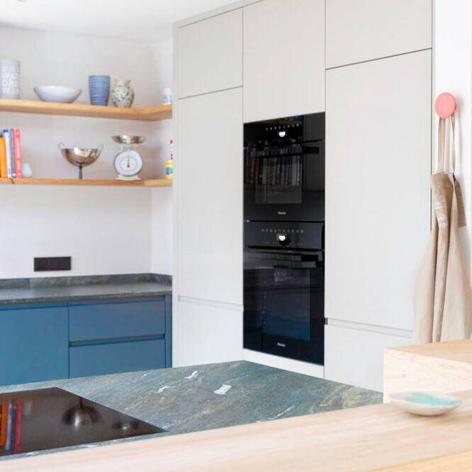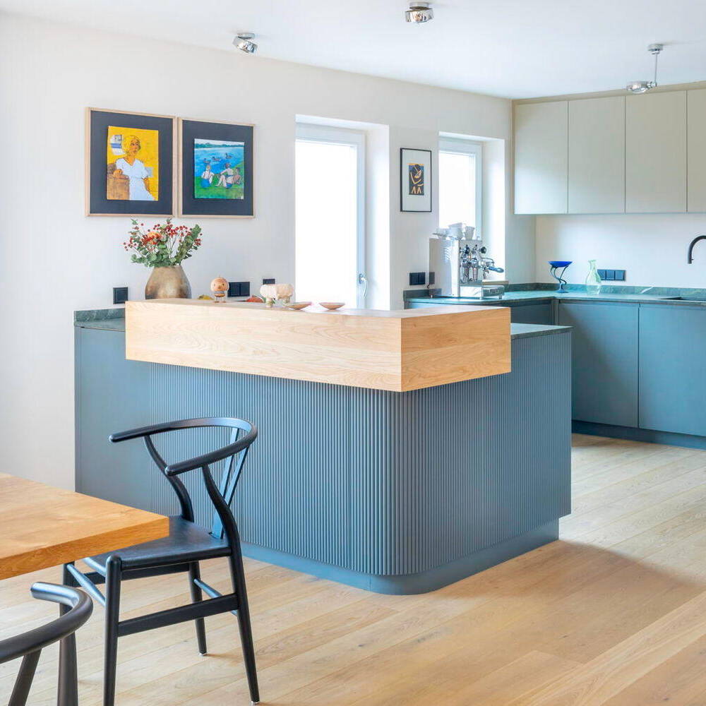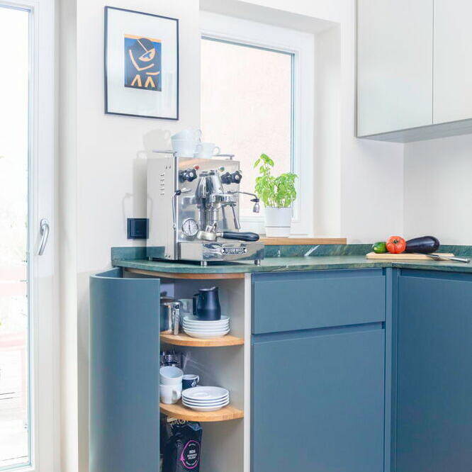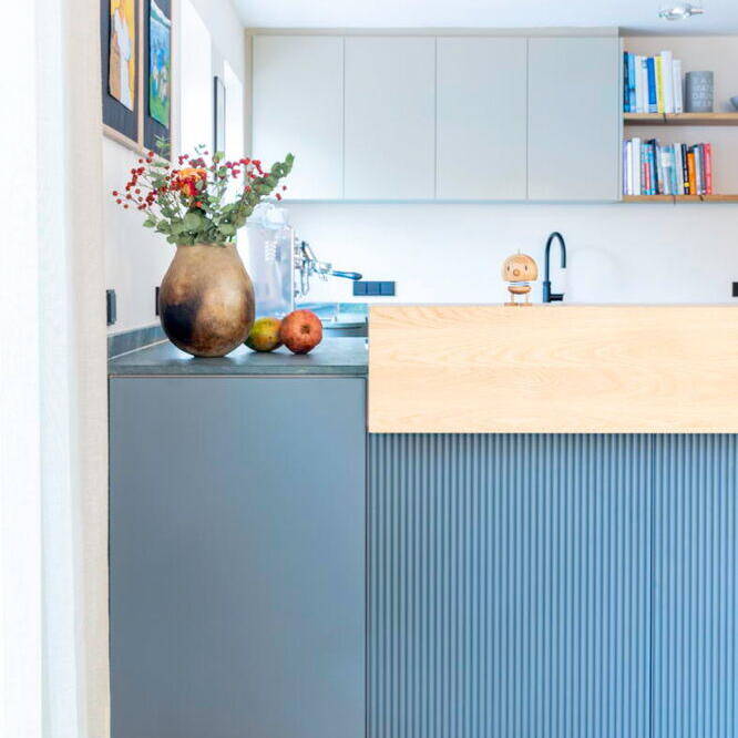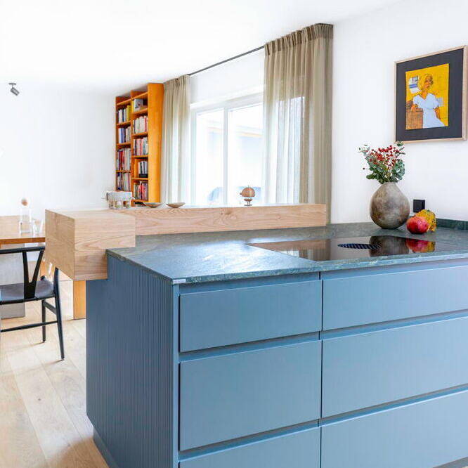 Bei den Unterschränken und dem Sockel setzt ein markantes Graublau einen kraftvollen Akzent. Die Oberschränke in Light Grey und die Arbeitsplatte aus Naturstein in Alpengrün mit edler Leather-Look-Oberfläche bilden dazu einen spannenden, aber dezenten Kontrast. Ein besonderer Blickfang ist der massive, individuell gefertigte Baraufsatz aus Eichenfurnier: kantig, markant und mit feinen, vertikalen Rillen, die ihm Struktur und Tiefe verleihen. Die kannellierte Struktur wurde millimetergenau umgesetzt, die Lackierung ist makellos – eine handwerklich anspruchsvolle Lösung, die die Küche unverwechselbar macht, genauso wie die übrigen, individuell vom Schreiner angefertigten Kücheneinbauten. Herzstück der Küche ist die große Kaffeemaschine, der sogar ein eigens entworfener Schrank, mit verborgener Schublade für den Kaffeesatz, gewidmet wurde. Genauso sorgfältig geplant hat Stephanie Loy den neuen Eingangsbereich mit Gäste WC. Dieser präsentiert sich als wohnlichen Raum mit klarer Ordnung und praktischen Extras – etwa der langen Ablage mit hochklappbarem Deckel für Ladekabel, Autoschlüssel & Co. sowie integrierter Steckdose sowie minimalistischen Sitzbank, einer Schreinerarbeit aus Holz.