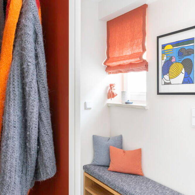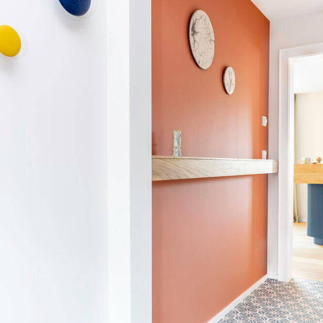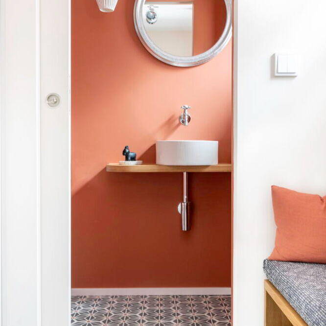 Die traditionell gemusterten Fliesen harmonieren perfekt mit den Wandflächen im Ton Red Earth, die Dots-Wandhaken aus Dänemark und der Designspiegel aus einer bayerischen Manufaktur setzen moderne Akzente. Vintage-Leuchten im Flur aus dem Bestand der Bauherren wurden liebevoll ins Konzept integriert und tragen zum besonderen Flair bei. Besonders schön: Alle Familienmitglieder waren beim Umbau involviert. Über Farben, Böden, Materialien wurde gemeinsam diskutiert – die hochwertigen Eichenholzdielen wurden ebenso gemeinschaftlich ausgesucht wie die Wandfarben. „Dadurch ist das Projekt voller Persönlichkeit und die Familie fühlt sich rundum wohl“, freut sich die Interior Designerin.