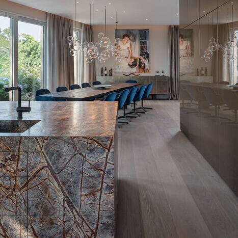 Auf der offen gestalteten Wohnebene im Staffelgeschoss steht zentral und frei im Raum ein glänzender Möbelkubus, dessen Oberfläche den umgebenden Raum spiegelt. Die Kochinsel besteht aus Naturstein, auf dessen gebürsteter Oberfläche sich ein Geflecht aus Gesteinsadern in unterschiedlichsten Braunschattierungen abzeichnet. Passend dazu ist die Platte des vier Meter langen Esstischs aus geköhlten Eichenbohlen, deren unbesäumte Tischkanten den natürlichen Wuchs des Baums beschreiben.