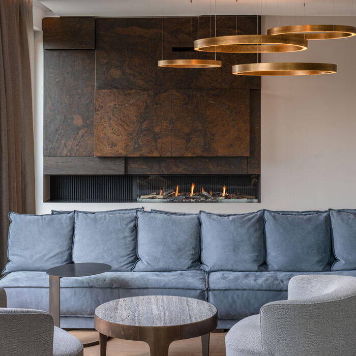 Im Inneren springt sofort die sorgfältige Auswahl von Materialien und Möbeln ins Auge, die eine ebenso gastfreundliche wie luxuriöse Atmosphäre schaffen: bernsteinfarbene Dielenböden, braun-schattierte Natursteine, einladende Polstermöbel oder auch die ausgeklügelten Leuchten, die in ihrer skulpturalen Erscheinung oft wie Kunstobjekte erscheinen.