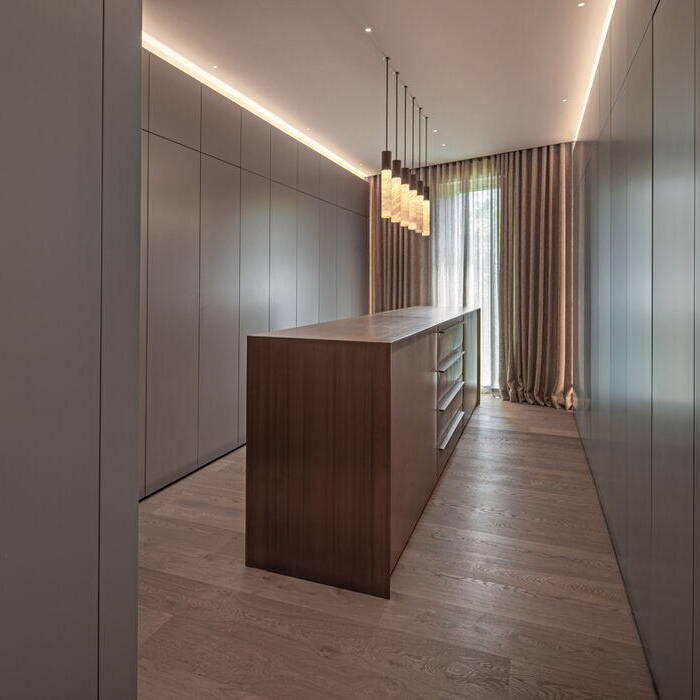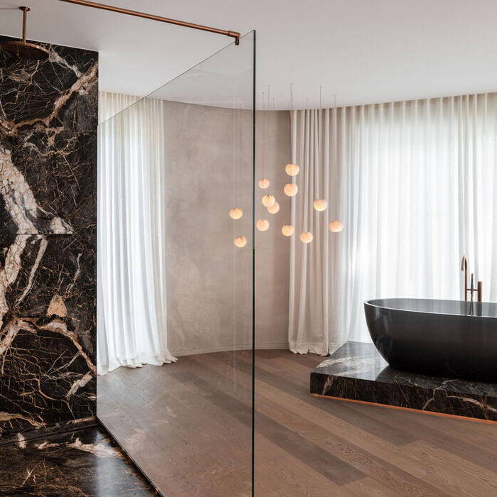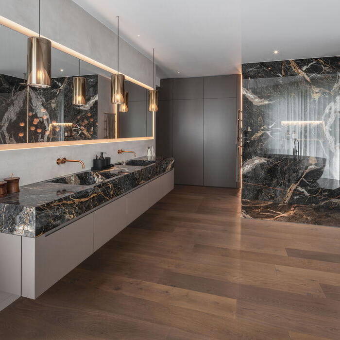 Die Treppenläufe und die Fußböden in Staffel- und Obergeschoss sind einschließlich der Bäder mit bernsteinfarbenen Eichendielen belegt. Apropos Bäder: Das Badezimmer präsentiert sich als eine Oase der Ruhe und Eleganz. Der freischwebende Waschtisch mit Marmoroberfläche erstreckt sich über eine Wand und sorgt nicht nur für eine elegante Erscheinung, sondern vermittelt ein Gefühl von Leichtigkeit. Waschtisch, Dusche und Wannenpodest sind aus Nero Portoro gefertigt, einem exklusiven dunklen Marmor mit cremeweißer und bernsteinfarbener Maserung. Die Abdeckung des Mittelblocks in der Ankleide ist aus massiver Bronze ausgeführt. Schmale Lichtfugen setzen nicht nur stimmungsvolle Akzente, sondern sorgen hier auch dafür, dass die Decke über den Schränken zu schweben scheint.