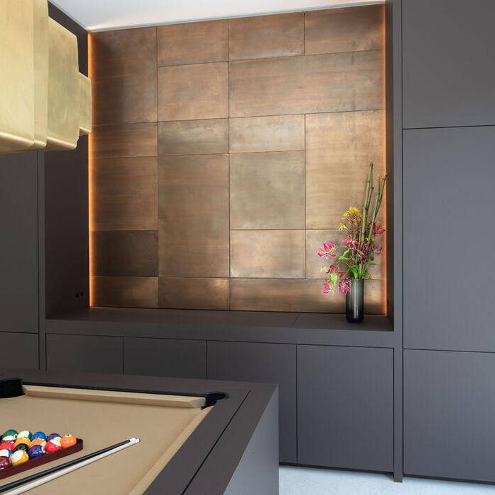 Das Herzstück des Erdgeschosses ist der Aufenthaltsraum mit Billardtisch und Küche – wie geschaffen dafür, Gäste zu empfangen und Partys zu feiern. Auch hier findet sich wieder edler Mamor. Diesen haben die Innenarchitekten bewusst mit einem eher lässig wirkenden und dem Industriebau entlehnten Bodenbelag aus geschliffenem Sichtestrich kontrastiert, der fertigungsbedingt leichte Farbunregelmäßigkeiten aufweist. Ein ähnliches Kontrastprinzip taucht im Billardraum auf: Die Fronten der Küchenschränke und des Billardtischs aus grau-braunem, matten Nanotech-Material zeichnen sich durch eine gleichmäßige Oberfläche aus. Die Rückwand der Küchennische hingegen ist mit bronzefarbenen Flüssigmetalltafeln belegt, die dank ihres handwerklichen Auftrags einen „imperfekten“ Farbverlauf aufweisen. Im Untergeschoss erwartet die Gäste eine exklusive Vinothek. Der Raum ist dreiseitig mit Wandnischen versehen, in denen beleuchtete Weinklimaschränke eingebaut sind. In Farbe, Form und Stil ist die Vinothek eine rustikale Abwandlung des Esszimmers im Staffelgeschoss. Fehlstellen und Astlöcher im Dielenboden sind silbergrau verspachtelt und die Tischplatte trägt deutliche Spuren einer Kettensäge.