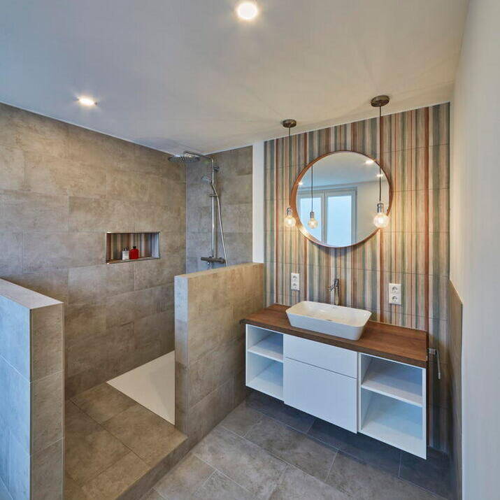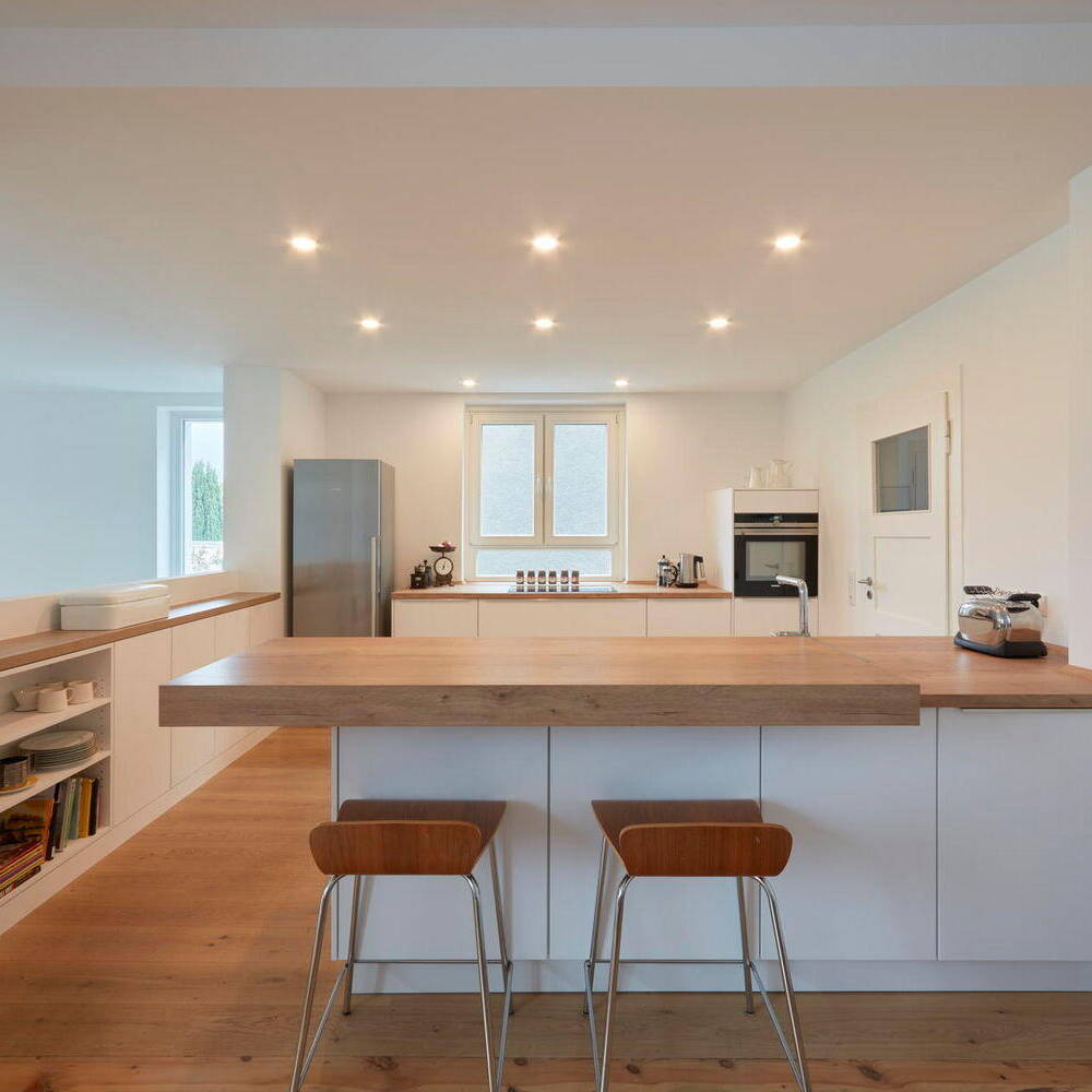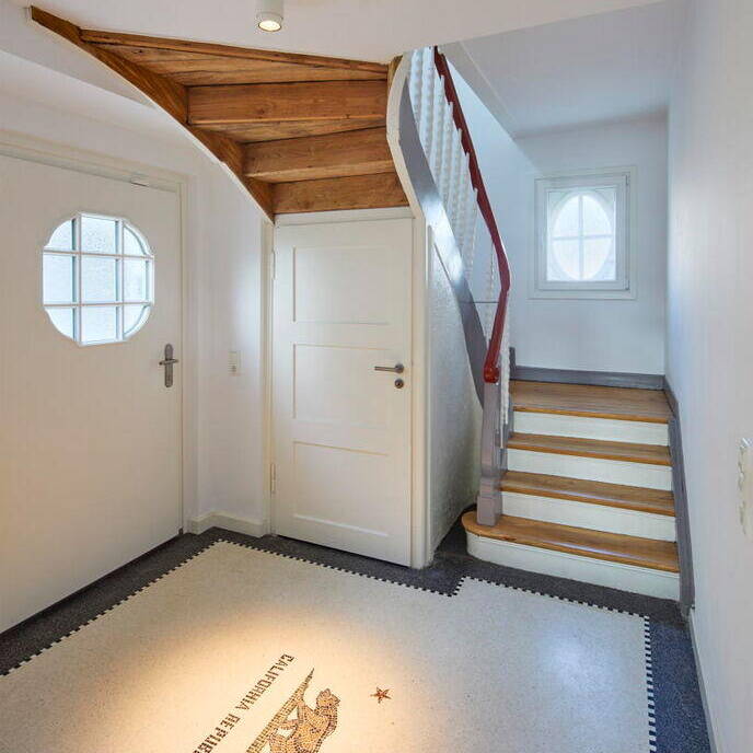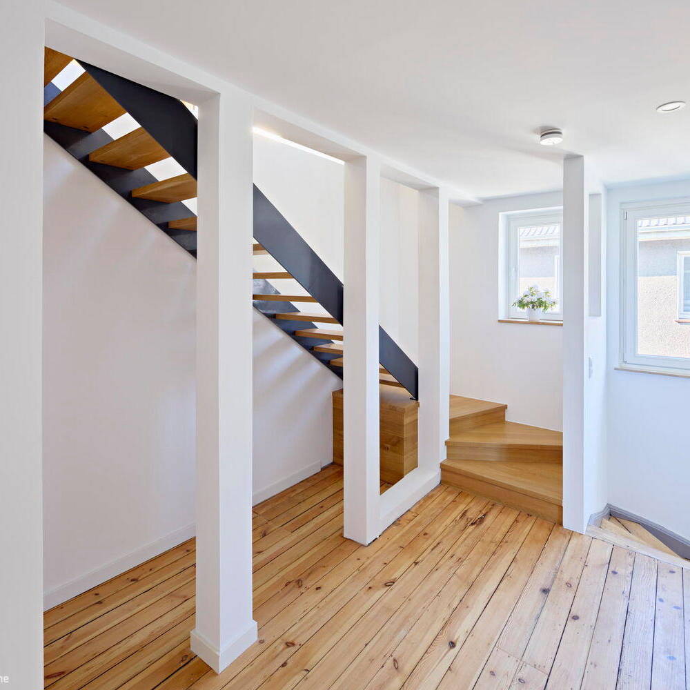 Das Highlight des Hauses ist der offene Koch- und Essbereich mit Anbindung zum Wohnbereich. Die verschiedenen Ebenen, die durch das abfallende Gelände bedingt sind, bilden eine wahrnehmbare Trennung, dennoch sind die Räume so verbunden und offen, dass sie Mittelpunkt des Familienlebens sind. Der Dachbalkon im Obergeschoss ist dem Elternschlafzimmer zugeordnet, das über ein Bad en Suite verfügt. Das Dachgeschoss erhielt straßenseitig eine Gaube sowie große Dachflächenfenster. Erhaltenswerte Bauteile wie Dielenböden, Innentüren, die gewendelte alte Holztreppe sowie ein kleines Rundfenster wurden aufgearbeitet und wiederverwendet. Neue Ebenen sind durch maßangefertigte Treppen mit Echtholz-Landhausdielen miteinander verbunden. Den Altbaucharme unterstreicht der Terrazzoboden im Eingangsbereich, in den das Wappen California Bear verewigt ist. Die Badezimmer sind mit Feinsteinzeug in warmer Betonoptik ausgestattet.