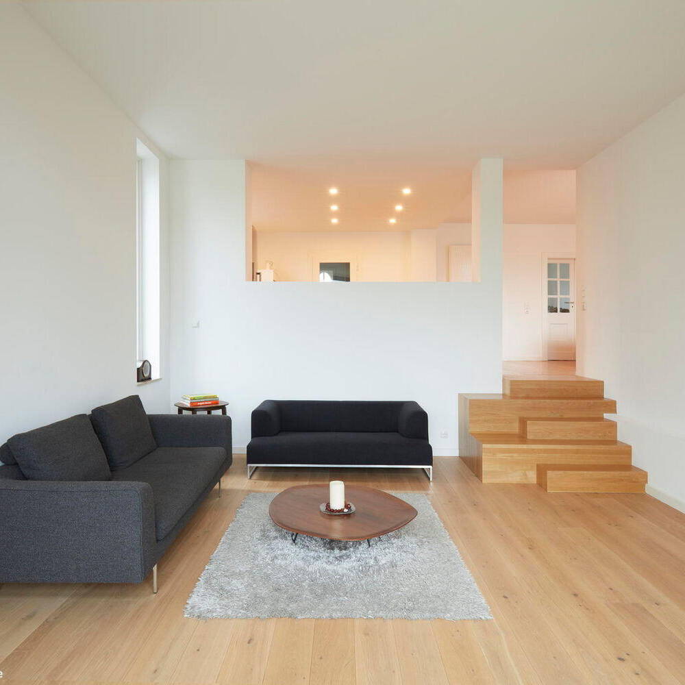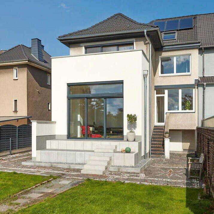 Im Vorfeld erfolgte eine detaillierte Bestandsaufnahme. Die Planerinnen hatten dabei insbesondere die Statik im Blick, da die Grundkonstruktion mit Fachwerk-Innenwänden und Holzbalkendecken in allen Etagen eine gründliche Analyse voraussetzte, bevor Eingriffe in den Bestand erfolgten. Die großzügige Grundfläche war in viele Räume unterteilt und entsprach daher nicht dem Raumbedarf der Bauherrenfamilie. Ziel war es daher, eine Balance zwischen offenen Raumgefügen und notwendigen, konstruktiven Bauteilen zu finden. Tragende Elemente aus dem Bestand sind zu raumbildenden Komponenten geworden. Der kubische Anbau mit Dachterrasse und großem Schiebefenster verlängert nun das Bestandsgebäude. Betonwinkel, die die Sitztreppe zum Garten bilden, stechen als modernes Element heraus und bilden den Übergang vom Gebäude in den Garten.