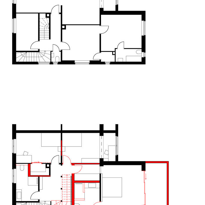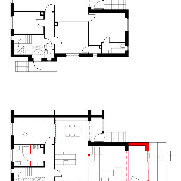 Die Historie dieses Reihenendhauses ist eng mit der Familiengeschichte der jetzigen Bauherrin verknüpft. Es handelt sich um ihr Elternhaus, das auf dem langgezogenen, rund 1.100 m² großen, leicht abfallenden Grundstück in der nördlichen Vorstadt Dortmunds steht. Während der Jahre, die sie mit ihrem Mann in den U.S.A. verbrachte, war es als Zweifamilienhaus vermietet. Nun kehrte das Ehepaar, aus dem inzwischen eine Familie mit zwei Kindern geworden ist, zurück. Für Kiupel Montero Harkort Architekten bedeutete dies, die vier Etagen mit rund 250 m² Wohnfläche für die Familie wieder zu einem Einfamilienhaus umzubauen, das heutigem Wohnkomfort entspricht. Gewünscht wurden außerdem ein Anbau mit Terrasse, Gemeinschaftsbereiche im Erdgeschoss, private Räume im Obergeschoss und ein ausgebautes Dachgeschoss als Kreativ- und Gästebereich.