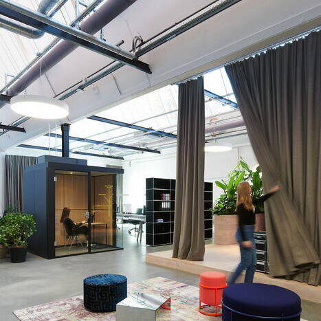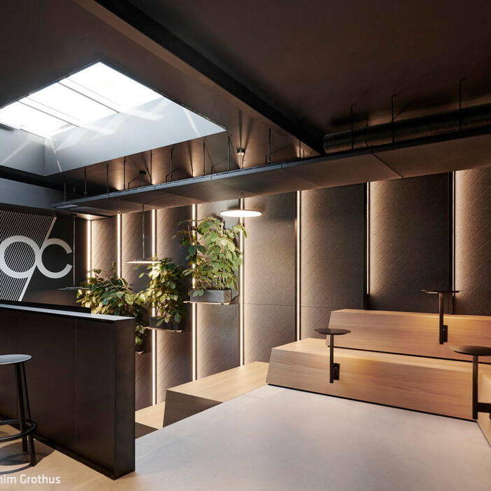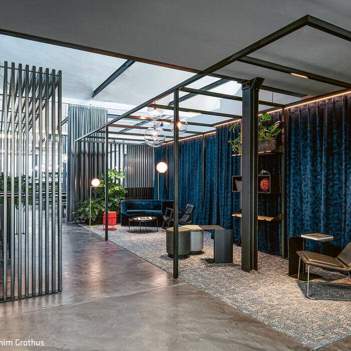 Farben und Materialien spiegeln das historische Erbe: Der in dunklen Farbtönen, Metall, Holz sowie Chrom gehaltene Industrielook des Bestands steht in einem spannenden Kontrast zu den warmen Materialien wie Eichenholz, das sich bei den Fachböden, Tischen und Sitzkuben zeigt. Rauer Beton und Sichtestrich treten mit hochwertigen Teppichen, Möbeln und Pflanzen in ein effektvolles optisches und haptisches Wechselspiel.
