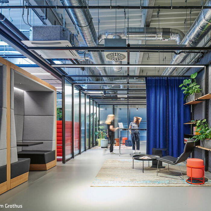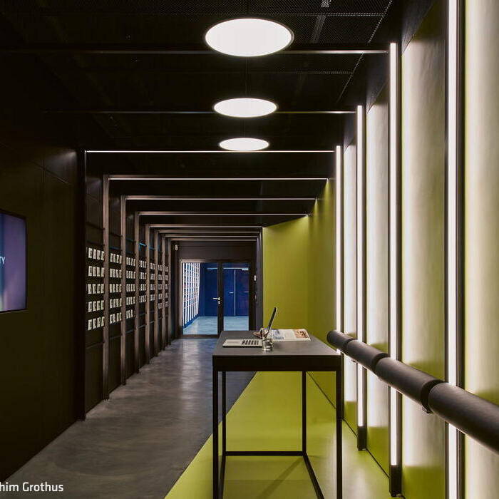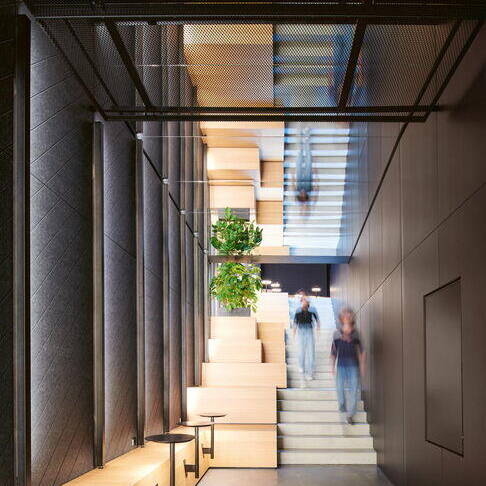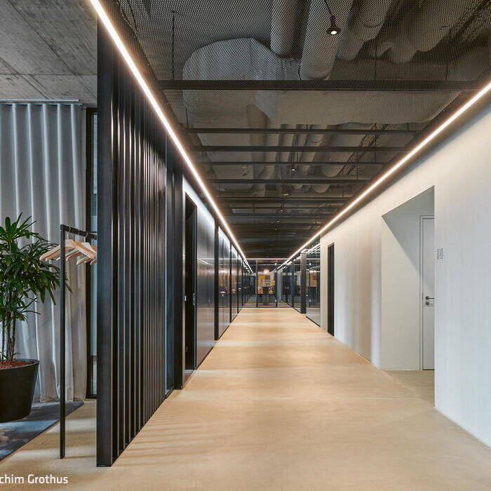 Das „One Roof“ erstreckt sich über drei Gebäude – von der historischen Weberei mit Sheddach bis zum modernen Rohbau – und über zwei Ebenen auf rund 4.200 m² Gesamtfläche. Die Aufgabe bestand darin, die unterschiedlichen Baukörper und Ebenen zielorientiert miteinander zu verflechten und eine intuitive räumliche Struktur zu erzeugen. Die Innenarchitekt:innen von blocher partners entwickelten eine hochwertige und kontrastreiche gestalterische Klammer nach dem Konzept eines Open Office. Hier entfalten sich die verschiedenen Abteilungen, die so angeordnet wurden, dass kurze Kommunikationswege und ein hohes Maß an Kollaboration möglich sind. Die Bereiche selbst sind an die jeweilige Arbeitsweise und Bedürfnisse angepasst, beispielsweise bei der Tischgestaltung, mit Fokusarbeitsplätzen und Besprechungsräumen. Zum Unternehmen gehören vierzehn Bereiche, die zwar unterschiedlichste Aufgaben mit sich bringen, bei dem sich jedes Team dennoch als Teil des großen Ganzen versteht. Hier arbeiten Softskill- und Hardware-Expert:innen gemeinsam daran, das Outlet-Business ständig neu zu definieren, um den Kund:innen ein außergewöhnliches Einkaufserlebnis zu bieten. Bereichsübergreifend wiederkehrende Elemente wie Teeküchen und Kommunikationsflächen fungieren als Teil der gestalterischen Klammer und verknüpfen die Bereiche. Ein Arkadengang wiederum verbindet die beiden Ebenen intuitiv wahrnehmbar miteinander.