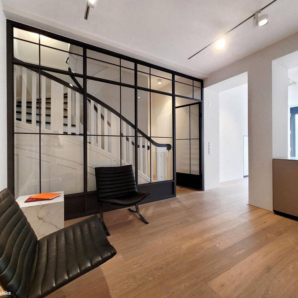 Als international tätiger Galerist und Kunstreisender hatte der Bauherr schon viel von der Welt gesehen – besonders in Erinnerung geblieben waren ihm und seiner Partnerin dabei ein Loft-Café mit transparenten Stahl-Glas-Wänden. Dieses fließende Raumerlebnis, das für das Paar zugleich Weltoffenheit und Internationalität ausdrückte, sollte zum Ausgangspunkt für den Umbau des Hauses werden. So sind auf allen drei Hauptetagen, aber auch in dem ausgebauten Gartengeschoss großzügige Räume entstanden, die ineinanderfließen und über durchgehende Blickachsen miteinander verbunden sind: Auf der im Hochparterre gelegenen Wohnetage schließt sich an das großzügige Entrée mit Holztreppe und Oberlicht ein offener Küchenbereich an. Andererseits wird von hier aus auch der Ess- und Wohnbereich erschlossen, der in einer durchgängigen Achse von der Straße bis zum Garten verläuft. Damit dieses offene Raumarrangement nutzbar ist und nicht zur Beeinträchtigung der Wohnqualität führt, sind einzelne Bereiche – etwa die Wohnküche – durch jeweils raumhoch ausgeführte, volltransparente Stahl-Glas-Türanlagen flexibel separierbar. Die anthrazitfarbenen Glasprofile der Türanlage rahmen dabei die Blickperspektiven und setzen im Zusammenspiel mit weiteren Gestaltungselementen einen starken Kontrast zu den hell gefassten Wänden und Decken. Aber auch der weitläufige, parkartige Garten mit Rasenfläche und altem Baumbestand sollte im Zuge der Umbaumaßnahme stärker als bisher ins Haus geholt werden: Dies gelang, indem auf allen Etagen einige der gartenseitigen Fensteröffnungen vergrößert wurden. Zudem wurde eine neue elegante Balkonkonstruktion an die Rückseite angegliedert, um eine teilüberdachte Sonnenterrasse im Hochparterre und zugleich Balkone in den darüber liegenden Schlaf- und Arbeitszimmern entstehen zu lassen.