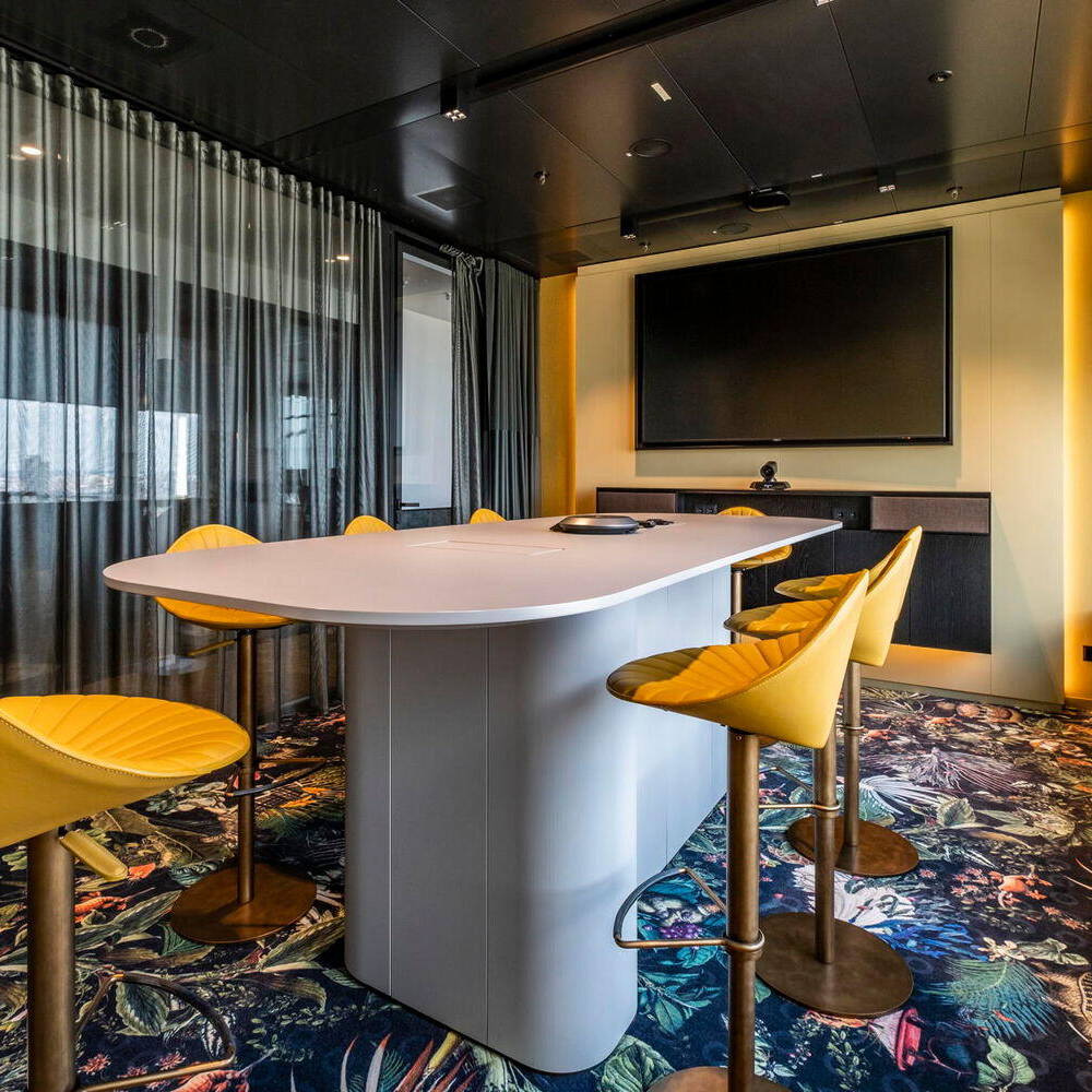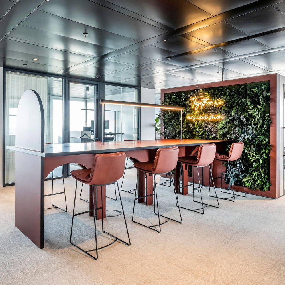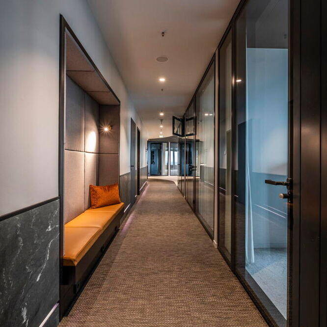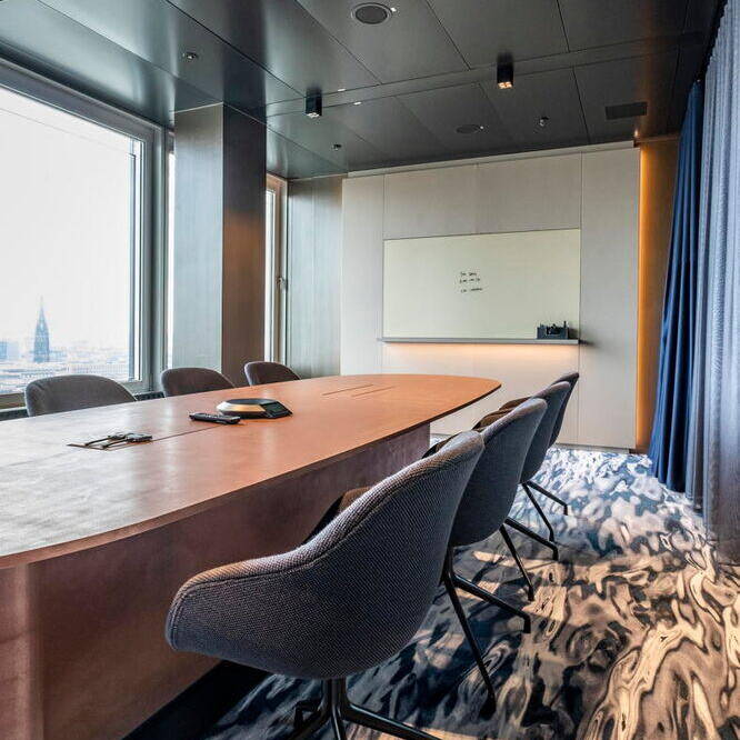 Das Planungsteam verfolgte ein ambitioniertes Ziel: die DGNB-Platin-Zertifizierung für Innenräume, die bislang weltweit nur wenige Büroprojekte erreichten. Grundlage war eine detaillierte Bestandsanalyse, die sowohl die architektonischen Gegebenheiten des denkmalgeschützten Hochhauses als auch die Anforderungen der künftigen Nutzer:innen berücksichtigte. Dabei ermöglichte der besondere Y-förmige Baukörper die Entwicklung vielseitiger Nutzungsszenarien auf 4.500 m² Fläche, die sich durch ein ausgewogenes Verhältnis zwischen offenen und geschlossenen Bereichen auszeichnet: Von Einzelbüros über Open-Space-Flächen, Think Tanks und Konferenzräumen bis hin zu Telefonboxen für konzentriertes Arbeiten. Desksharing und hybrides Arbeiten sind integraler Bestandteil des Konzepts. Das Design schafft eine inspirierende Atmosphäre. Jeder der drei Gebäudeflügel erhielt seine eigene gestalterische Handschrift, die sich in Materialwahl, Farbgebung und Möblierung widerspiegelt und sowohl visuelle Abwechslung als auch klare Orientierung innerhalb der Etagen bietet.