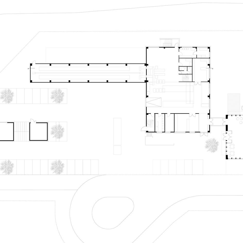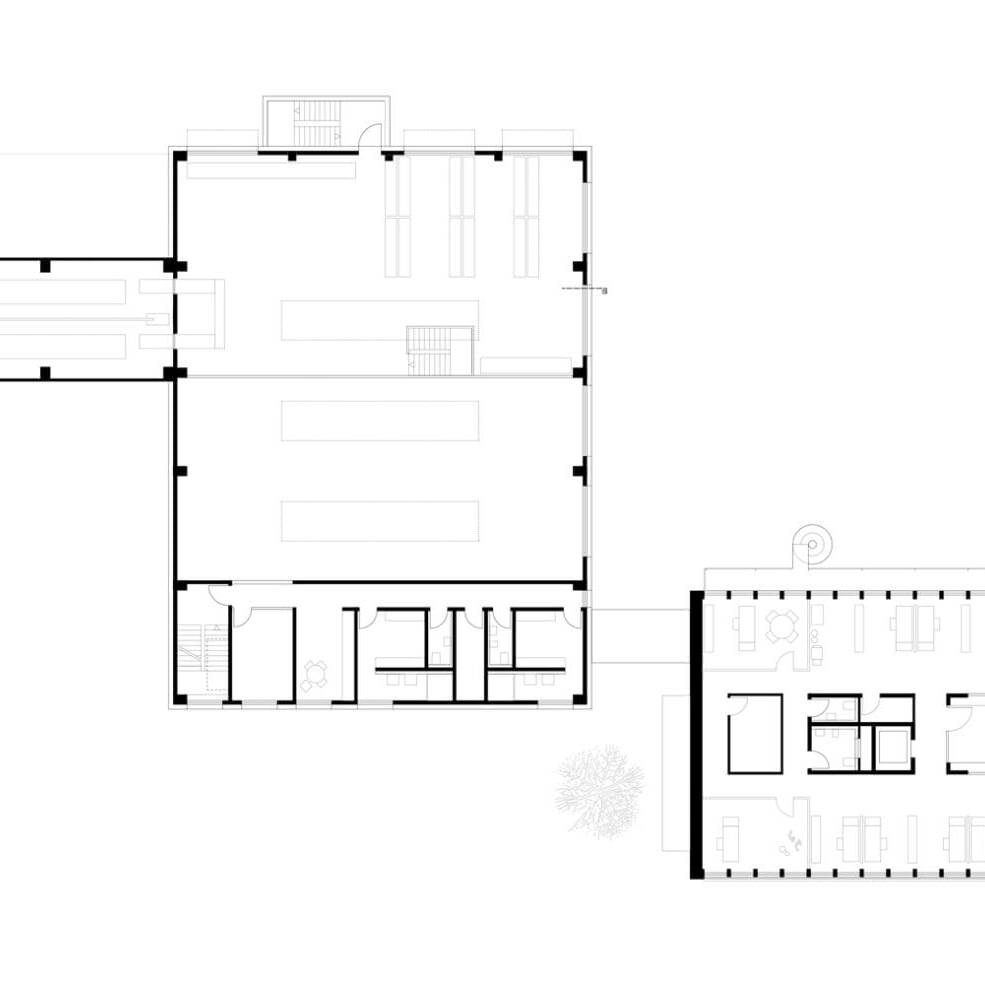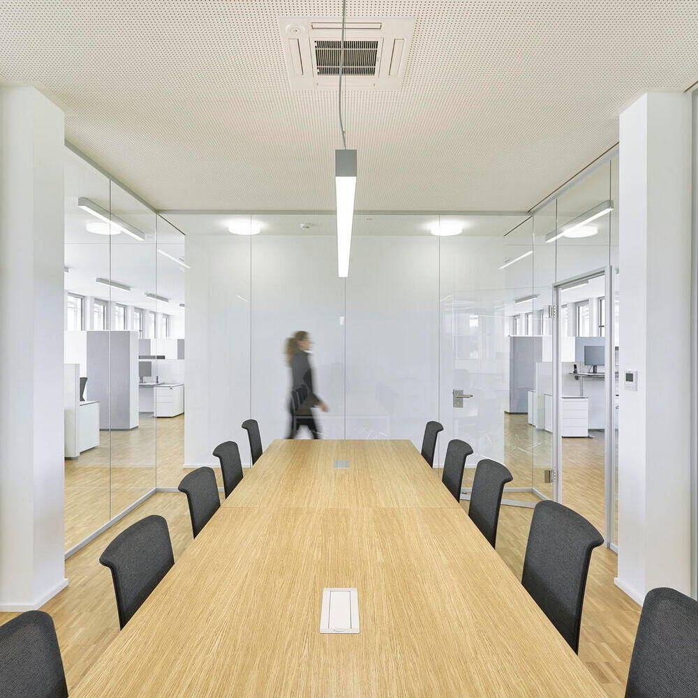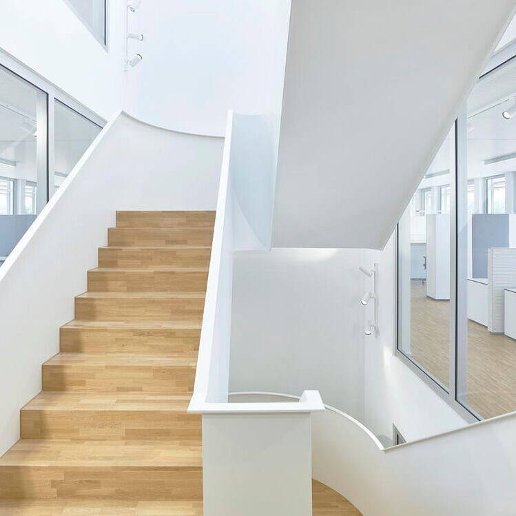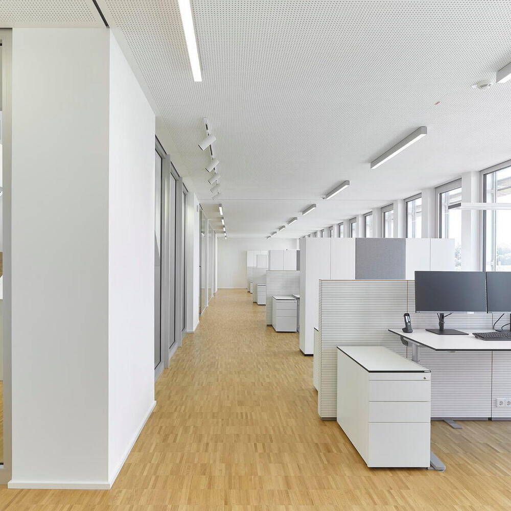 Die Verwaltungsbereiche sind überwiegend in Großraumbüros und ergänzenden Einzelbüros umgesetzt. Im Erdgeschoss befinden sich die Büros der Geschäftsleitung mit anschließender Terrasse im Garten. Über Terrassen und Balkone können auch die Mitarbeitenden von ihren Büros ins Freie gehen. Die meisten bodentiefen Fenster sind öffenbar und bringen viel Tageslicht in die Arbeitsbereiche. In Hof und Garten wurden verschiedene Pausenbereich integriert. Im Inneren steht allen Mitarbeitenden ein Fitnessraum und im Erdgeschoss eine Cafeteria mit Terrasse sowie Teeküchen und Aufenthaltsbereichen zur Verfügung. Für die Betreuung ihrer Kinder können die Beschäftigten den „Kids-Room“ nutzen.