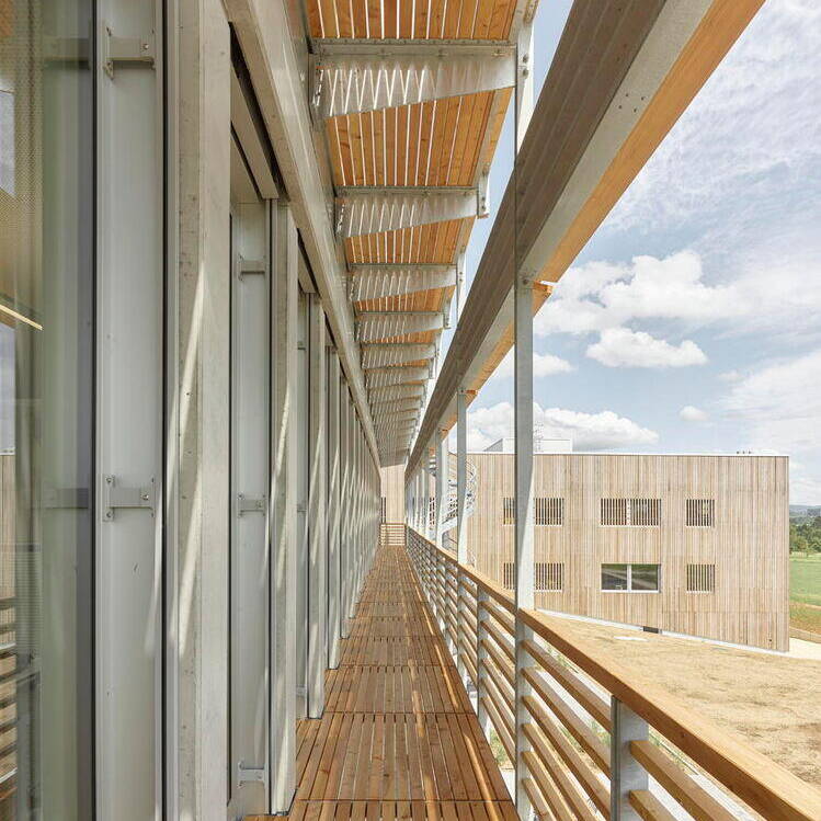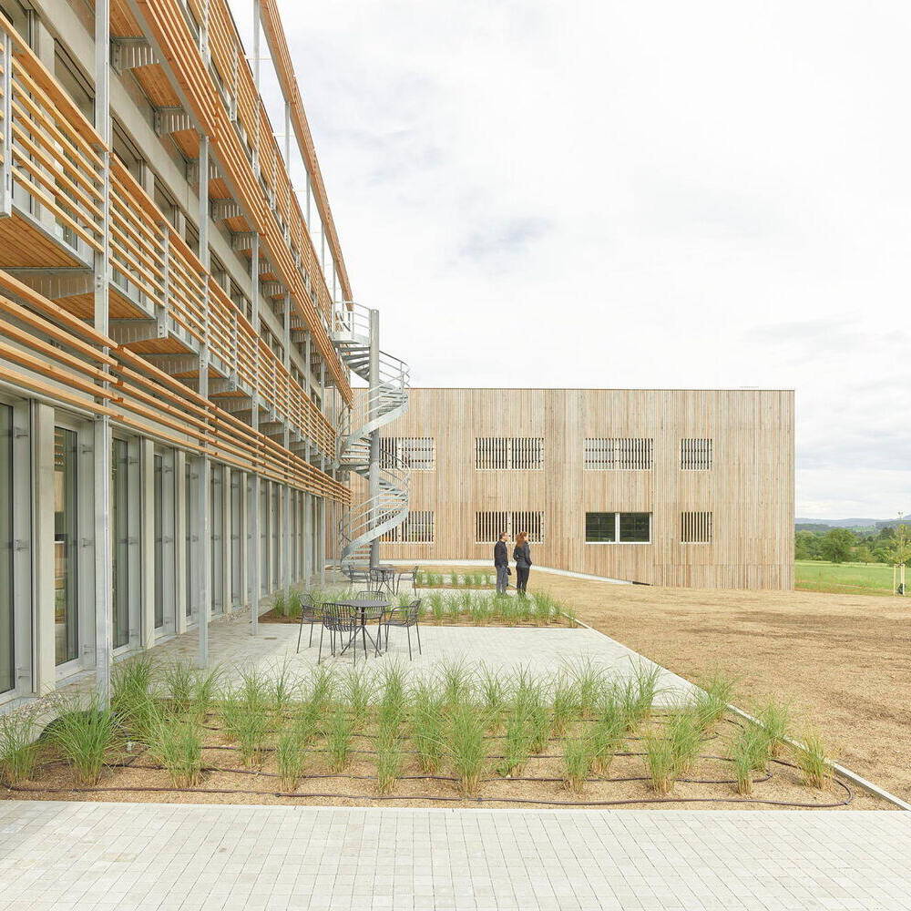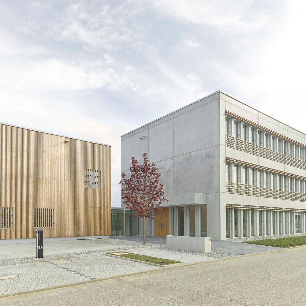 Das Architekturbüro Offterdinger entwickelte eine klare Struktur aus drei gestaffelten Hauptbaukörpern, die die Bereiche Verwaltung, Logistik und automatisches Kleinteilelager aufnehmen. Ausgeführt in Beton, Holz und Aluminium, kombiniert mit einem nachhaltigen Energiekonzept, erreicht das Produktions- und Verwaltungsgebäude den geförderten KfW 40-Standard. Dabei sorgt Erdwärme sowohl für die Heizung als auch die Kühlung über Heiz-/Kühldecken und Betonkernaktivierung. Die Lüftungsanlagen arbeiten mit Wärmerückgewinnung und die Photovoltaikanlage auf dem Flachdach liefert den benötigten Strom – auch für die acht Ladestationen für E-Autos. Ansonsten sind die Dachflächen begrünt. Die PV-Anlage versorgt auch die Oxy-Reduct-Anlage, die durch Reduzierung von Sauerstoff im vollautomatischen Hochregallager hilft, Brände zu vermeiden.