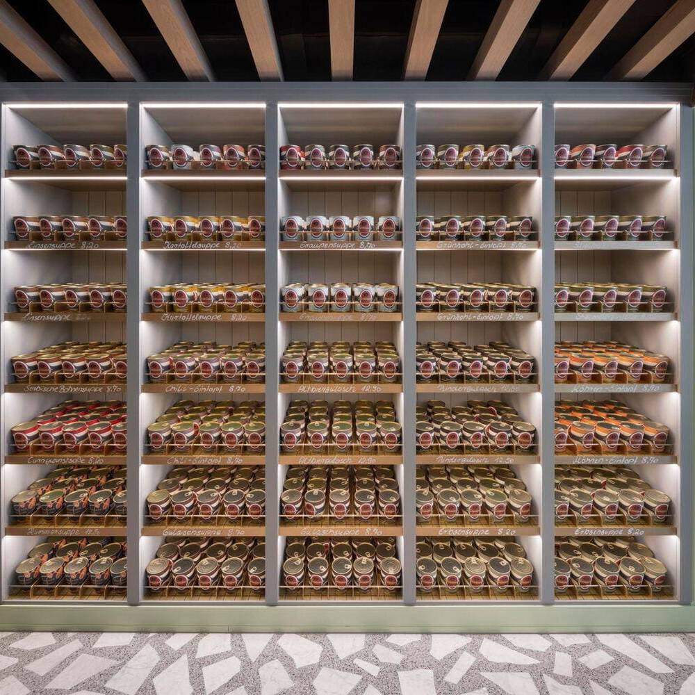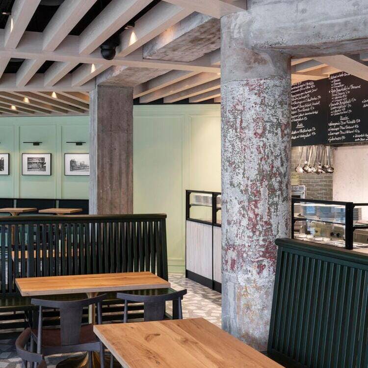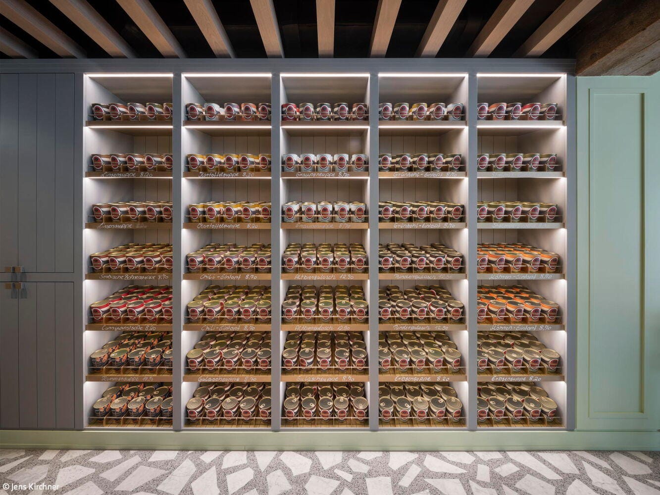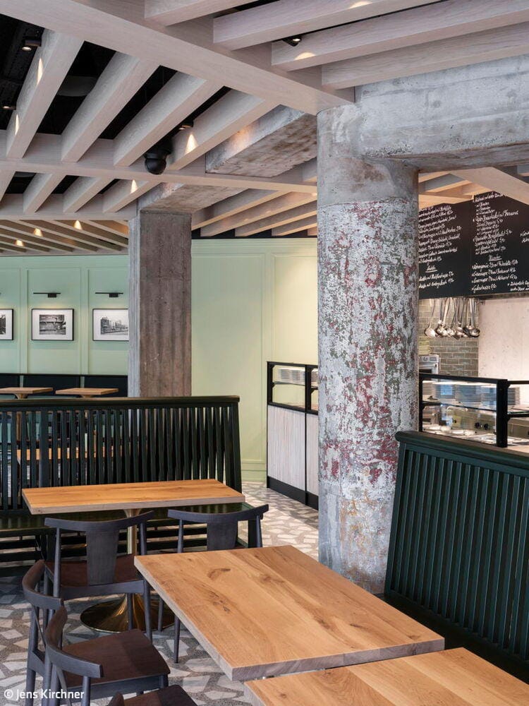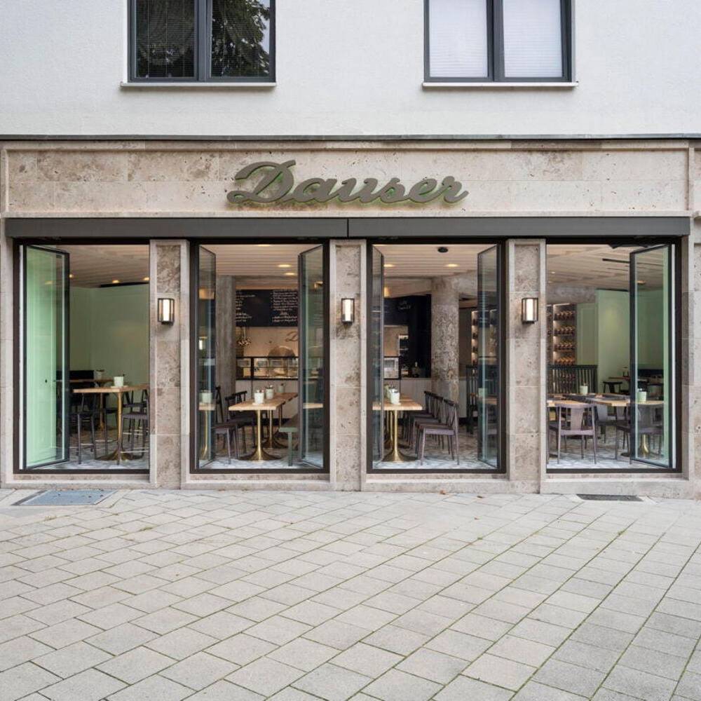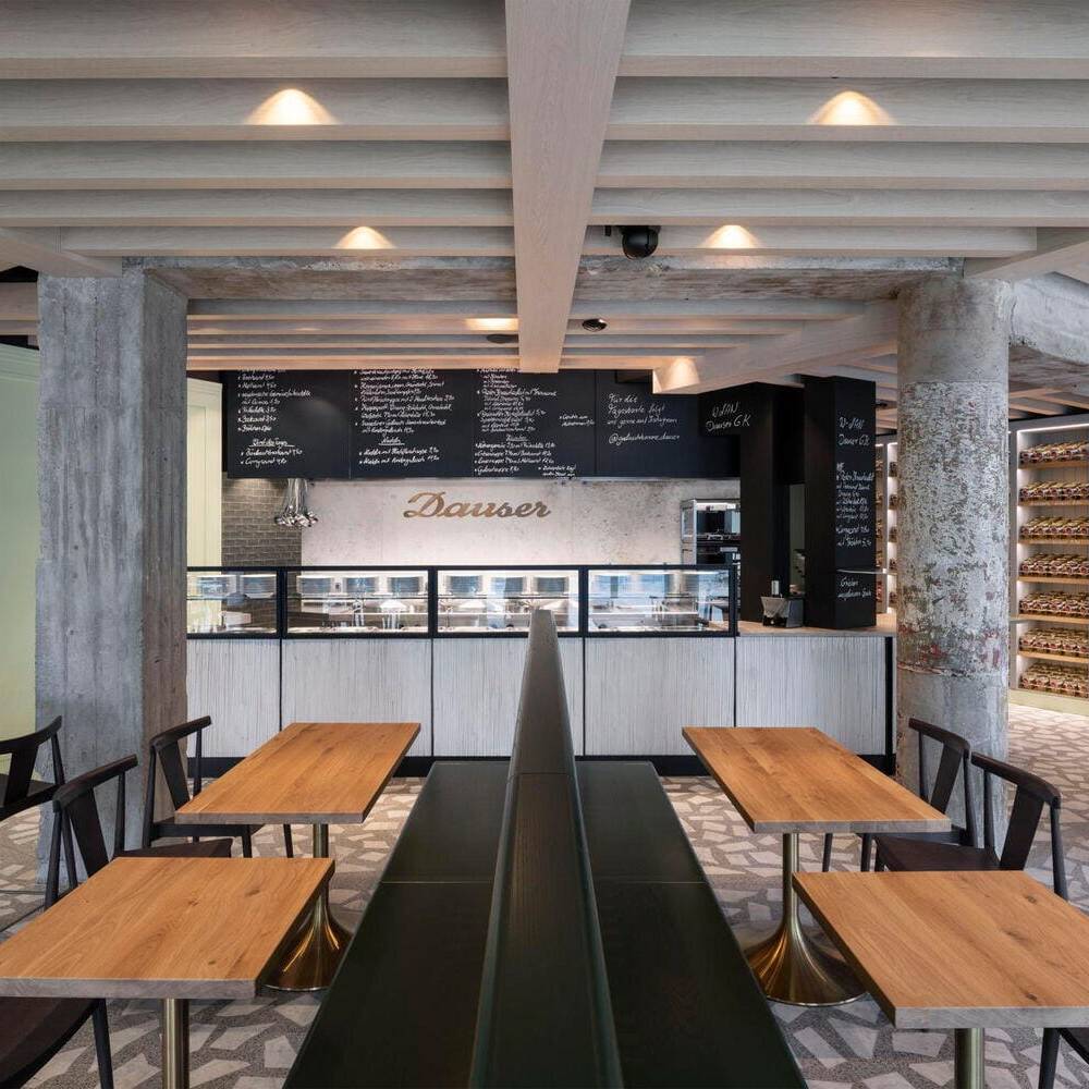 Der Kontakt zwischen Bauherr und Architekt entstand über ein Restaurant, das vor einigen Jahren in der Düsseldorfer Carlstadt eröffnete: Das Grande Étoile, bekannt für sein handwerklich gefertigtes Art-Déco-Intérieur und den sinnlich erfahrbaren Erlebnischarakter der gastronomischen Marke, wurde von Jürgen Geiselhart gestaltet und zählt zu den Stammlokalen von Geschäftsführer und Inhaber Christian Dauser. „Genau sowas möchte ich haben“, lautete daher sein ausdrücklicher Wunsch und Auftrag. Das Ladenlokal, das dafür im Erdgeschoss eines Mehrfamilienhauses aus den fünfziger Jahren zur Verfügung stand, hatte über viele Jahre das bekannte Restaurant „Robert’s Bistro“ beheimatet, war aber auch vorher seit Jahrzehnten Standort gastronomischer Betriebe gewesen. Dennoch mussten beim Ausbau die aktuell gültigen Vorschriften für Brand- und Schallschutz eingehalten werden. Besonders die Lüftungsanlage für den Gastraum und die offene Thekenausgabe stellten die Architekten vor große Herausforderungen: Aufgrund niedriger Raumhöhen konnten die Lüftungskanäle nicht unterhalb der Decken installiert werden, sondern mussten aufwendig in bis zu zwei Meter tiefen Stahlbetonschächten im Erdreich verlegt werden. Zum Leitmotiv der Gestaltung wird die Hausfarbe der Marke Dauser – ein heller Mintton, der mit weiteren Gestaltungselementen eine einzigartige Verschmelzung aus industriell anmutender Loft-Atmosphäre, elegantem Fifties-Style und modern interpretierter Brauhaus-Gemütlichkeit erzeugt. Wie in allen Dauser-Läden ist dabei der offene Gastraum durch den Ausgabetresen, die Sitzgelegenheiten zum Essen und die Verkaufsregale für die Konservenware des Unternehmens strukturiert. Passend zum Nachkriegsbaujahr des Gebäudes wurde ein handwerklich perfekt verlegter Terrazzoboden mit großen weißen Marmorbruchstücken gegossen, der so strapazierfähig ist, dass er auch dem Rollwagen standhält. Die Holzbalkendecke in hell gebeizter Eiche interpretiert die rustikale Brauhausdecke zeitgemäß und lässt zugleich die schwarze Technikdecke dezent zurücktreten, in der sich Lüftungsleitungen, Beleuchtung und Musikboxen verbergen. Kombiniert wird das mit traditionellen Wandpaneelen in Kassettenoptik, die ebenfalls in Mintgrün lackiert wurden. Das Verkaufsregal mit den Dosensuppen aus hauseigener Herstellung ist dazu als Einbau gefertigt worden – aus reibungsarmem Messingschichtstoff, der das automatische „Nachrücken“ der Ware ermöglicht. Die Ausgabetheke als zentraler Anlaufpunkt wird durch schwarze Stahlrahmen und Füllungen aus Reliefbeton besonders akzentuiert. Das schafft zugleich einen Bezug zu den dunklen Fensterrahmen in der neu gestalteten Travertinfassade, die dem Ladengeschäft auch von außen wieder Eleganz verleiht.