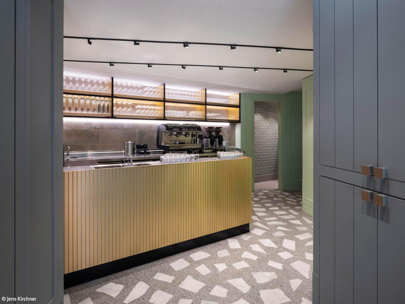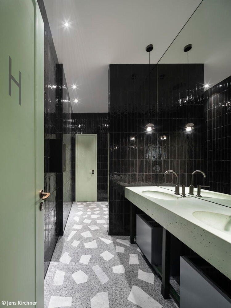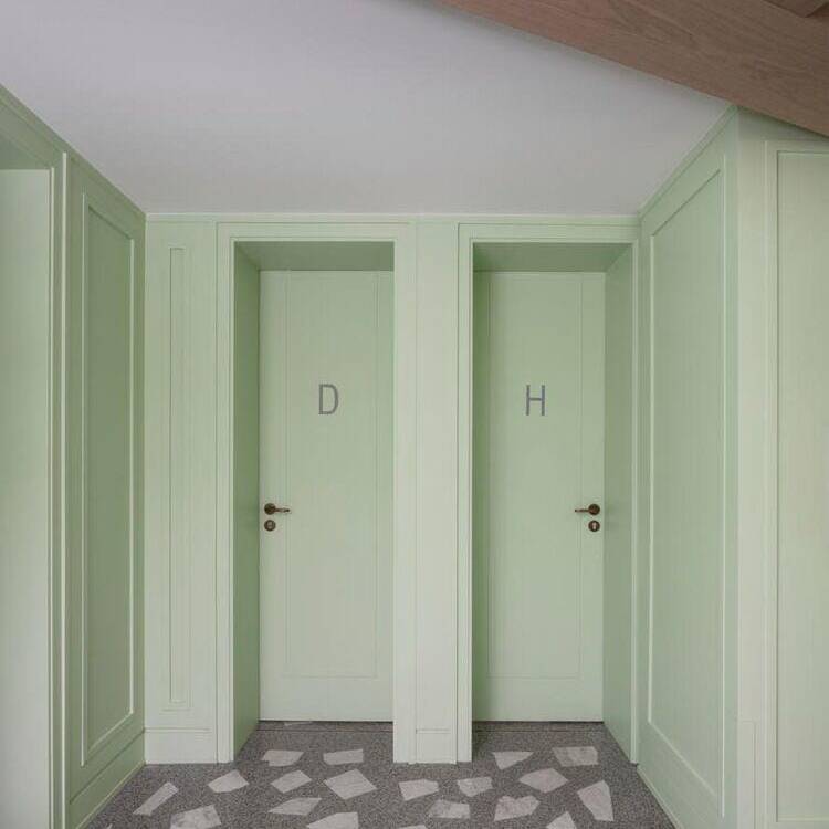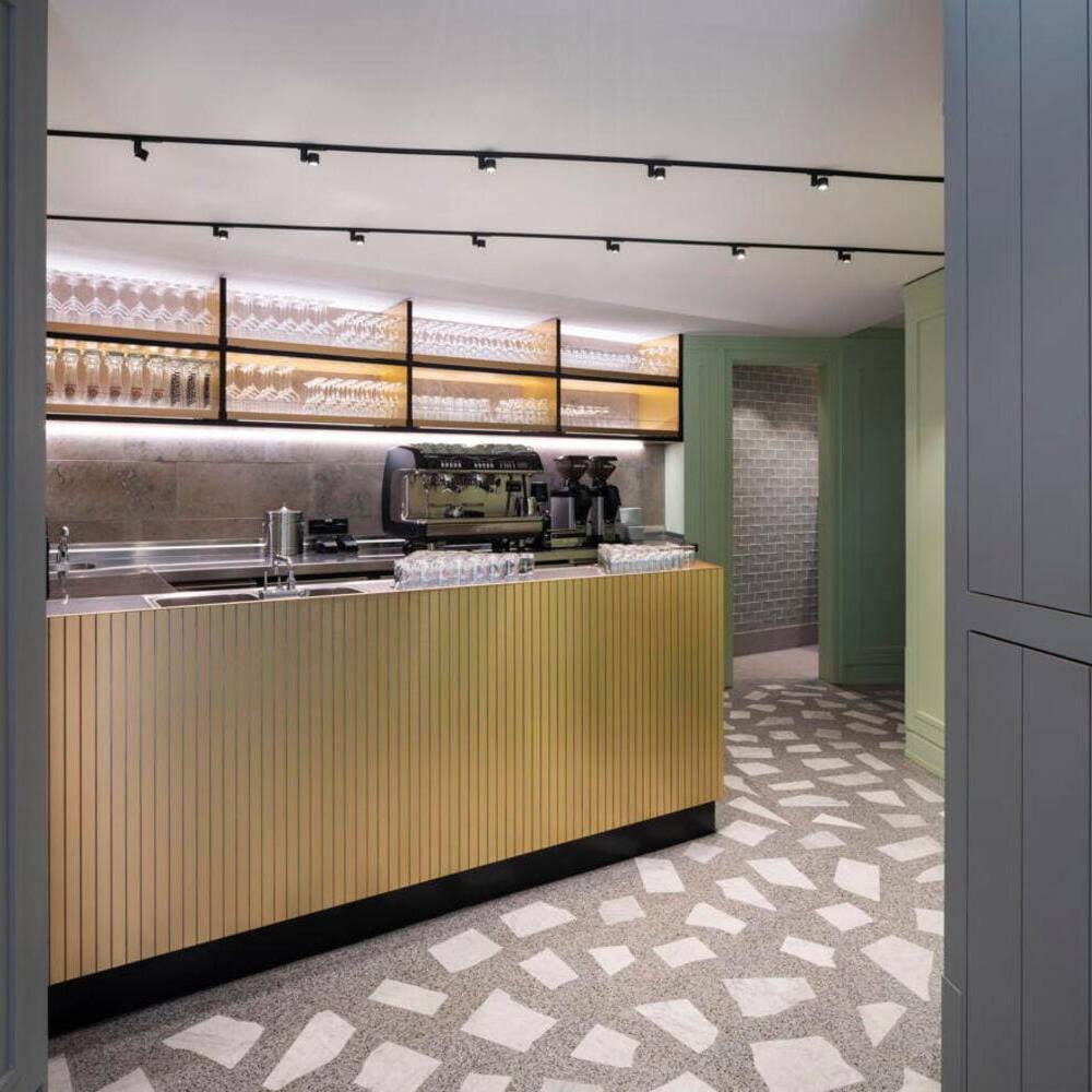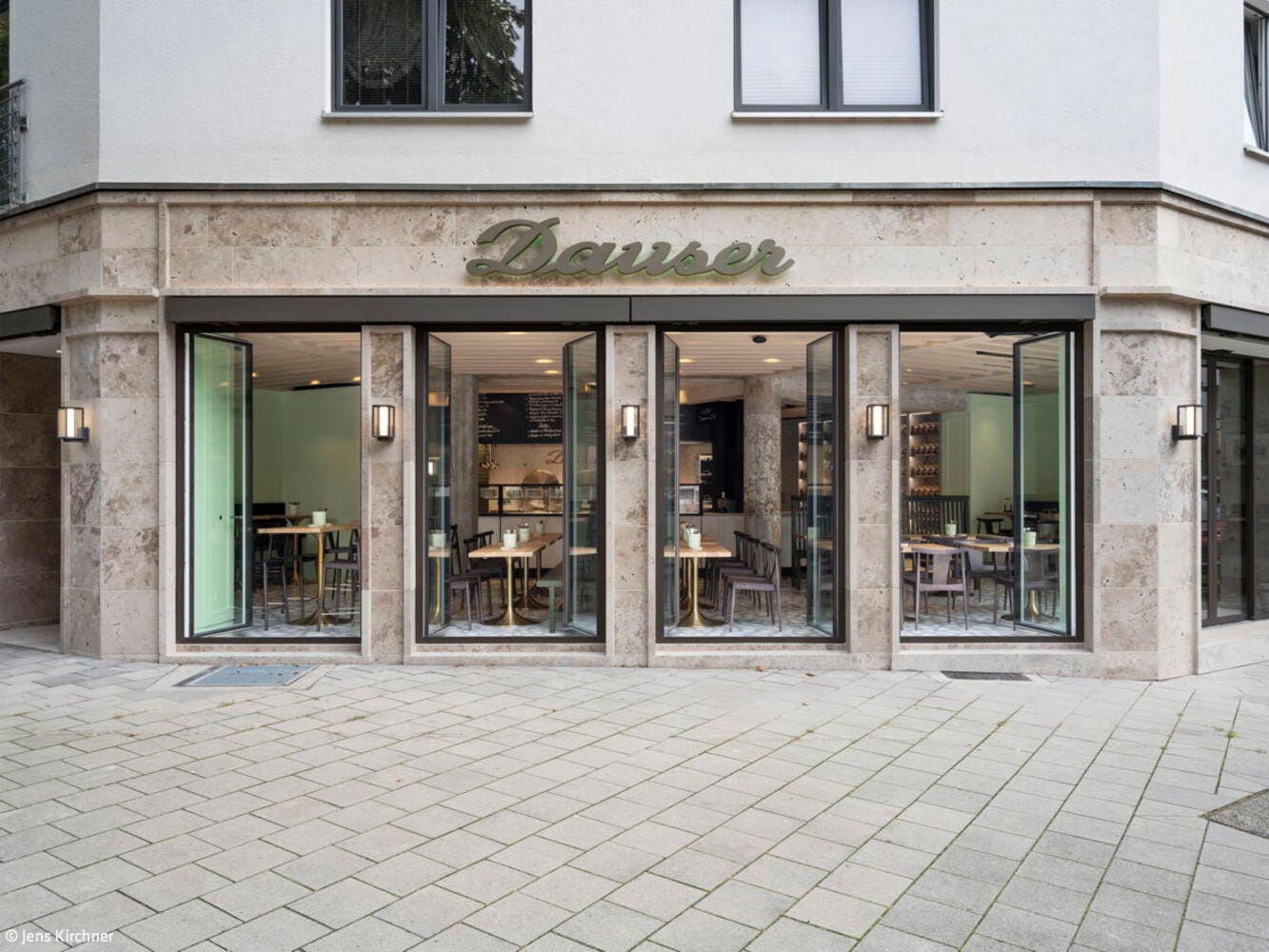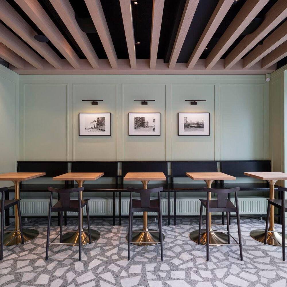 Der Kontakt zwischen Bauherr und Architekt entstand über ein Restaurant, das vor einigen Jahren in der Düsseldorfer Carlstadt eröffnete: Das Grande Étoile, bekannt für sein handwerklich gefertigtes Art-Déco-Intérieur und den sinnlich erfahrbaren Erlebnischarakter der gastronomischen Marke, wurde von Jürgen Geiselhart gestaltet und zählt zu den Stammlokalen von Geschäftsführer und Inhaber Christian Dauser. „Genau sowas möchte ich haben“, lautete daher sein ausdrücklicher Wunsch und Auftrag. Das Ladenlokal, das dafür im Erdgeschoss eines Mehrfamilienhauses aus den fünfziger Jahren zur Verfügung stand, hatte über viele Jahre das bekannte Restaurant „Robert’s Bistro“ beheimatet, war aber auch vorher seit Jahrzehnten Standort gastronomischer Betriebe gewesen. Dennoch mussten beim Ausbau die aktuell gültigen Vorschriften für Brand- und Schallschutz eingehalten werden. Besonders die Lüftungsanlage für den Gastraum und die offene Thekenausgabe stellten die Architekten vor große Herausforderungen: Aufgrund niedriger Raumhöhen konnten die Lüftungskanäle nicht unterhalb der Decken installiert werden, sondern mussten aufwendig in bis zu zwei Meter tiefen Stahlbetonschächten im Erdreich verlegt werden. Zum Leitmotiv der Gestaltung wird die Hausfarbe der Marke Dauser – ein heller Mintton, der mit weiteren Gestaltungselementen eine einzigartige Verschmelzung aus industriell anmutender Loft-Atmosphäre, elegantem Fifties-Style und modern interpretierter Brauhaus-Gemütlichkeit erzeugt. Wie in allen Dauser-Läden ist dabei der offene Gastraum durch den Ausgabetresen, die Sitzgelegenheiten zum Essen und die Verkaufsregale für die Konservenware des Unternehmens strukturiert. Passend zum Nachkriegsbaujahr des Gebäudes wurde ein handwerklich perfekt verlegter Terrazzoboden mit großen weißen Marmorbruchstücken gegossen, der so strapazierfähig ist, dass er auch dem Rollwagen standhält. Die Holzbalkendecke in hell gebeizter Eiche interpretiert die rustikale Brauhausdecke zeitgemäß und lässt zugleich die schwarze Technikdecke dezent zurücktreten, in der sich Lüftungsleitungen, Beleuchtung und Musikboxen verbergen. Kombiniert wird das mit traditionellen Wandpaneelen in Kassettenoptik, die ebenfalls in Mintgrün lackiert wurden. Das Verkaufsregal mit den Dosensuppen aus hauseigener Herstellung ist dazu als Einbau gefertigt worden – aus reibungsarmem Messingschichtstoff, der das automatische „Nachrücken“ der Ware ermöglicht. Die Ausgabetheke als zentraler Anlaufpunkt wird durch schwarze Stahlrahmen und Füllungen aus Reliefbeton besonders akzentuiert. Das schafft zugleich einen Bezug zu den dunklen Fensterrahmen in der neu gestalteten Travertinfassade, die dem Ladengeschäft auch von außen wieder Eleganz verleiht.