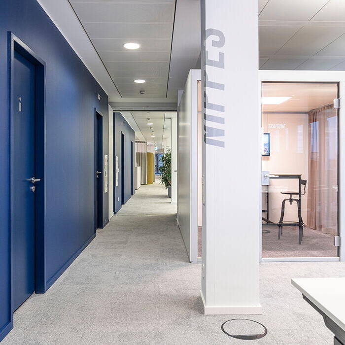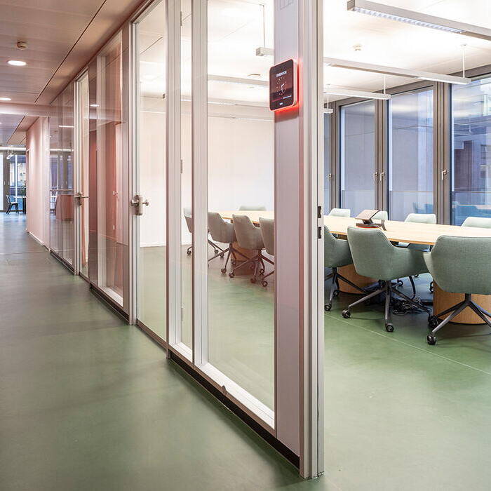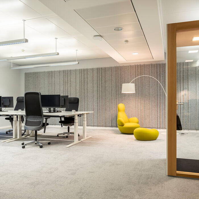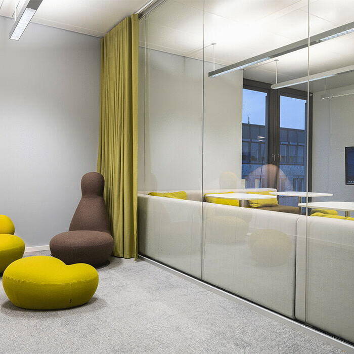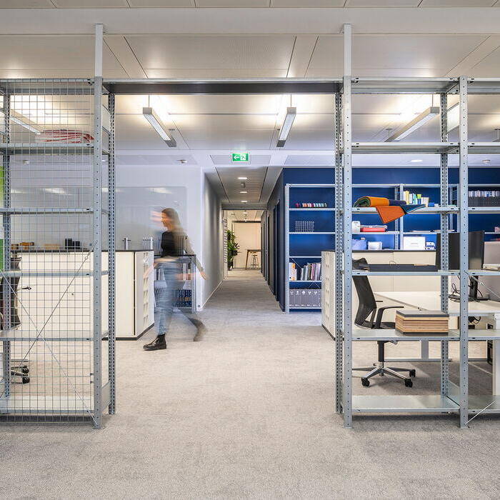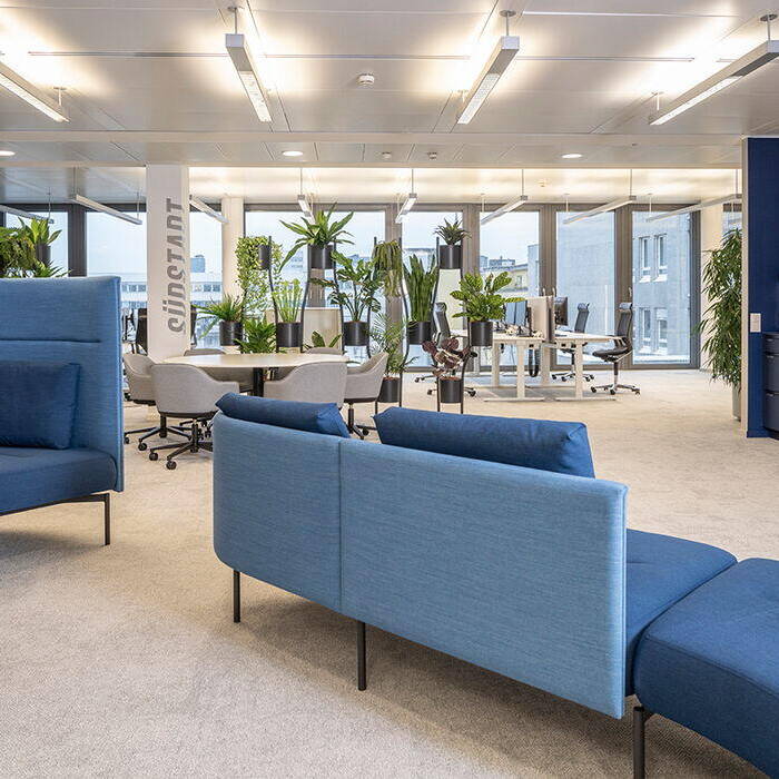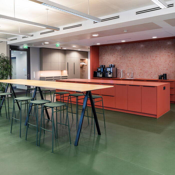 Ein internes, interdisziplinär aufgestelltes Projektmanagement- und Planungsteam hat im Laufe von elf Monaten bei laufendem Betrieb die Modernisierung der Flächen geplant und in der Umbauphase begleitet. Am Anfang stand dabei die Analyse des tatsächlichen Bedarfs an Arbeitsplätzen. Auf der Basis einer Mitarbeitenden-Befragung zu Arbeitsweisen sowie zum Mobilitätsverhalten wurde für die 260 Mitarbeiter:innen ein Bedarf von 130 Arbeitsplätzen ermittelt. Allein die Hälfte der neu gestalteten Bürofläche wurde dabei auf kollaboratives Arbeiten ausgelegt. Die Gestaltungsidee des neuen Office ist dabei von einer der Grundideen der Städteplanung inspiriert: Alles ist für alle da. „Angelehnt an das Konzept einer Stadt mit Nachbarschaften, in denen man sich geplant, aber auch zufällig treffen kann, ist unsere Arbeitswelt in vier Bereiche gegliedert“, erklärt die New Work-Expertin und Standortleiterin Daniela Schulze: Die Bereiche „Marktplatz“, „Stadtgarten“, „Büdchen“ und „Dom“ schaffen einen lokalen Bezug und spiegeln zugleich ihre jeweilige Nutzung wider: Auf dem Markplatz darf es lebhaft zugehen, der Dom ist dagegen für stilles und fokussiertes Arbeiten ausgelegt. Die lebhaften und öffentlichen Bereiche des Büros, in denen Kund:innen und Kooperationspartner zu Besuch kommen, befinden sich dagegen im Stadtgarten, wo die großzügigen Flächen für Kommunikation und Austausch sowie mehrere, flexibel nutzbare Besprechungsräume liegen – mit Aussicht über die Baumkronen des Habsburgerringes. Auf dem benachbarten Marktplatz befindet sich die zen-trale Küche mit diversen Sitz- und Loungeecken für Pausen und informelle Gespräche – hier mit Ausblick auf den Kölner Dom. Bei der Innenausstattung der neuen Büroflächen wurde getreu dem Motto „Wenig Abbruch, maximale Wiederverwendung“ verfahren. So kam ungenutztes Mobiliar aus anderen Standorten zum kreativen Wiedereinsatz. Für die Kreislauffähigkeit, Schadstofffreiheit und künftige einfache Demontierbarkeit des Interior Designs kam das sogenannte Cradle-to-Cradle-Prinzip zur Anwendung. Sowohl Mobiliar als auch Wand- und Bodenbeläge lassen sich weitestgehend bei einem späteren Gebäudeabriss in hoher Qualität wiederverwerten oder in einen biologischen Kreislauf zurückführen.