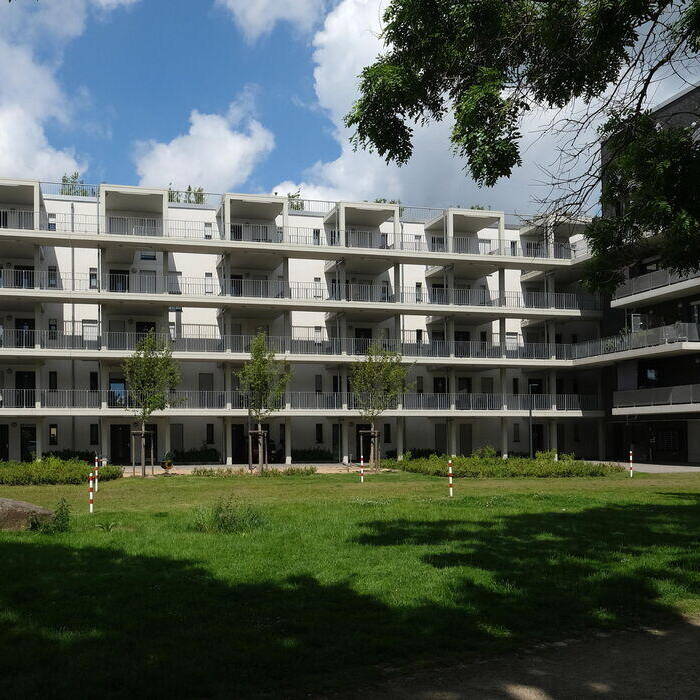 Das Bauprojekt „Ein Zuhause für alle an der Löbbeckestraße“ wurde für den Deutschen Bauherrenpreis in der Rubrik „Neubauten“ nominiert! Das Mehrfamilienhaus, das in einer Kooperation der Städtischen Wohnungsbau-Gruppe Düsseldorf (SWD) mit dem BDA Düsseldorf entstand, erstreckt sich über eine Gesamtlänge von 50 Metern und besteht aus einem langen Wohnriegel mit fünf Etagen sowie einem vorgebauten Wohnturm mit sechs Etagen. Große Fenster, Balkone und Terrassen sorgen dafür, dass das gesamte Gebäude offen und transparent wirkt. Zur offenen Gestaltung tragen auch die Laubengänge der einzelnen Etagen bei, über die man zu den Wohnungen gelangt.