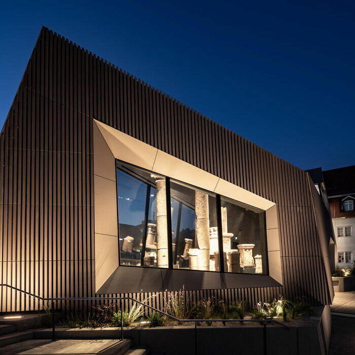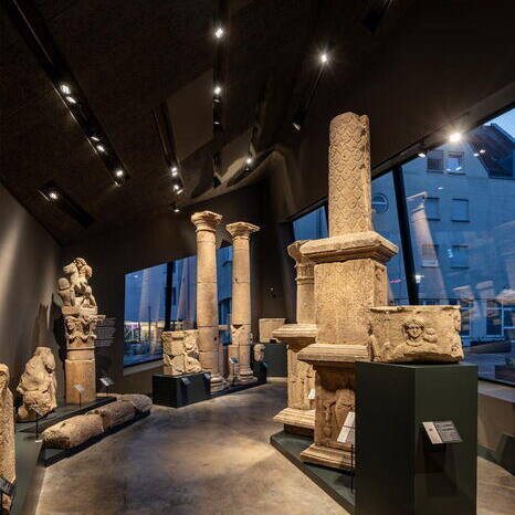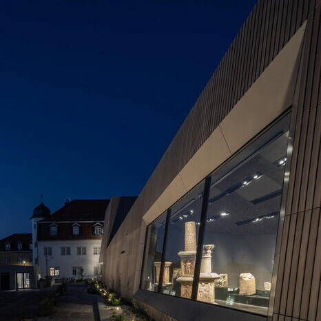 Die Konstruktion besteht aus zwei gekippten, jeweils einmal geknickten Wänden aus massivem Brettschichtholz. Die hinterlüftete Hülle, die aus quadratischen Keramikhohlelementen besteht, betont die plastische Form des Gebäudes. Fenster gewähren wohl kalkulierte Einblicke und wecken Neugier auf die Schätze im Inneren. In der Steinhalle führt der Weg entlang kultischer Steindenkmäler für römische und anverwandte, ursprünglich keltische und vorderasiatische Gottheiten bis zum Highlight: dem vom Tageslicht beleuchteten „Forum“, das mit Teilen von einst bis zu 12 Metern hohen Säulen des Jupiter geschmückt ist. Die Atmosphäre in der Steinhalle ist den Exponaten entsprechend nahezu sakral. Die schwarz gestrichenen Wände und die konische Form des Raums lassen an ein Gewölbe oder auch an ein Kirchenschiff denken. Der Bodenbelag, der sich vom Stäbchenparkett im Museum absetzt, betont die Atmosphäre. Der gegossene Beton ist dabei auch eine Anspielung auf das „Opus caementitium“ der Römer, wobei er durch Zuschlagsstoffe aus Rheinkies seine grau-braune, warme Farbe erhalten hat. Durch ihre besondere Form präsentiert die Steinhalle die kultischen Steindenkmäler nicht nur besonders effektvoll, mit dem Neubau erhält die Stadt einen neuen Platz, der die darunter liegende Tiefgarage vergessen lässt. Nachts schenken die großen Fenster übrigens Einblicke in eine geheimnisvolle Welt, erhellt vom stets kalkulierten Schein der einzelnen Strahler.