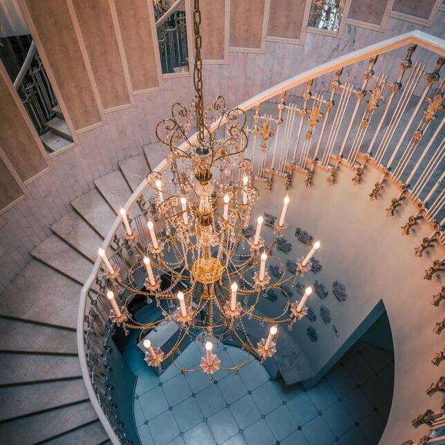 Den architektonischen Ausgangspunkt bildete der große Speisesaal: Historisches Dekor mit weißen Gusseisen-Elementen forderte eine stilistisch passende, aber zugleich frische Interpretation klassischer Formen. Die Wahl fiel auf die Leuchtenserie Vela – eine Kollektion, die klassische Luster in eine zeitgemäße Formensprache überführt. Im „Tavaduri“ wurden die schwungvollen Kronleuchter zusätzlich mit cremefarbenen Organzaschirmen ausgestattet, wodurch ein sanftes, warmes Licht entsteht, das die Atmosphäre des Raums stimmungsvoll unterstreicht. Ein weiteres Highlight bildet die prachtvolle Wendeltreppe im Hotelbereich, die mit einem opulenten Großluster und mehrflammigen Wandleuchten der Serie Katharina akzentuiert wurde. Die Leuchten mit vornehmer Messingfassung und 24-Karat-Vergoldung greifen die majestätische Wirkung der Treppe auf und verleihen ihr zusätzliche Strahlkraft. Auch in den Hotelzimmern setzt sich die hochwertige Lichtgestaltung fort: Hier sorgen Kristallleuchten der Serie Design by Orion: Kristalldesign in verschiedenen Varianten für eine individuelle Note. Die Auswahl der Leuchten verleiht jedem Bereich – vom Gastraum über die Hotellobby bis hin zu den privaten Rückzugsorten – eine klare Identität. Die Gesamtumsetzung ist ein gelungenes Zusammenspiel aus Licht, Raum und Atmosphäre.