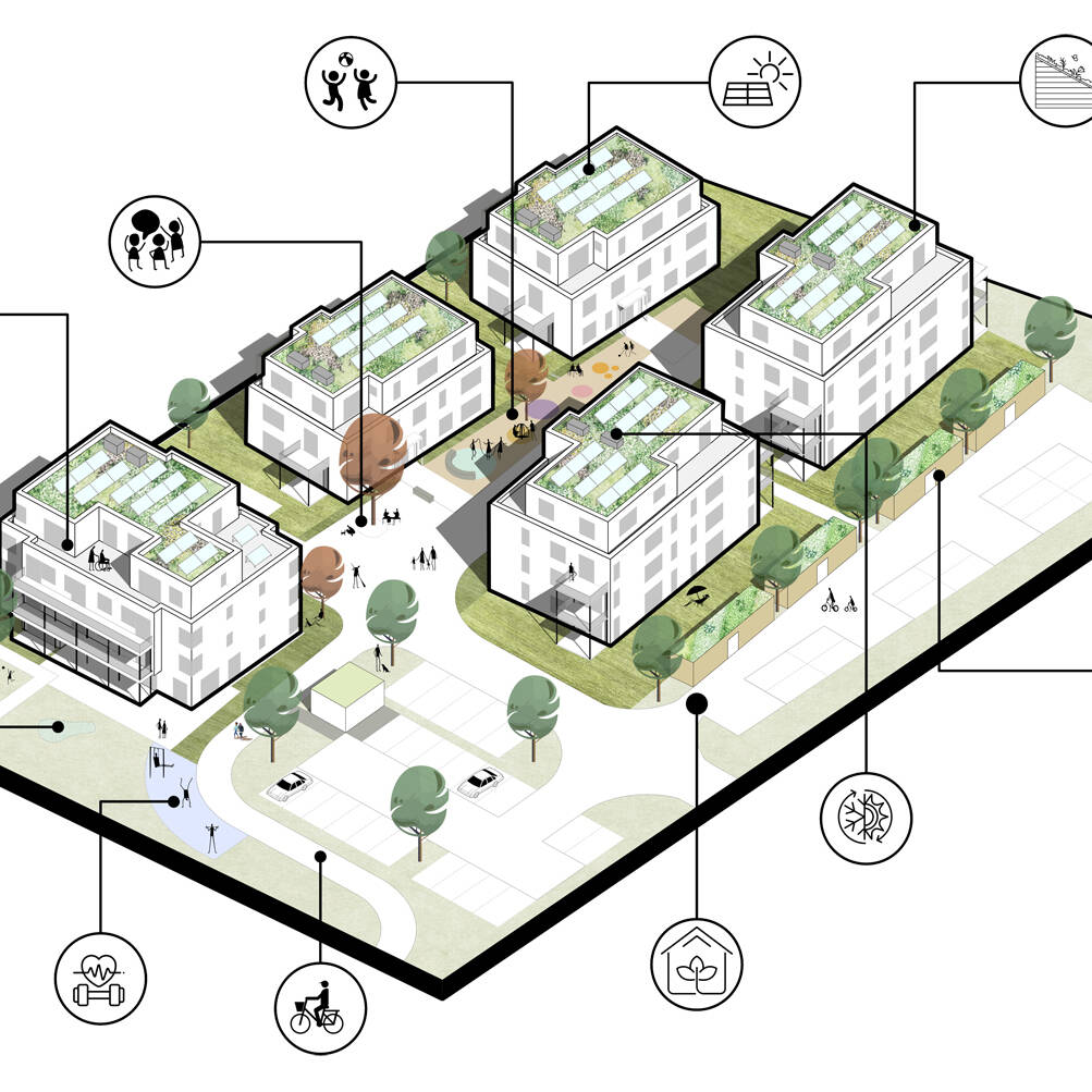 Eine weitere Besonderheit liegt in der hohen Energieeffizienz des Quartiers. Mit Hilfe eines monolithischen Mauerwerks wird der Effizienzhausstandard 40 erreicht, der zugleich die strengen Kriterien des Passivhaus-Standards erfüllt. Das Energiekonzept vereint Photovoltaikanlagen mit Luft-Wasser-Wärmepumpen sowie Lüftungsanlagen mit hervorragender Wärmerückgewinnung. Gekoppelt an ein intelligentes Mieterstrom-Modell können die Bewohner:innen so unmittelbar von dem erzeugten Strom profitieren. Die Infrastruktur des Quartiers stärkt zudem nachhaltige Mobilität: Fahrradwege und -stellplätze, gemeinschaftliches Car-Sharing und die vollständig autofreie Erschließung des Quartiers leisten langfristig einen Beitrag zur Klimaverbesserung.