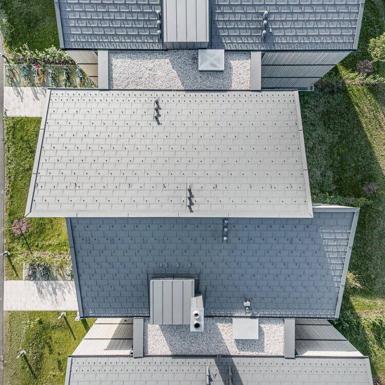 Dieser gelungene Entwurf einer Wohnsiedlung stammt von WWA Architekten Wöhr Heugenhauser Johansen PartmbB aus München. Für Architekt Gerold Heugenhauser war vor allem der soziale Aspekt des Projekts von großer Bedeutung. Die Gemeinde Utting hat mit der geförderten Wohnanlage bezahlbaren Wohnraum für die Bewohner:innen des Ortes geschaffen. Bis auf die Erschließungskerne, die in Stahlbeton ausgeführt wurden, besteht die restliche Konstruktion aus Holz. Die Suche nach einem geeigneten Partner für die Dächer führte zu einem Hersteller von Aluminiumdachsystemen. Deren Aluminium-„Ziegel“ sind äußerst ausgeklügelt und mit Fokus auf Umweltschutz und Nachhaltigkeit gefertigt. Der Kreislaufwirtschaft kommt zugute, dass Aluminium fast zu hundert Prozent wiederverwertbar ist. Auf der riesigen Dachfläche von 2.460 m² konnten die Handwerker von Haus zu Haus Erfahrungen für die Optimierung der Montage sammeln und es konnte über das gesamte Jahr hinweg gearbeitet werden, da dank des Materials keine Rücksicht auf Witterungseinflüsse genommen werden musste. Als Bauherr fungiert das Kommunalunternehmen Utting am Ammersee. Die Wohnungen sind Menschen mit niedrigem oder mittlerem Einkommen vorbehalten, die in Utting wohnen oder arbeiten. Das vorbildliche neue Wohnensemble wurde in nur zwei Jahren und in fünf Bauabschnitten geschaffen.
