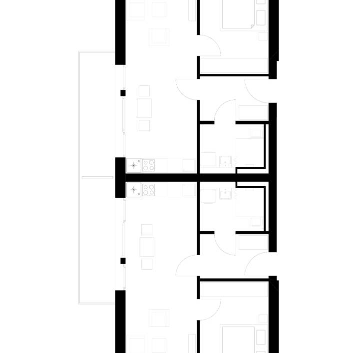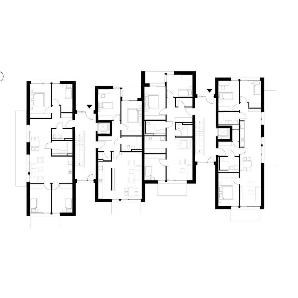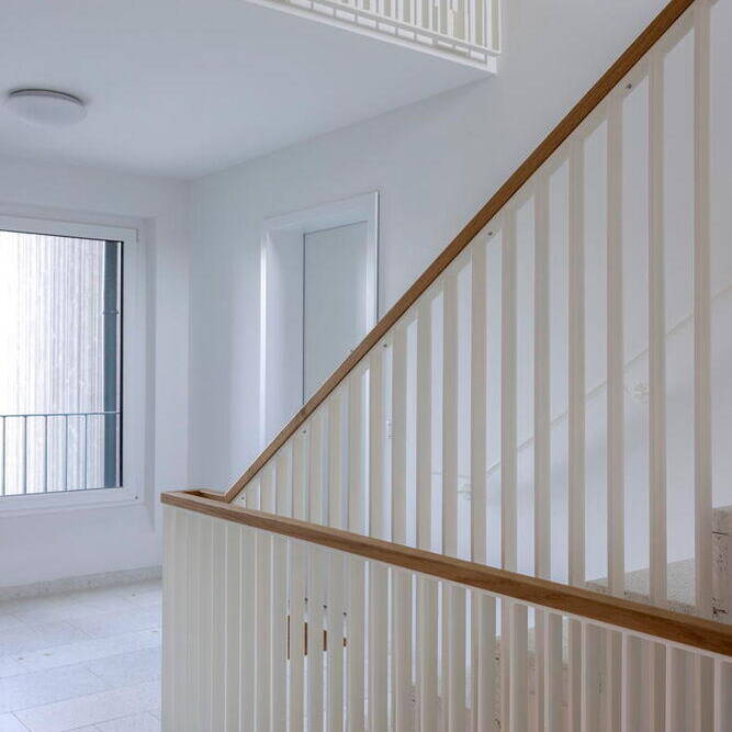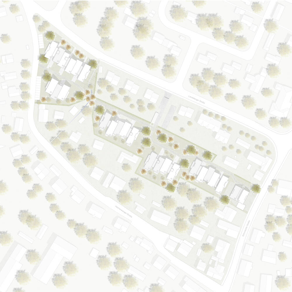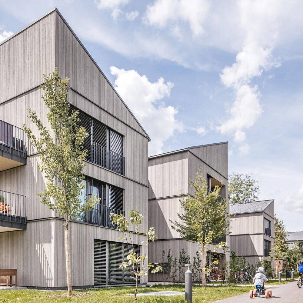 Mit der beachtlichen Länge von 300 Metern erstreckt sich eine neue Siedlung mitten im schönen, teilweise fast noch dörflich anmutenden Utting am Ammersee von Ost nach West. Insgesamt entstanden hier auf dem „Schmucker-Areal“ 25 zwei- und dreigeschossige, schlanke Wohnhäuser, erbaut in Hybridbauweise auf einem Baugrund von 13.000 m² in sechs Häusergruppen und mit 9.000 m² Geschossfläche, verteilt auf 88 barrierefreie Wohnungen. Was sich fast monumental anhört, ist in Wirklichkeit nahezu unauffällig: Die einzelnen Häuser sind geschickt ineinander und gegeneinander verschoben, sodass die Größe des Bauvolumens gar nicht auffällt. Entscheidender Grund hierfür sind die Pultdächer der Häuser. Diese Dachform ist platzsparend, kragt sie doch nicht nach beiden Seiten aus, sodass sich die Häuser sozusagen ineinander schieben lassen. Auch das Äußere ist so gewählt, dass es nicht um Aufmerksamkeit heischt: Das zurückhaltende Farbkonzept der mit einer vorvergrauten Fichtenlattung verkleideten Häuser, plus den dunkelgrauen Dachziegeln, verleihen der Anlage farblich ein einheitlich zurückhaltendes Aussehen; und die umgebende Vegetation, sowie die dörflichen Bestandshäuser ringsum lassen das Ensemble ganzheitlich und integriert erscheinen. Großflächige Fenster und ebensolche Balkone erhöhen zusätzlich den Wohnkomfort für die Bewohner:innen.