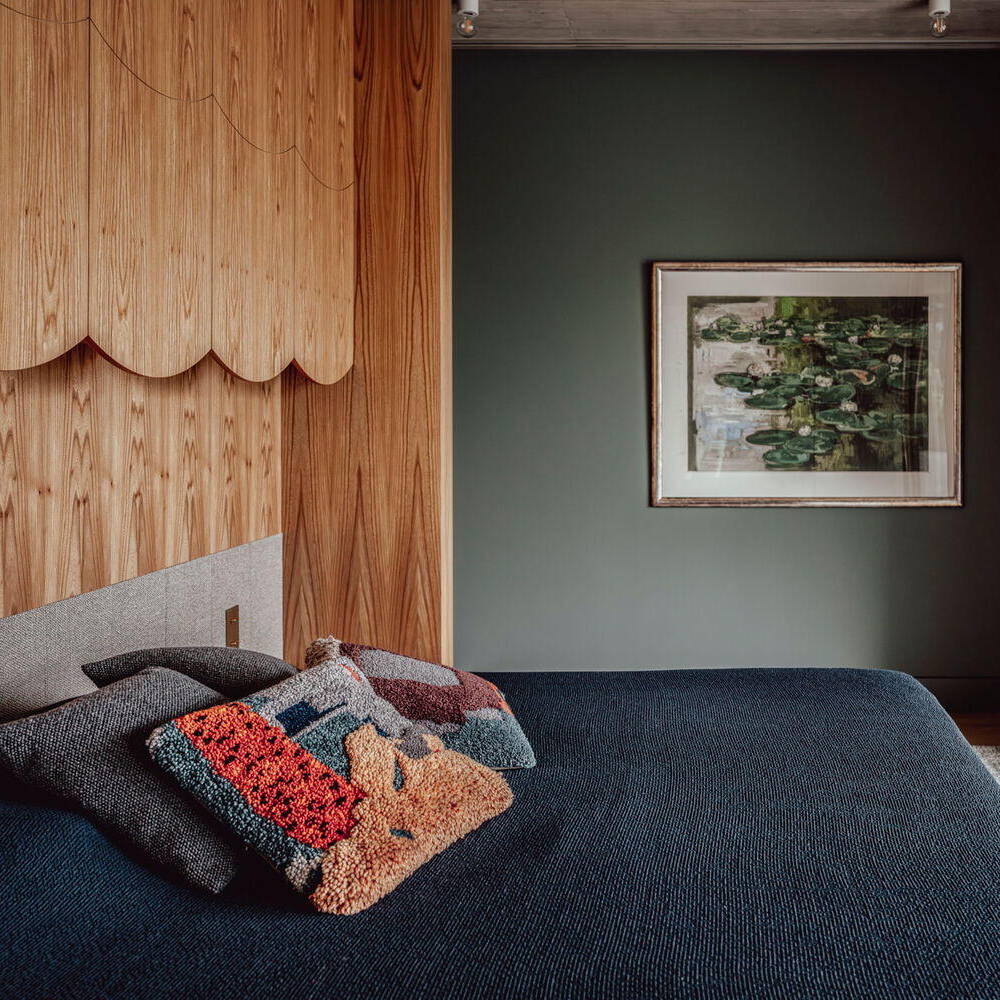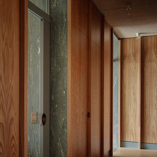 Zum Einsatz kamen unterschiedliche Holzarten, maßgeschneiderte Stoffe und hochwertige Naturmaterialien, die eine warme und luxuriöse Atmosphäre schaffen. Besonders die Kombination von strukturierten und glatten Oberflächen spielte eine große Rolle, um Tiefe und Eleganz in die Räume zu bringen.