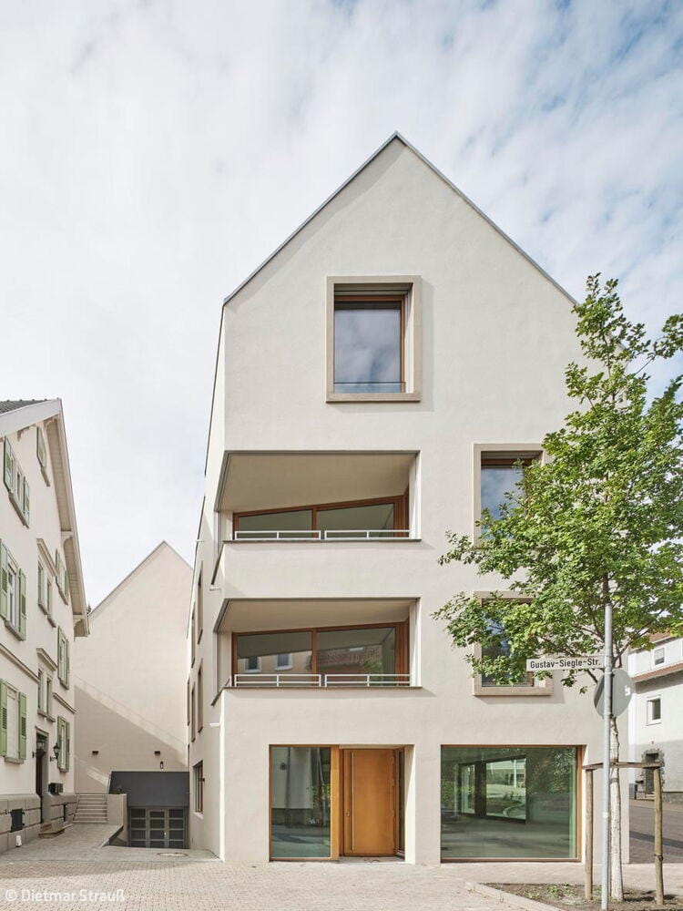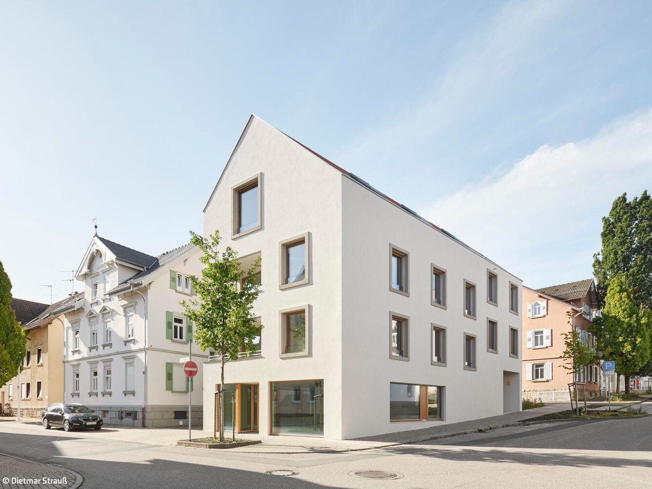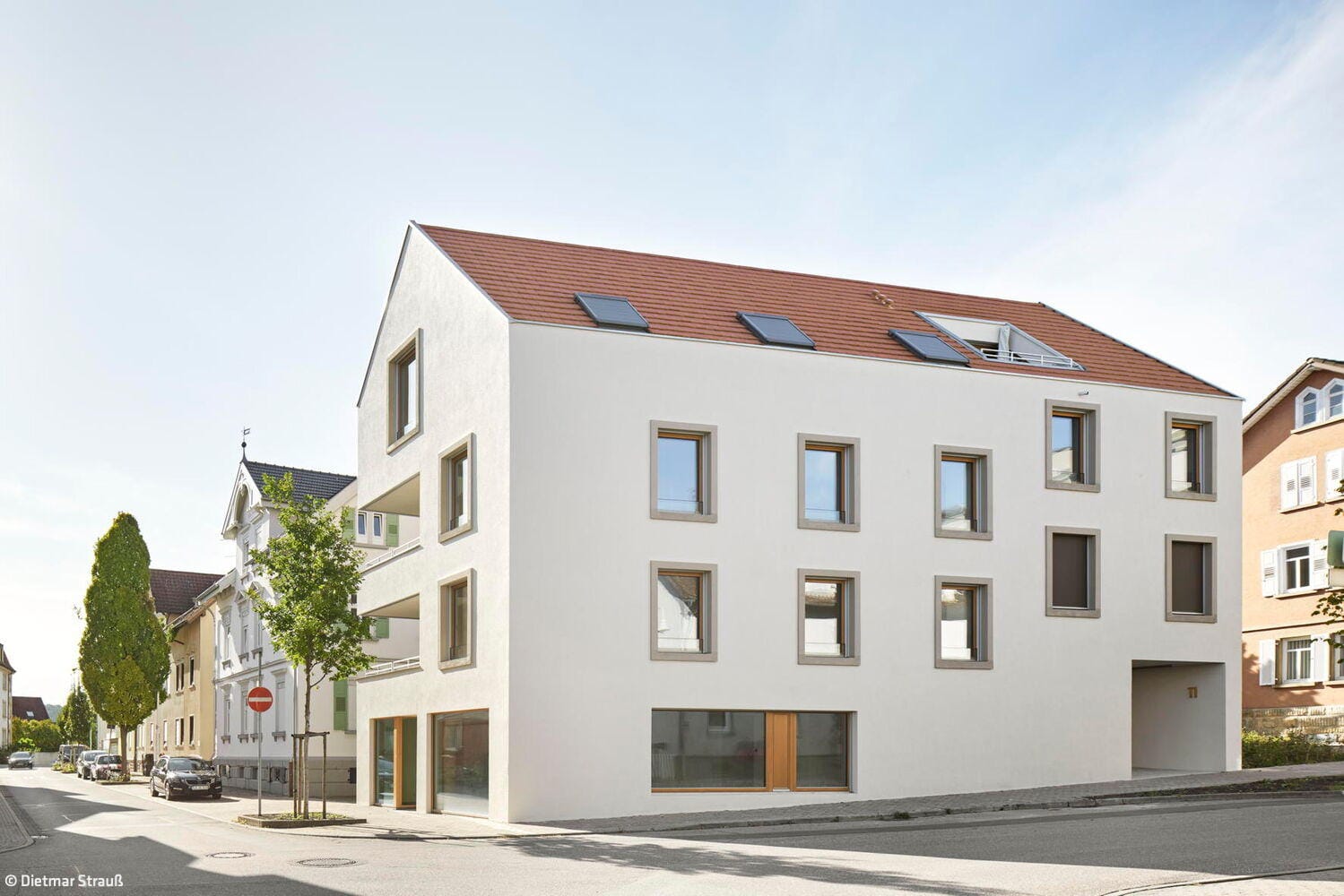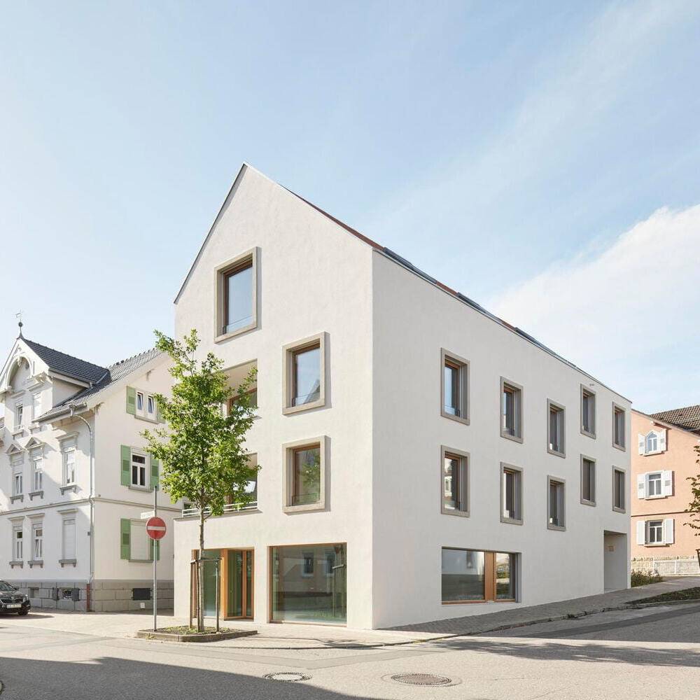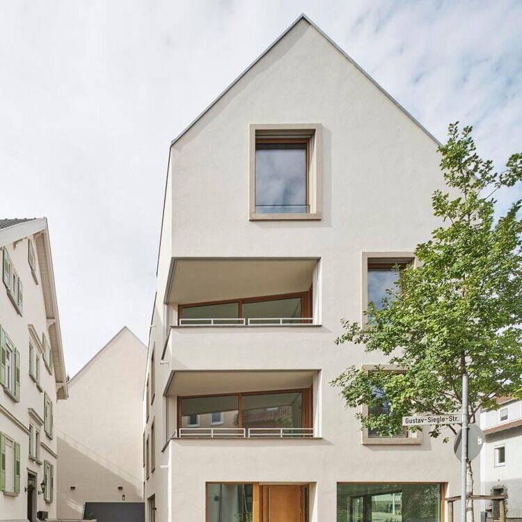 Der zweite Siedlungsring in Besigheim zeichnet sich durch engen Bezug zur historischen Kernstadt und die Nähe zum Bahnhof aus, was ihn besonders attraktiv macht. In einem Eckbereich galt es, den Blockrand zu schließen und die Architektur sensibel an die umgebende Bebauung anzupassen. Architekt Kai Dongus entwarf ein Neubau-Ensemble, das auf kluge Weise den Raum erforscht: Während es sich straßenseitig wie ein schmaler Baukörper präsentiert, offenbart es nord- und rückseitig seine tatsächliche Kubatur: drei unterschiedlich ausgerichtete Baukörper, die sich harmonisch in die umliegende Bebauung einfügen. Farbe und Materialität der verputzten Lochfassaden und des Ziegeldachs, die Fensterformate und die sandsteinfarbenen Faschen orientieren sich konsequent an der Umgebung. Der Abstand zum nordöstlichen Nachbargebäude beträgt ca. 3,20 Meter und entspricht den Gebäudeabständen entlang der Straße, wodurch eine klare Straßenkante entstand und die Belichtung der Fassaden erhalten bleibt. Der Zugang erfolgt barrierefrei ebenerdig sowie über eine am Altbau entlang geführte Verbindungstreppe. In den drei leicht verdrehten Baukörpern mit Satteldach finden sieben Wohnungen und ein Ladenlokal Platz. Der halbgeschossige Versatz der Einheiten erzeugt eine besondere räumliche Qualität und eröffnet spannende Blickbezüge. Das skulptural gestaltete Treppenhaus öffnet sich nach oben zu einem großzügigen Luftraum; die Verdrehung der Erschließung wird hier deutlich sichtbar.