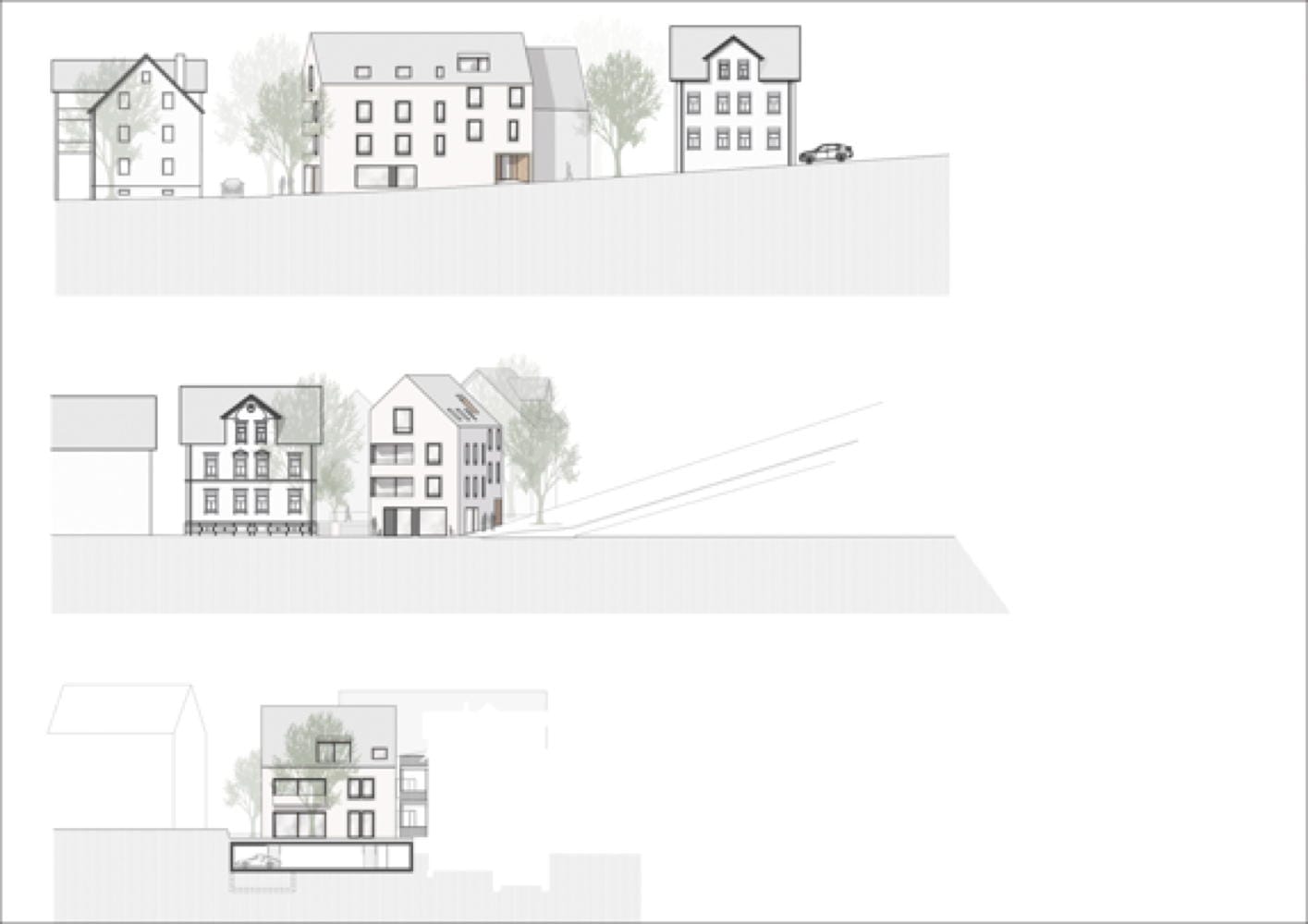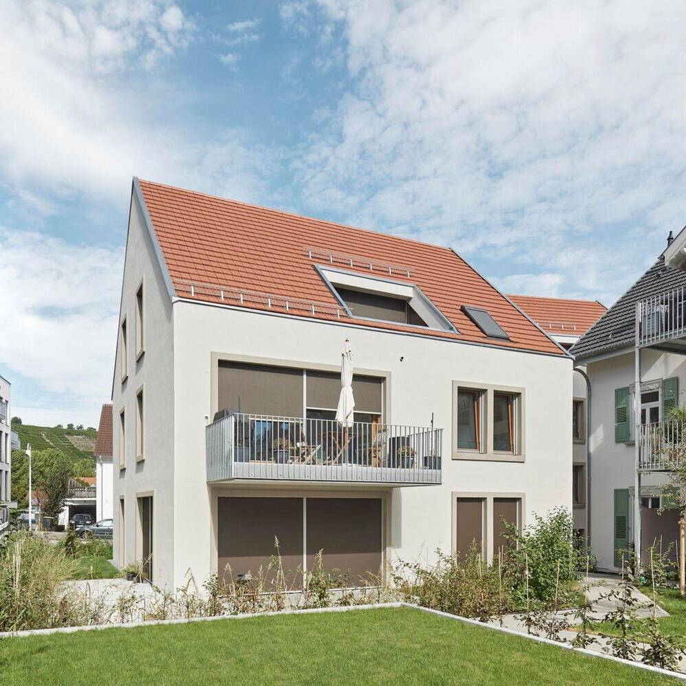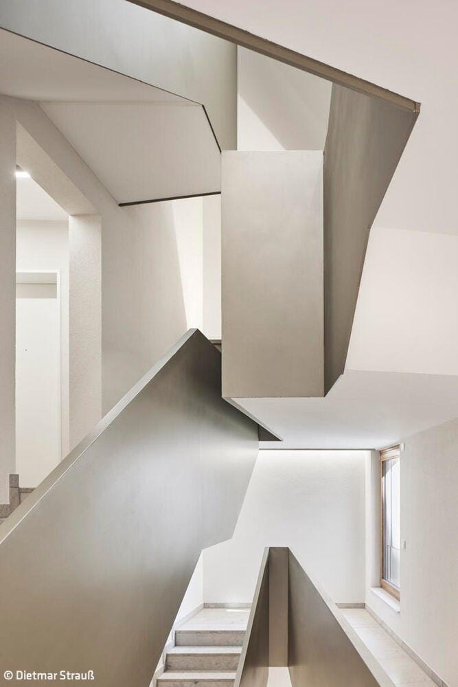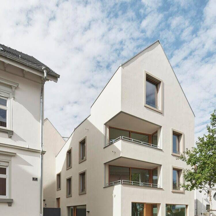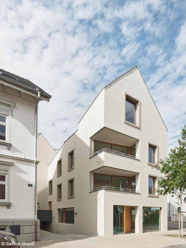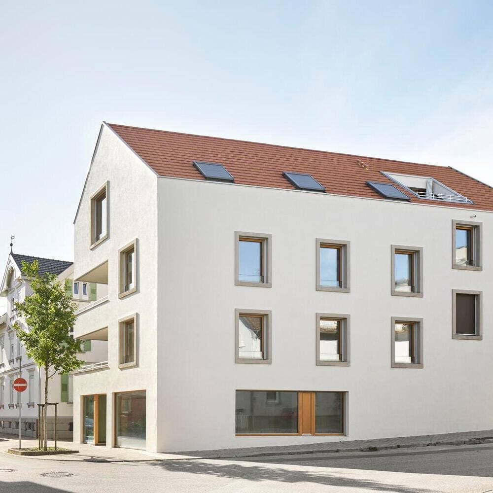Der zweite Siedlungsring in Besigheim zeichnet sich durch engen Bezug zur historischen Kernstadt und die Nähe zum Bahnhof aus, was ihn besonders attraktiv macht. In einem Eckbereich galt es, den Blockrand zu schließen und die Architektur sensibel an die umgebende Bebauung anzupassen. Architekt Kai Dongus entwarf ein Neubau-Ensemble, das auf kluge Weise den Raum erforscht: Während es sich straßenseitig wie ein schmaler Baukörper präsentiert, offenbart es nord- und rückseitig seine tatsächliche Kubatur: drei unterschiedlich ausgerichtete Baukörper, die sich harmonisch in die umliegende Bebauung einfügen. Farbe und Materialität der verputzten Lochfassaden und des Ziegeldachs, die Fensterformate und die sandsteinfarbenen Faschen orientieren sich konsequent an der Umgebung. Der Abstand zum nordöstlichen Nachbargebäude beträgt ca. 3,20 Meter und entspricht den Gebäudeabständen entlang der Straße, wodurch eine klare Straßenkante entstand und die Belichtung der Fassaden erhalten bleibt. Der Zugang erfolgt barrierefrei ebenerdig sowie über eine am Altbau entlang geführte Verbindungstreppe. In den drei leicht verdrehten Baukörpern mit Satteldach finden sieben Wohnungen und ein Ladenlokal Platz. Der halbgeschossige Versatz der Einheiten erzeugt eine besondere räumliche Qualität und eröffnet spannende Blickbezüge. Das skulptural gestaltete Treppenhaus öffnet sich nach oben zu einem großzügigen Luftraum; die Verdrehung der Erschließung wird hier deutlich sichtbar.