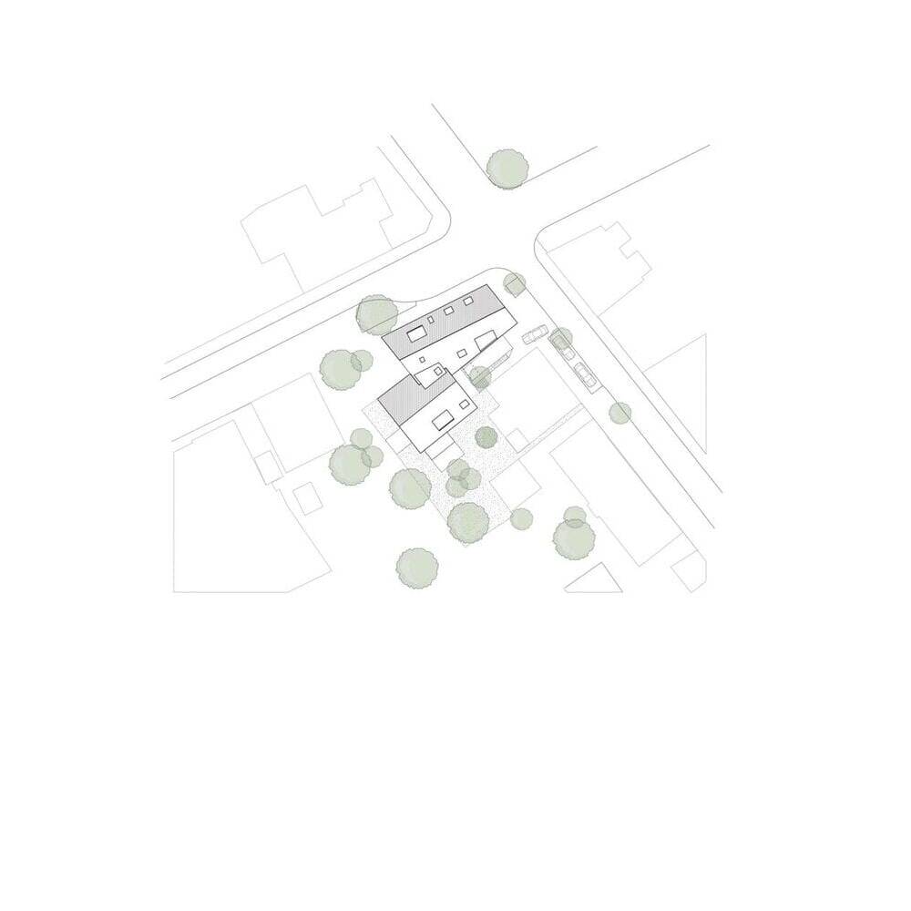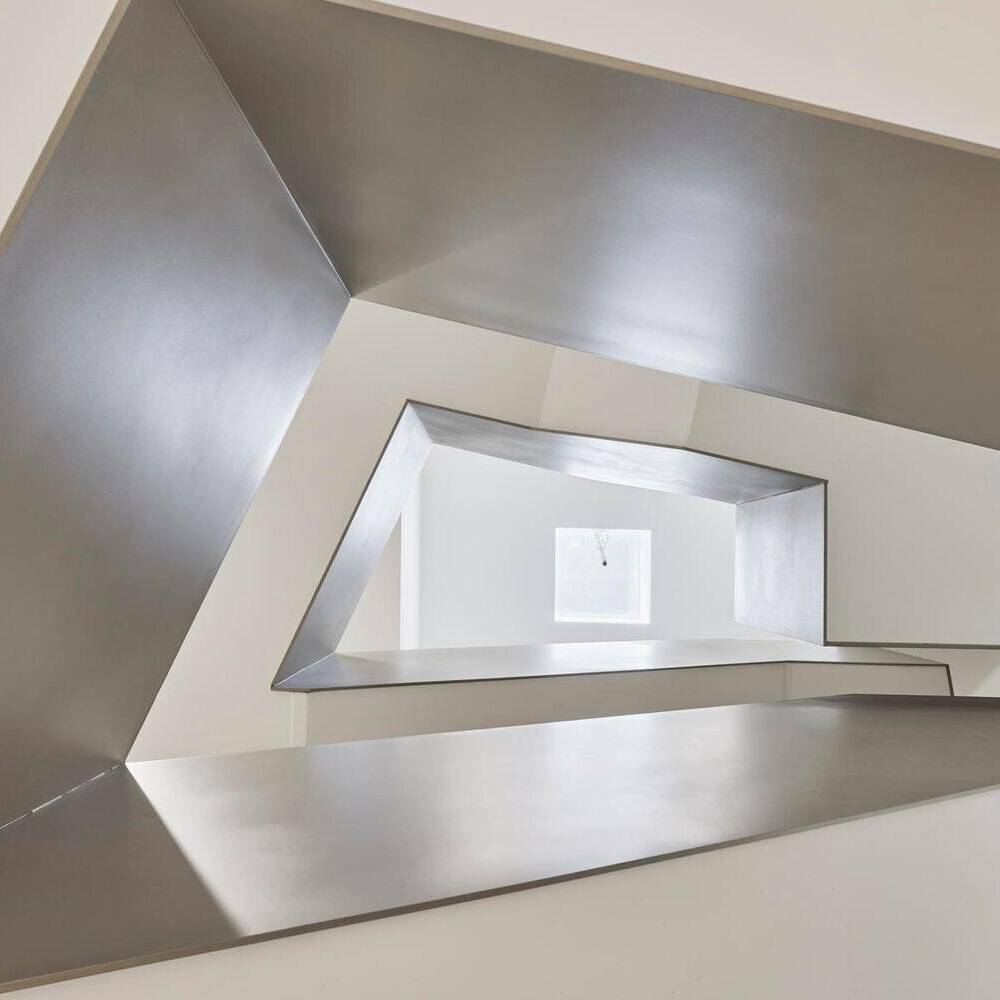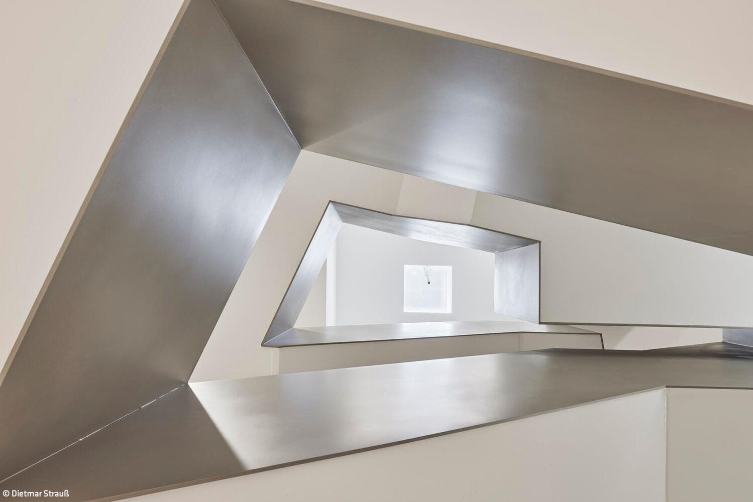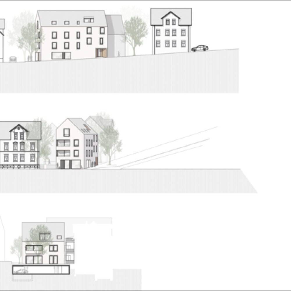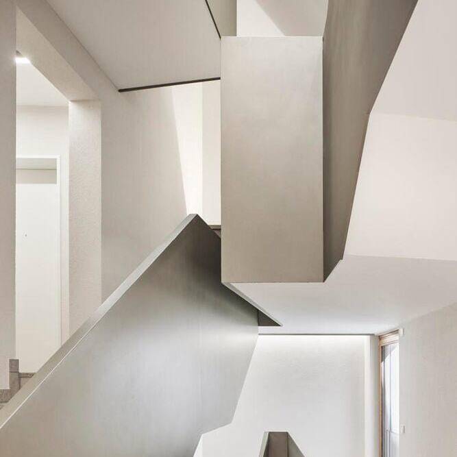 Der zweite Siedlungsring in Besigheim zeichnet sich durch engen Bezug zur historischen Kernstadt und die Nähe zum Bahnhof aus, was ihn besonders attraktiv macht. In einem Eckbereich galt es, den Blockrand zu schließen und die Architektur sensibel an die umgebende Bebauung anzupassen. Architekt Kai Dongus entwarf ein Neubau-Ensemble, das auf kluge Weise den Raum erforscht: Während es sich straßenseitig wie ein schmaler Baukörper präsentiert, offenbart es nord- und rückseitig seine tatsächliche Kubatur: drei unterschiedlich ausgerichtete Baukörper, die sich harmonisch in die umliegende Bebauung einfügen. Farbe und Materialität der verputzten Lochfassaden und des Ziegeldachs, die Fensterformate und die sandsteinfarbenen Faschen orientieren sich konsequent an der Umgebung. Der Abstand zum nordöstlichen Nachbargebäude beträgt ca. 3,20 Meter und entspricht den Gebäudeabständen entlang der Straße, wodurch eine klare Straßenkante entstand und die Belichtung der Fassaden erhalten bleibt. Der Zugang erfolgt barrierefrei ebenerdig sowie über eine am Altbau entlang geführte Verbindungstreppe. In den drei leicht verdrehten Baukörpern mit Satteldach finden sieben Wohnungen und ein Ladenlokal Platz. Der halbgeschossige Versatz der Einheiten erzeugt eine besondere räumliche Qualität und eröffnet spannende Blickbezüge. Das skulptural gestaltete Treppenhaus öffnet sich nach oben zu einem großzügigen Luftraum; die Verdrehung der Erschließung wird hier deutlich sichtbar.