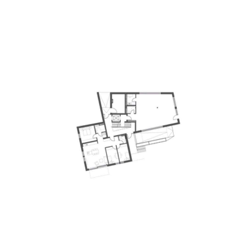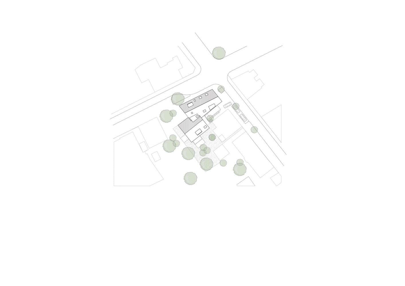 Die Treppe sowie ein als Durchlader konzipierter Aufzug verbinden die versetzten Ebenen barrierefrei, sodass alle Wohnungen gut erschlossen sind. Die Orientierung der Wohnungen erfolgt überwiegend nach Süden bzw. Westen, was eine gute natürliche Belichtung und sonnige Nutzungen sicherstellt. Eine kleine, sich über drei Ebenen erstreckende Wohnung im nordwestlichen Grundstücksbereich erhält durch eine Dachloggia fühlbare Sonne. Der ruhende Verkehr für den Neubau und das benachbarte und denkmalgeschützte Gebäude ist nicht störend in der Tiefgarage untergebracht. Dort befinden sich auch 12 wettergeschützte Fahrradstellplätze. Der Durchgang durch das Gebäude ermöglicht eine barrierefreie Erschließung des angrenzenden Grünbereichs, der den behördlich geforderten Spielplatz aufnehmen soll. Insgesamt entstand ein kompaktes, gut belichtetes Ensemble, das wie der übrige Blockrand den historischen Bezug wahrt, zugleich aber durch Auslotung des Raums und hochwertige Details eine zeitgenössische Identität entwickelt.