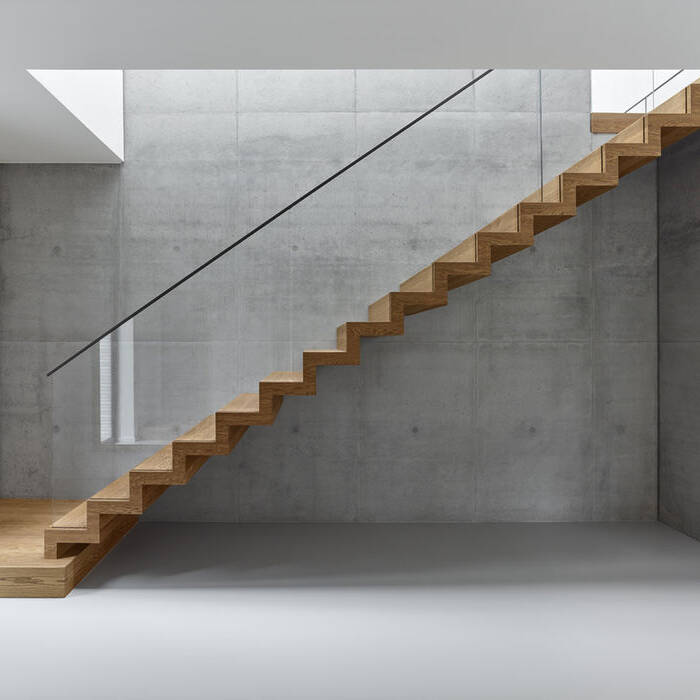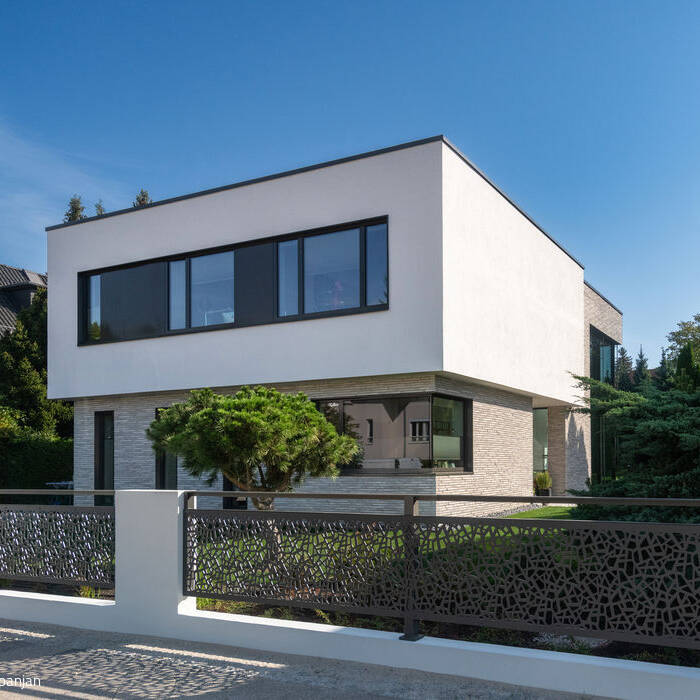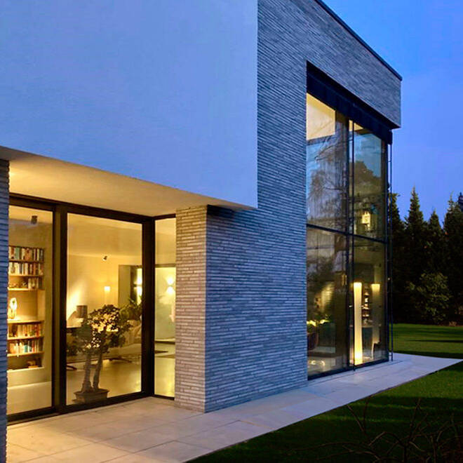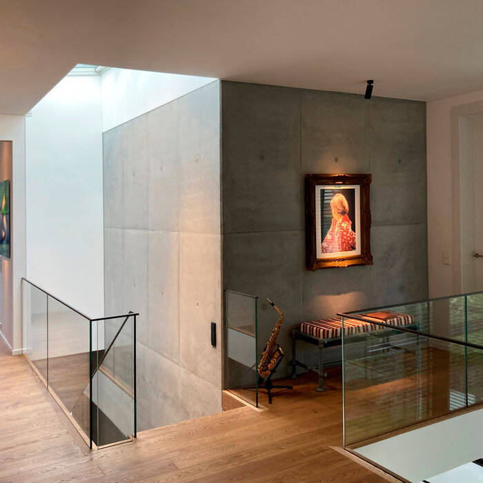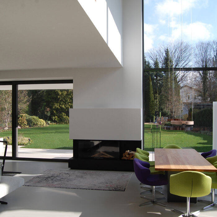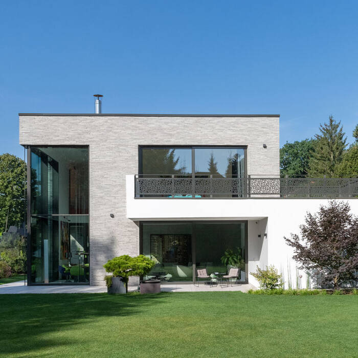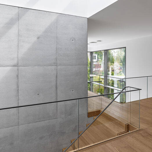 Der kubische Baukörper ist geprägt durch das plastische Zusammenspiel von verputzten und verklinkerten Fassadenelementen, die sich spielerisch um das Gebäude entwickeln. Das besondere Format der Klinker mit 5 x 50 Zentimetern und ihre lebendige Struktur bilden einen Kontrast zu den scharfkantigen, feingeputzten Flächen. Die Fassade wird durch großflächige Fensterbänder im Obergeschoss gegliedert. Die Öffnungsflügel nehmen Bezug zu den Fenstern im Erdgeschoss, wodurch eine gestalterische Klarheit entsteht. Zum Garten hin öffnet sich das Gebäude zum einen durch eine zweigeschossige Pfostenriegelkonstruktion, die dem dahinter liegenden Essbereich eine besondere Atmosphäre schenkt. Wohn- und Schlafbereich – von der Straße abgewandt – werden durch großformatige, elektrisch betriebene Schiebetüren belichtet. Alle Zu- und Ausgänge sind bodengleich und schwellenlos konzipiert. Man betritt das Haus durch eine Eingangstür, die sich durch schlichte Eleganz auszeichnet. Der Eingangsbereich ist von einer sechs Meter hohen Sichtbetonwand geprägt und durch ein Lichtband tagsüber sonnenbestrahlt sowie abends durch geschickt angeordnete Deckenstrahler atmosphärisch ausgeleuchtet. Die Sichtbetonwand ist der zentrale gestalterische Kern, um den sich die Innenräume fließend anordnen. Im Erdgeschoss mündet sie in einem Bücherregal aus Beton, das auch die räumliche Trennung zwischen offenem Küchen- und Wohnbereich bildet. Handwerklich besonders gelungen ist die Faltwerktreppe mit Ganzglasbrüstung und lediglich einem schmalen Metallband als Handlauf. Der zentral zwischen Ess- und Wohnbereich angeordnete Kamin bildet den Übergang zwischen Ess- und Wohnbereich, der sich großzügig zur Terrasse öffnet. Diese wird durch den Balkon stützenfrei überdeckt und bietet mit der gemauerten Sitzbank einen geschützten Ort zum Verweilen. Unterstützt wird dieses Raumkontinuum durch den fugenlos gegossenen grauen Biopolymere Boden in allen Erdgeschossräumen. Im Obergeschoss werden die Räume fast nur durch Schiebetüren unterteilt und auch das Bad ist offen vom Schlafzimmer aus zu erreichen. Ein besonderer Lieblingsort ist die Lesegalerie, von der aus alle raumprägenden Elemente wahrzunehmen sind. Vom Außensitzplatz, der gestalterisch an einem englischen Landschaftsgarten orientiert, können die Bauherren in der letzten Abendsonne den Blick auf ihr beleuchtetes Haus genießen.