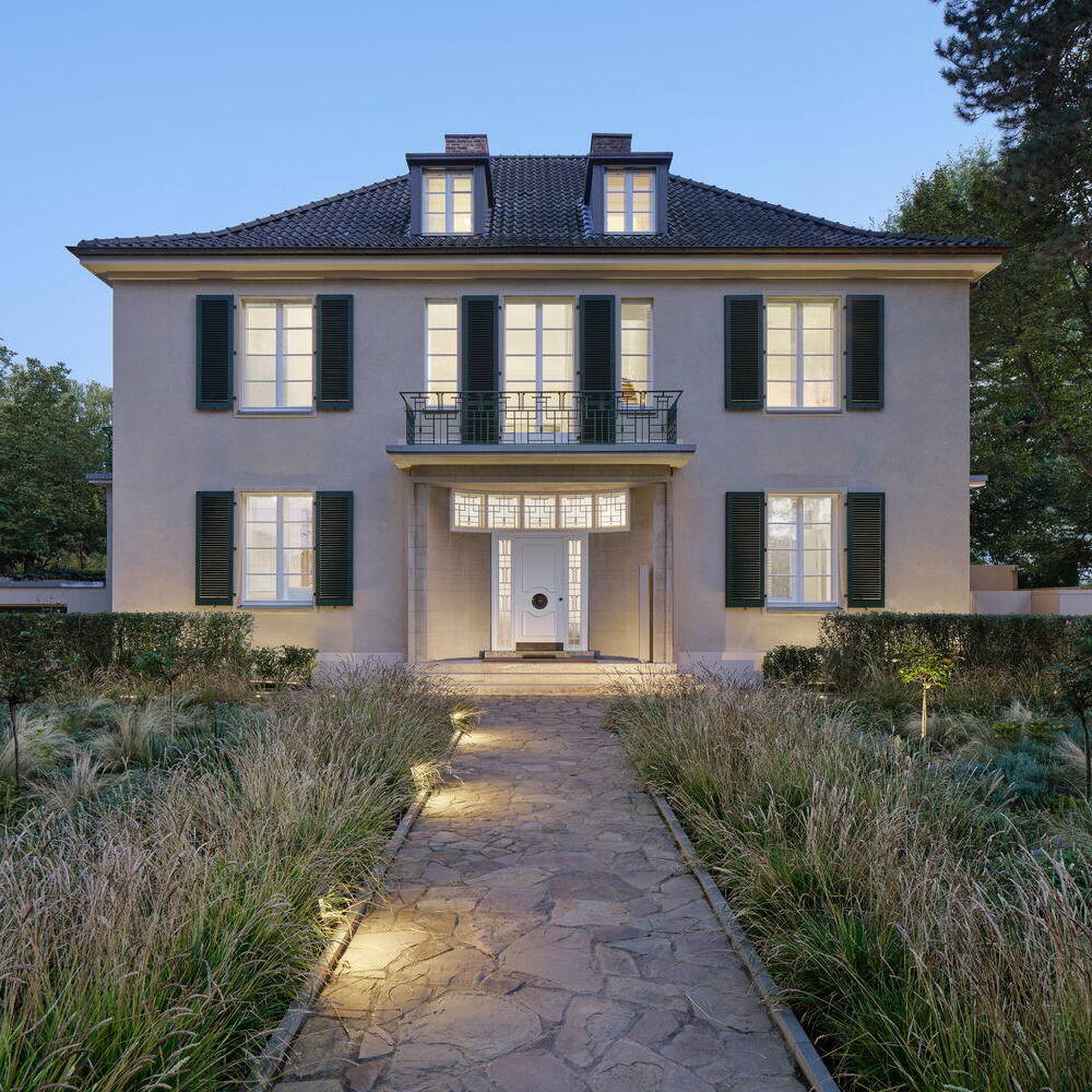 Quadratischer Grundriss, akzentuierendes Eingangs- und Gartenportal sowie ein aufgesetztes Walmdach – das Gebäude, das wie aus einem Lehrbuch der klassischen palladianischen Villa wirkte, entpuppte sich beim Blick in die Bauakte als eine vergleichsweise späte Replik. Neben dem Architekten Heinrich Benoit (1877–1950) war dort das Jahr 1933 als Baujahr angegeben – als hätte es die Moderne der Zwanziger Jahre nie gegeben und eine Versachlichung der Architektur niemals stattgefunden. Das Kölner Architekturbüro Wilkin & Hanrath Bauphasen wurde von den Eigentümern damit beauftragt, das denkmalgeschützte Objekt konstruktiv und energetisch zu sanieren und ästhetisch umzugestalten. Um zeitgemäße Komfort- und Wohnansprüchen umzusetzen, wurde die Immobilie vor allem innen behutsam umgestaltet und wirkungsvoll neu in Szene gesetzt.