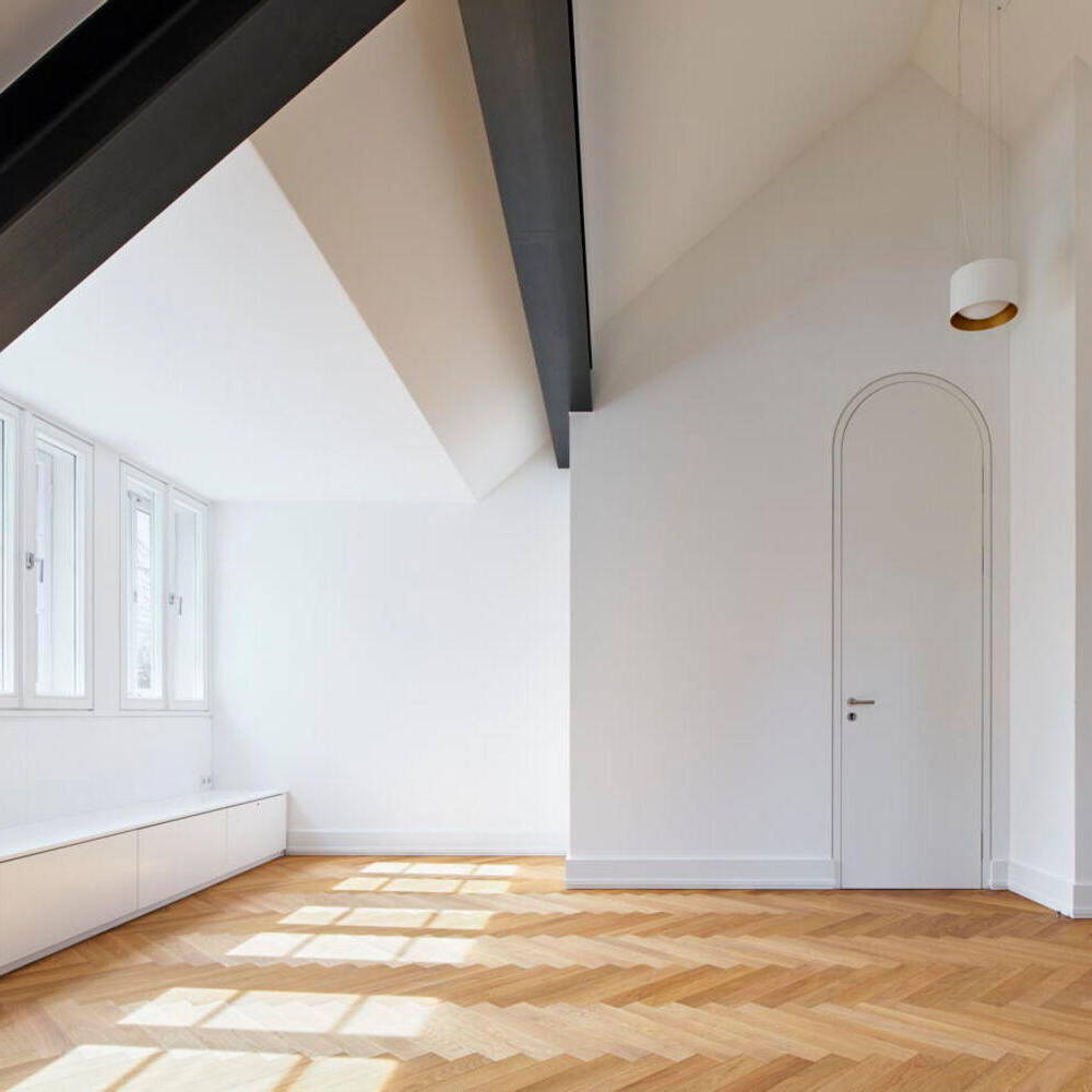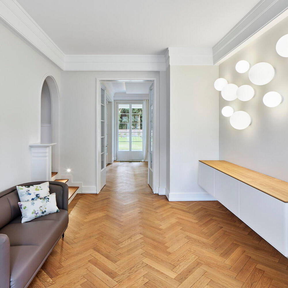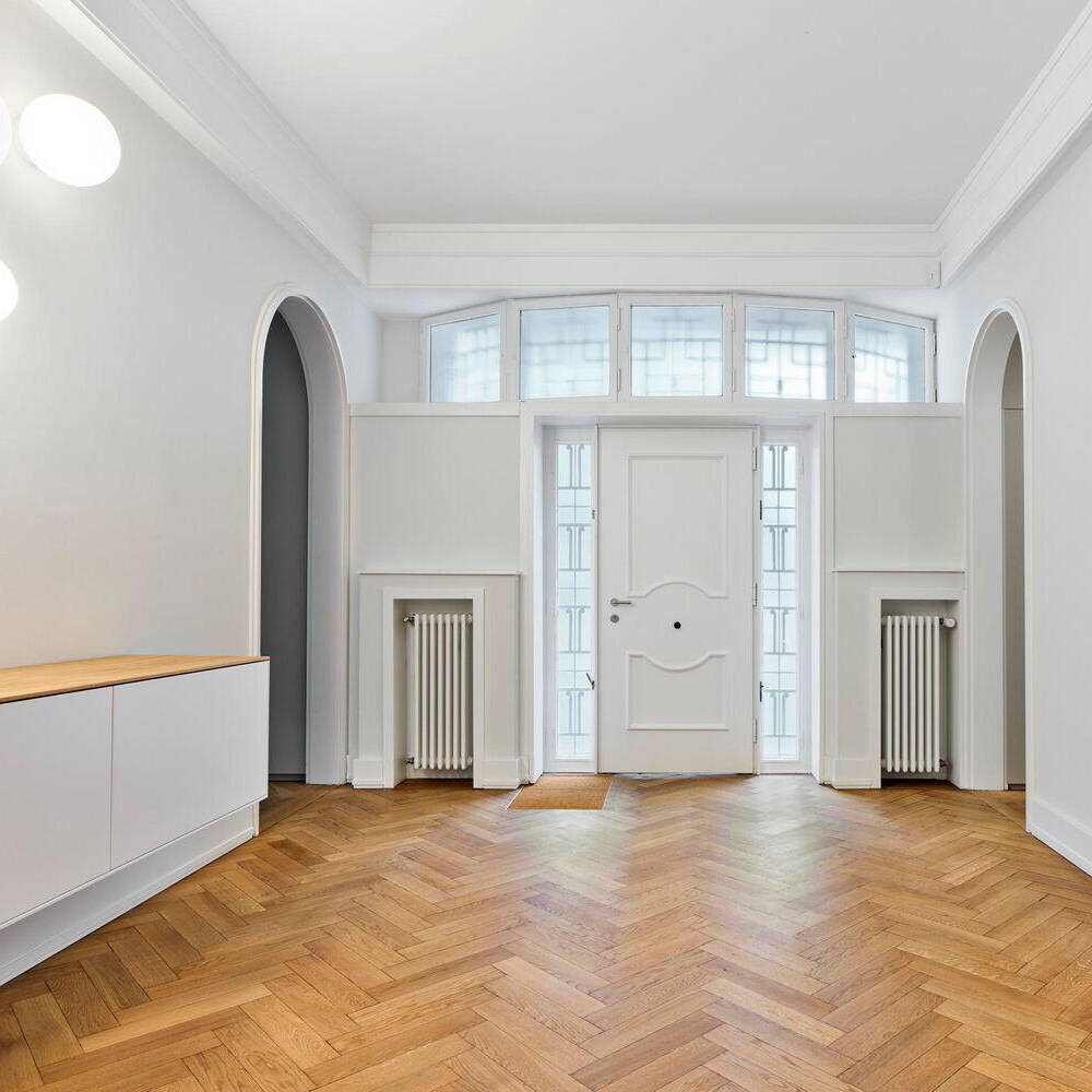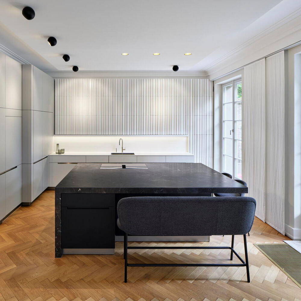In den Innenräumen musste das vorhandene Fischgrätparkett um jeden Preis erhalten werden. Entsprechend schied der Einbau einer Fußbodenheizung und einer standardisierten nachhaltigen Heiztechnik aus. Das Gebäude lässt sich dennoch nicht nur mit der vorhandenen Gasheizung, sondern auch über eine Wärmepumpe beheizen: So werden im Wohnbereich die stilgerecht erneuerten Heizkörper durch eigens für das Gebäude entwickelte großflächig wärmende Keramikelemente an den Wänden ergänzt. Insbesondere in der Küche, aber auch an der Kaminwand im Essbereich korrespondieren diese in ihrer formalen Gestaltung mit der stuckverzierten Architektur. Die Räume wirken in ihrem Duktus minimalistisch reduziert: Der Weißton der Stuckdecken und des modernen Einbaumobiliars wird mit einem Grauton für Wände und Einbauküche ergänzt. Dazu treten immer wieder auch schwarze Akzentflächen, die punktuelle Kontraste setzen. Mit reduzierten formalen Mitteln finden klassische Denkmalsubstanz und moderne Gestaltung zu einer gelassenen harmonischen Symbiose.