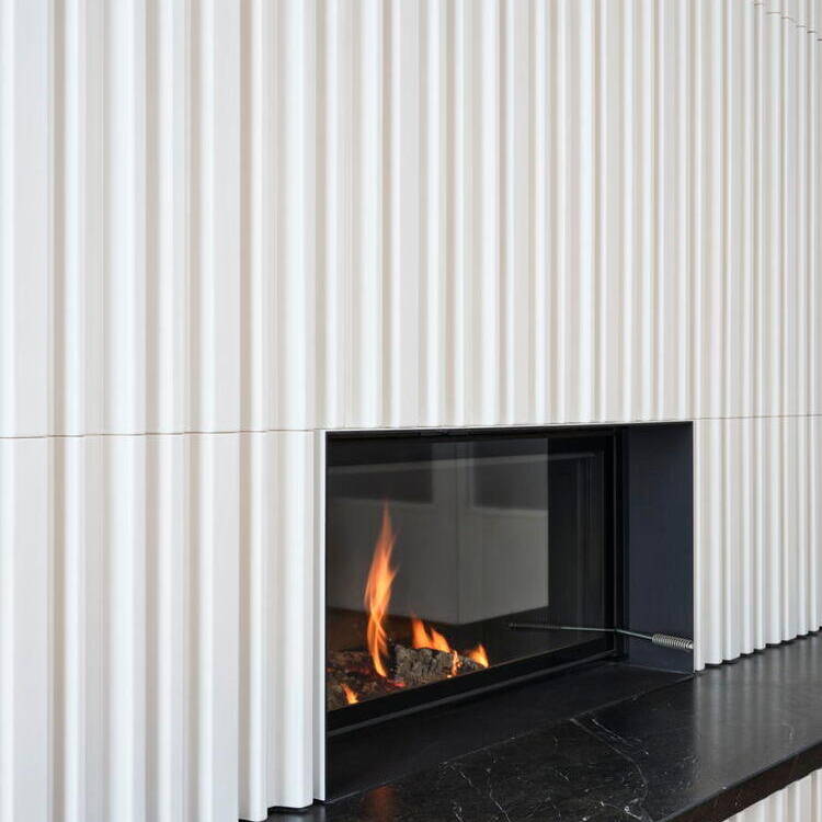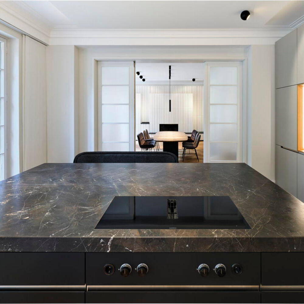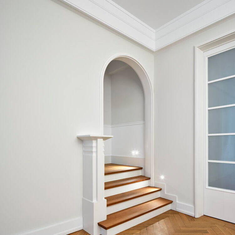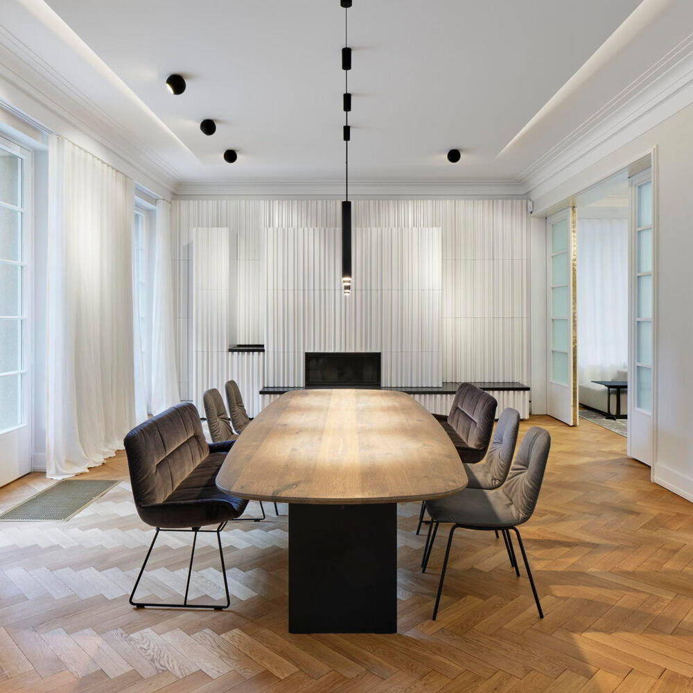 In den Innenräumen musste das vorhandene Fischgrätparkett um jeden Preis erhalten werden. Entsprechend schied der Einbau einer Fußbodenheizung und einer standardisierten nachhaltigen Heiztechnik aus. Das Gebäude lässt sich dennoch nicht nur mit der vorhandenen Gasheizung, sondern auch über eine Wärmepumpe beheizen: So werden im Wohnbereich die stilgerecht erneuerten Heizkörper durch eigens für das Gebäude entwickelte großflächig wärmende Keramikelemente an den Wänden ergänzt. Insbesondere in der Küche, aber auch an der Kaminwand im Essbereich korrespondieren diese in ihrer formalen Gestaltung mit der stuckverzierten Architektur. Die Räume wirken in ihrem Duktus minimalistisch reduziert: Der Weißton der Stuckdecken und des modernen Einbaumobiliars wird mit einem Grauton für Wände und Einbauküche ergänzt. Dazu treten immer wieder auch schwarze Akzentflächen, die punktuelle Kontraste setzen. Mit reduzierten formalen Mitteln finden klassische Denkmalsubstanz und moderne Gestaltung zu einer gelassenen harmonischen Symbiose.