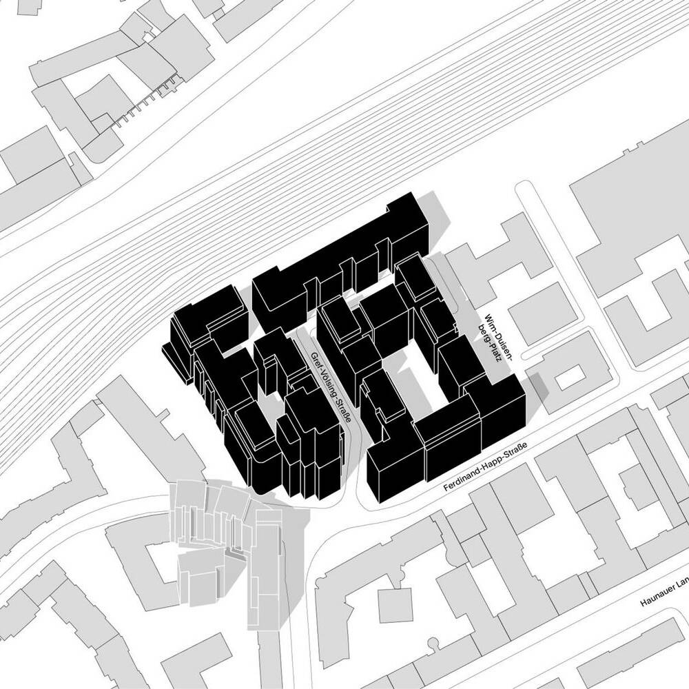 Das Frankfurter Ostend wandelt sich seit den 2000er-Jahren besonders stark. In diesem vormals industriell geprägten Stadtteil hat die Arbeitsgemeinschaft der Architekten Karl Dudler, Stefan Forster und O&O Baukunst 2023 den dritten Bauabschnitt eines urbanen Wohnquartiers vollendet, das durch städtebauliche Vielfalt und architektonische Qualität besticht – und das, obwohl hier ursprünglich eine Wohnbebauung baurechtlich ausgeschlossen war. Unweit der heutigen EZB, auf dem Areal des früheren Güterbahnhofs Ost, hatte der Projektentwickler Max Baum bereits 2003 eine Fläche von etwa 40.000 m² zwischen Ferdinand-Happ-Straße im Süden und den Bahngleisen im Norden erworben. Unter der Bezeichnung „Schwedler Carré“ wurde das Grundstück zunächst mit einem Supermarkt samt Parkhaus, der EZB-Kita und drei Bürohäusern in Ost-West-Richtung bebaut.