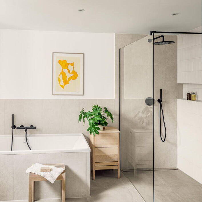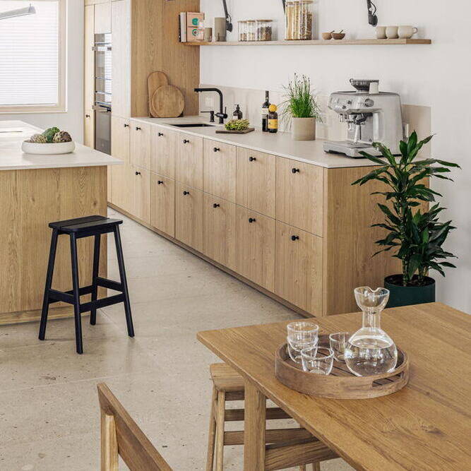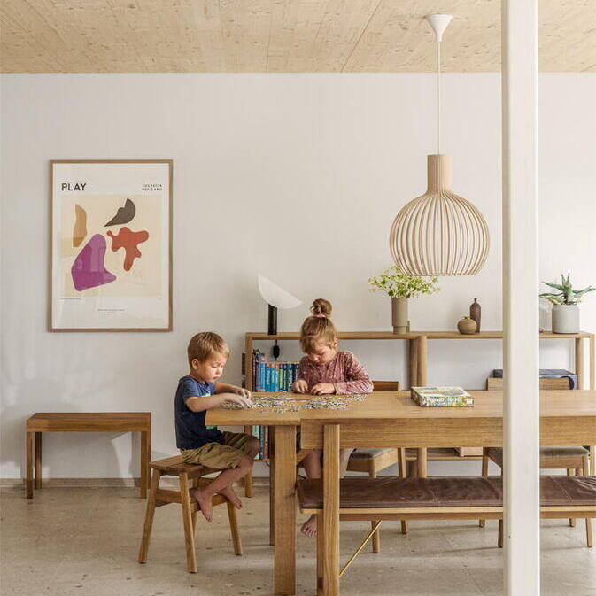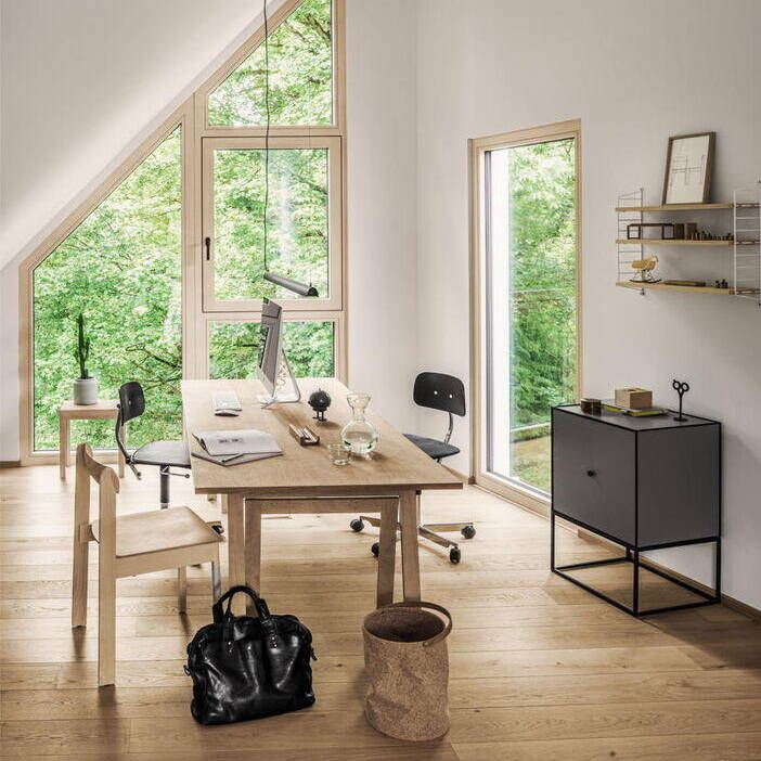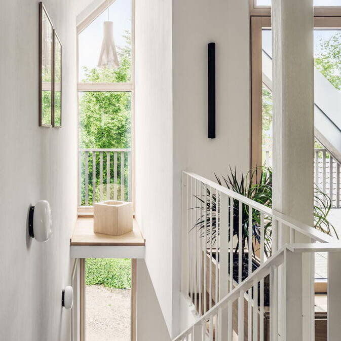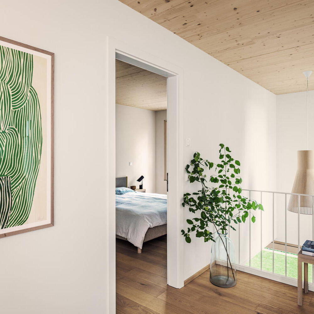 Innen sind die Verwendung minimalistischer Formen, skandinavischer Einflüsse und Nachhaltigkeit wesentliche Aspekte der Gestaltung. Dabei sollten maximal vier verschiedene Farbtöne und Materialien im gesamten Haus zum Einsatz kommen. Die Harmonie zwischen den einzelnen Elementen ist von entscheidender Bedeutung. Dazu zählen Naturstein, Eiche und ein reduzierter Farbkanon. Es gibt viele kleine Details mit sichtbarer Fichtendecke und vor allem Möbel und Leuchten, die sich in den Stil einfügen, darunter Stücke aus der Kollektion von Form & Refine.