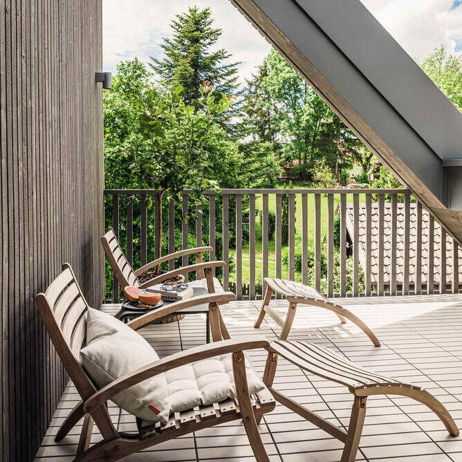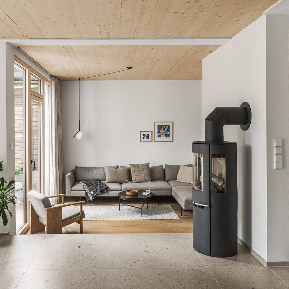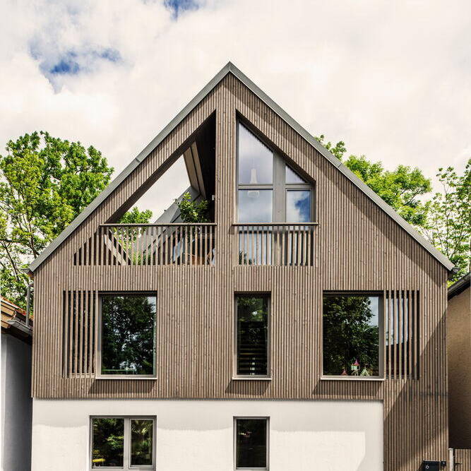 Die Grundrissform ergab sich aus der Kubatur des alten Bestands, die aufgegriffen wurde um den Genehmigungsprozess zu beschleunigen. Durch eine schräge Außenwand wird der Außenbereich optisch zum Garten hin geöffnet. Daraus ergibt sich eine Zweiteilung des Gebäudes: im Erdgeschoss in Wohnen, WC und Eingang zum einen sowie Küche und Essen zum anderen, in den Obergeschossen in jeweils zwei Raumspangen, getrennt durch den mittigen Flur. Straßenseitig ummantelt eine vertikale Holzlattung aus Lärchenholz das Ober- und das Dachgeschoss der Giebelseite. Die zentrale Wunscherfüllung „viel Licht“ löste das Büro Alexandra Kiendl Architektur mit kreativen Kniffen. Um eine ausreichende Lichtzufuhr sicherzustellen – auf Fenster in den Seitenwänden musste aus Brandschutzgründen verzichtet werden – wurden zwei trapezförmige Fenster auf der Vorder- und Rückseite sowie ein Glaselement zur Loggia integriert. Hierdurch erzeugt die zweigeteilte Fassade, die sich beim Wohnzimmer nach hinten versetzt präsentiert, zudem eine spannende Optik. Dadurch war es möglich, einen zweiten Terrassenplatz und eine Kiesfläche zu realisieren und die Aufenthaltsqualität im Garten deutlich zu steigern.