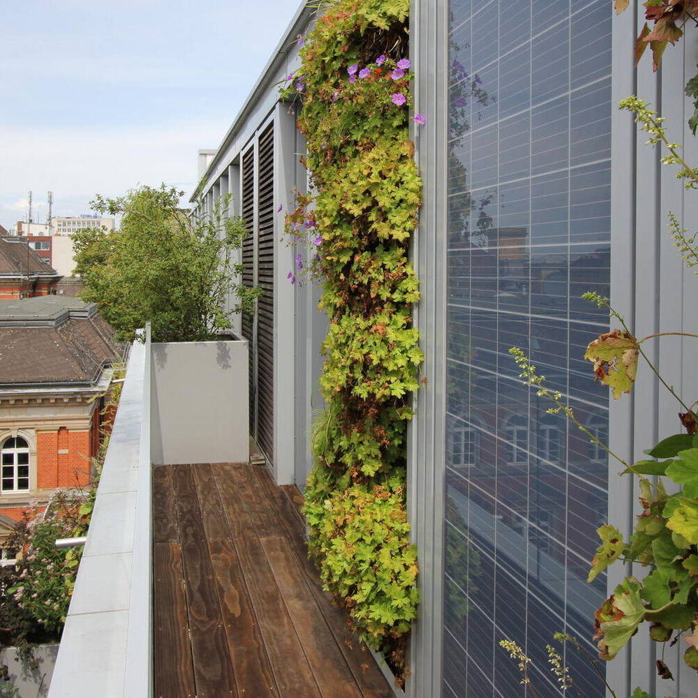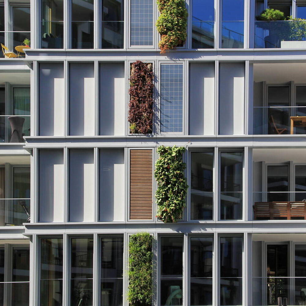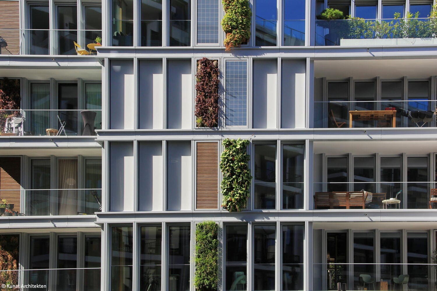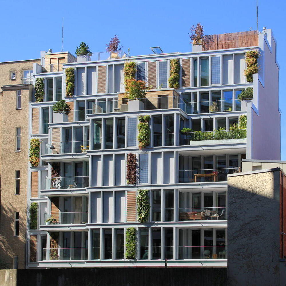 Ein Gebäude in zweiter Reihe wartet mit einer Fassade auf, die Aufmerksamkeit auf sich zieht: Sie sollte nicht nur optisch ansprechend, sondern im Idealfall auch innovativ sein. Für seine Bauaufgabe in der Bundesallee gelang es dem Berliner Architekten Michael Kunat, ein besonders modulares Fassadenkonzept zu entwickeln. Raumhohe, schmale Fassadenmodule aus Aluminium übernehmen verschiedene Funktionen, die beliebig ausgetauscht werden können: sie sind Fenster, Photovoltaikmodule- oder modifizierte Holzflächen, vertikale Grünflächen oder „Fensterläden“ in Gestalt außen liegender Rollos. So entsteht ein abwechslungsreiches Fassadenbild, mit Elementen, die sich „nützlich machen“: Sie versorgen das Gebäude mit Licht, Energie und erfrischendem Grün – oder bieten zugleich Sichtschutz. In einen filigranen Alurahmen eingepasst, geben die bündig abschließenden Paneele dem Gebäude einen leichten, luftigen Charakter. Die senkrechten Beete sind mit einheimischen, immergrünen Pflanzen bestückt, die „atmen“, und die CO₂-Bilanz des Gebäudes zusammen mit den anderen Elementen des Begrünungskonzepts – Gartenhof, Dachflächen, Loggien und Terrassen – positiv beeinflussen. Je nach Bedarf und Wunsch der Nutzenden kann ein Fassadenelement gegen ein anderes ausgetauscht werden. Ein Stahlbeton-Skelettbau bildet den Rahmen für dieses Konzept, das sich im Innern flexibel an zukünftige Wohnformen und technische Entwicklungen anpassen lässt. Das Ziel ist die Verbindung von Lebensqualität und ökologische Verantwortung. Hinter der innovativen Fassade verbirgt sich ein siebengeschossiges Mixed-Use-Gebäude in sehr zentraler Lage in Charlottenburg, unweit des Ku-Damms. Die Bauherren, die Fortuna Familien GmbH, hatten das unglaubliche Glück, in dieser Gegend, in der es eigentlich kein Bauland mehr gibt, ein Restgrundstück im Hinterhof zu erwerben, das davor ein Parkplatz gewesen war. Das Wohn- und Geschäftshaus fügt sich jetzt in seine Lücke in zweiter Reihe, als hätte es schon immer hier gestanden. Das Gebäude wirkt trotz seiner stattlichen Größe filigran und luftig – auch ein Effekt, der durch die Leichtigkeit der Fassade erreicht wird. Das Haus birgt in den ersten beiden Geschossen vier Büroflächen mit einer Größe von 74–124 m². Die darüber liegenden Geschosse sind Mietwohnungen vorbehalten – bewusst verzichtete das Berliner Familienunternehmen auf Wohnungseigentümer. Insgesamt 18 barrierefreie Wohnungen in den Größen von einem bis vier Zimmern (22–100 m²) entstanden hier – ergänzt durch zwei Penthousewohnungen mit je 30 m² Dachterrasse. Auf der Rückseite gibt es Loggien zum kleinen, begrünten Garten gen Osten. Die Innenräume überzeugen durch hochwertige Materialien – bei der Ausstattung des Eingangsbereichs, wie für die Büros und Wohnungen: Terazzoboden, lederbezogene Sitzgelegenheiten und Holzverkleidung im Entree, helle Einbauküchen, Eichenparkett und Natursteinbäder in den Wohnungen. Eine skulpturale Kunst am Bau begleitet das Projekt: Als silbern glänzende, stilisierte Pflanze windet sie sich entlang der Wand in den Hinterhof und „wächst“ an der Brandmauer zum Nachbarn weiter. Das Kunstwerk entwarf der deutsche Maler und Bildhauer Stefan Szczesny.