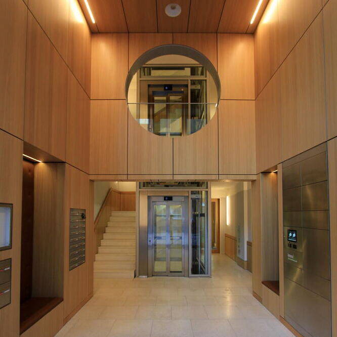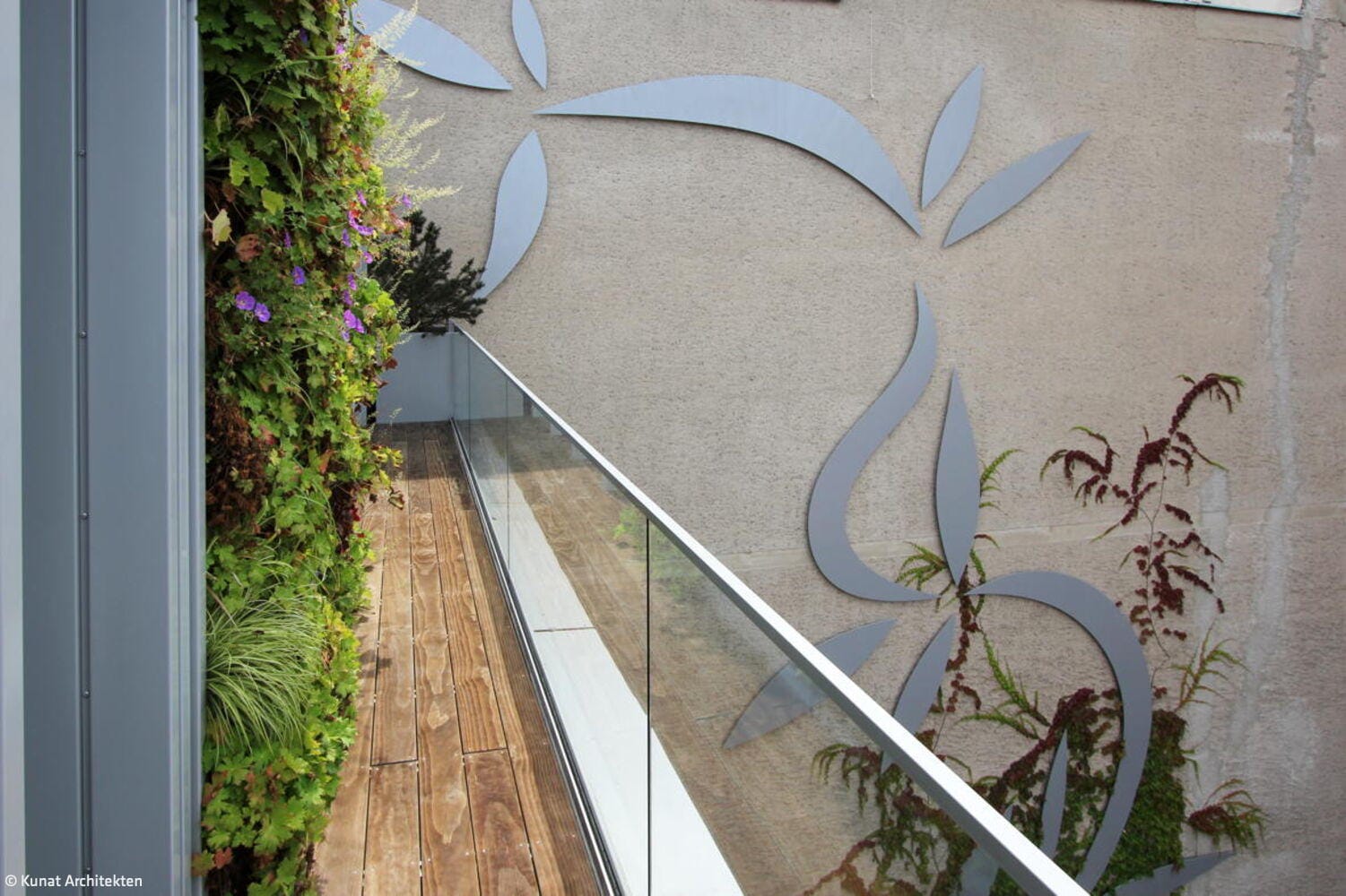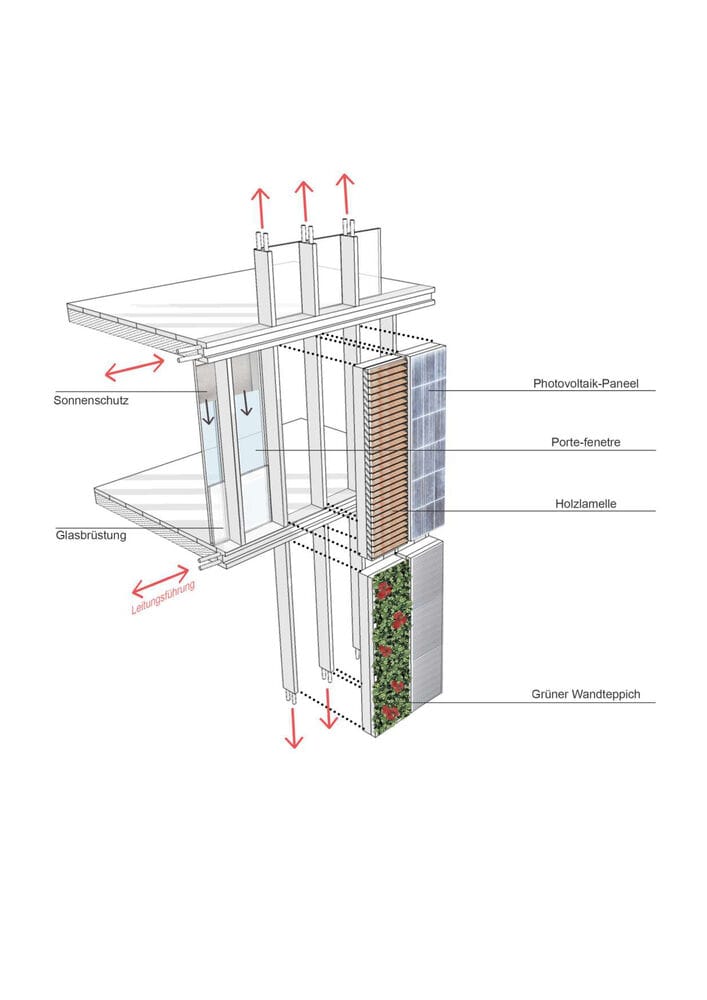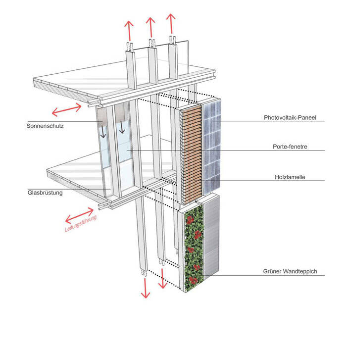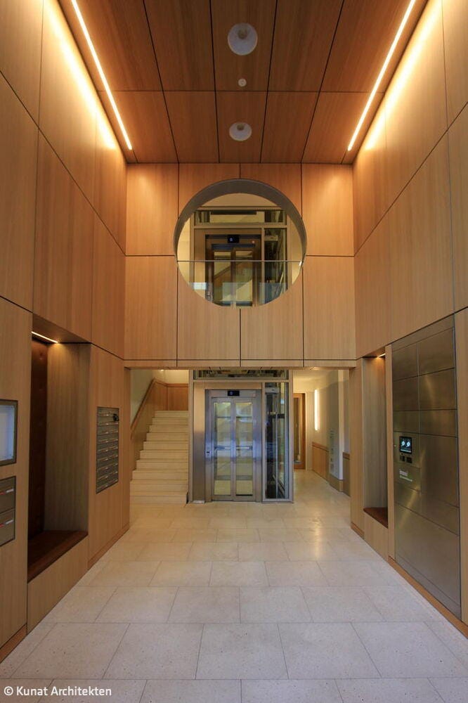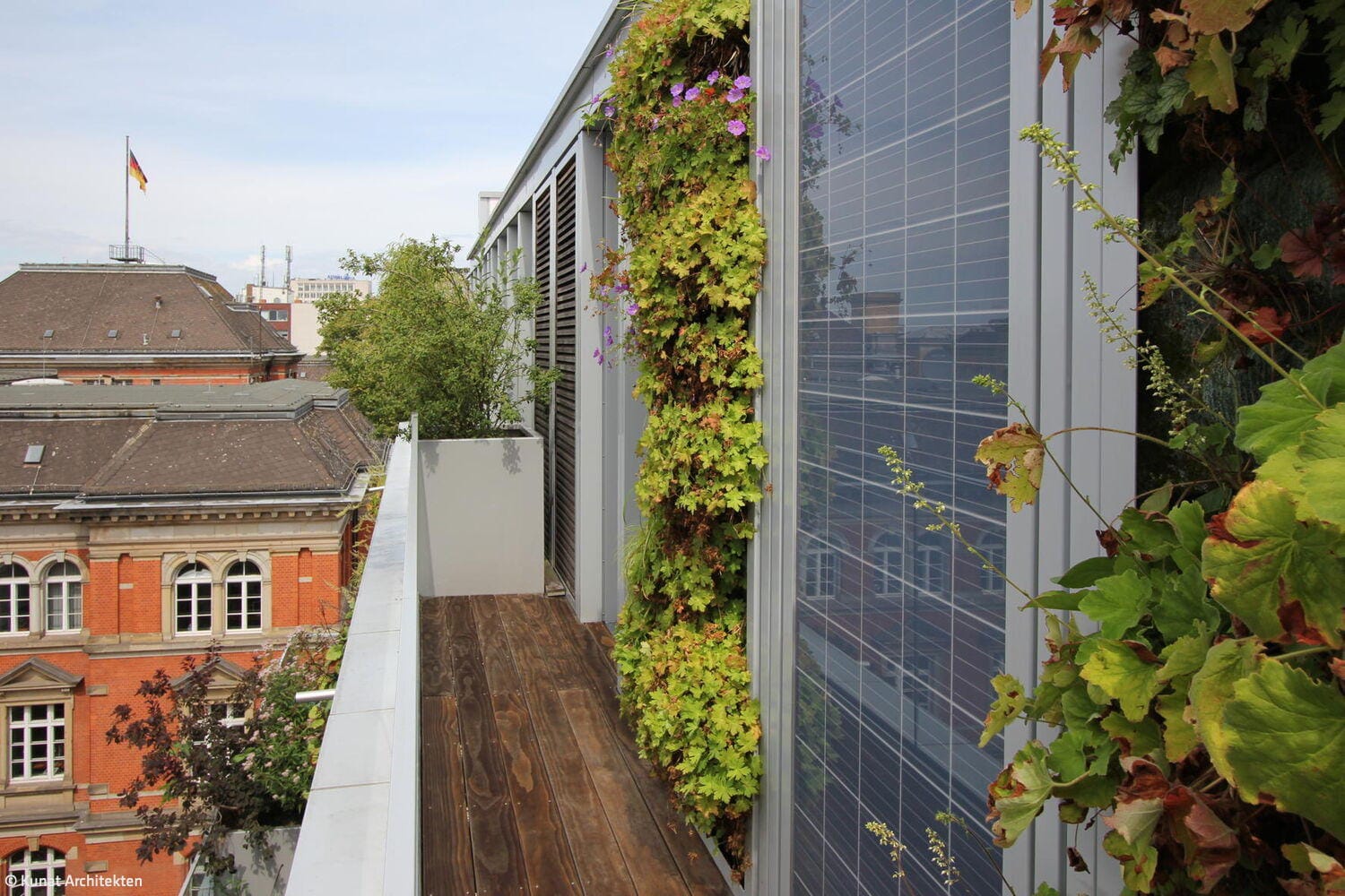 Ein Gebäude in zweiter Reihe wartet mit einer Fassade auf, die Aufmerksamkeit auf sich zieht: Sie sollte nicht nur optisch ansprechend, sondern im Idealfall auch innovativ sein. Für seine Bauaufgabe in der Bundesallee gelang es dem Berliner Architekten Michael Kunat, ein besonders modulares Fassadenkonzept zu entwickeln. Raumhohe, schmale Fassadenmodule aus Aluminium übernehmen verschiedene Funktionen, die beliebig ausgetauscht werden können: sie sind Fenster, Photovoltaikmodule- oder modifizierte Holzflächen, vertikale Grünflächen oder „Fensterläden“ in Gestalt außen liegender Rollos. So entsteht ein abwechslungsreiches Fassadenbild, mit Elementen, die sich „nützlich machen“: Sie versorgen das Gebäude mit Licht, Energie und erfrischendem Grün – oder bieten zugleich Sichtschutz. In einen filigranen Alurahmen eingepasst, geben die bündig abschließenden Paneele dem Gebäude einen leichten, luftigen Charakter. Die senkrechten Beete sind mit einheimischen, immergrünen Pflanzen bestückt, die „atmen“, und die CO₂-Bilanz des Gebäudes zusammen mit den anderen Elementen des Begrünungskonzepts – Gartenhof, Dachflächen, Loggien und Terrassen – positiv beeinflussen. Je nach Bedarf und Wunsch der Nutzenden kann ein Fassadenelement gegen ein anderes ausgetauscht werden. Ein Stahlbeton-Skelettbau bildet den Rahmen für dieses Konzept, das sich im Innern flexibel an zukünftige Wohnformen und technische Entwicklungen anpassen lässt. Das Ziel ist die Verbindung von Lebensqualität und ökologische Verantwortung. Hinter der innovativen Fassade verbirgt sich ein siebengeschossiges Mixed-Use-Gebäude in sehr zentraler Lage in Charlottenburg, unweit des Ku-Damms. Die Bauherren, die Fortuna Familien GmbH, hatten das unglaubliche Glück, in dieser Gegend, in der es eigentlich kein Bauland mehr gibt, ein Restgrundstück im Hinterhof zu erwerben, das davor ein Parkplatz gewesen war. Das Wohn- und Geschäftshaus fügt sich jetzt in seine Lücke in zweiter Reihe, als hätte es schon immer hier gestanden. Das Gebäude wirkt trotz seiner stattlichen Größe filigran und luftig – auch ein Effekt, der durch die Leichtigkeit der Fassade erreicht wird. Das Haus birgt in den ersten beiden Geschossen vier Büroflächen mit einer Größe von 74–124 m². Die darüber liegenden Geschosse sind Mietwohnungen vorbehalten – bewusst verzichtete das Berliner Familienunternehmen auf Wohnungseigentümer. Insgesamt 18 barrierefreie Wohnungen in den Größen von einem bis vier Zimmern (22–100 m²) entstanden hier – ergänzt durch zwei Penthousewohnungen mit je 30 m² Dachterrasse. Auf der Rückseite gibt es Loggien zum kleinen, begrünten Garten gen Osten. Die Innenräume überzeugen durch hochwertige Materialien – bei der Ausstattung des Eingangsbereichs, wie für die Büros und Wohnungen: Terazzoboden, lederbezogene Sitzgelegenheiten und Holzverkleidung im Entree, helle Einbauküchen, Eichenparkett und Natursteinbäder in den Wohnungen. Eine skulpturale Kunst am Bau begleitet das Projekt: Als silbern glänzende, stilisierte Pflanze windet sie sich entlang der Wand in den Hinterhof und „wächst“ an der Brandmauer zum Nachbarn weiter. Das Kunstwerk entwarf der deutsche Maler und Bildhauer Stefan Szczesny.