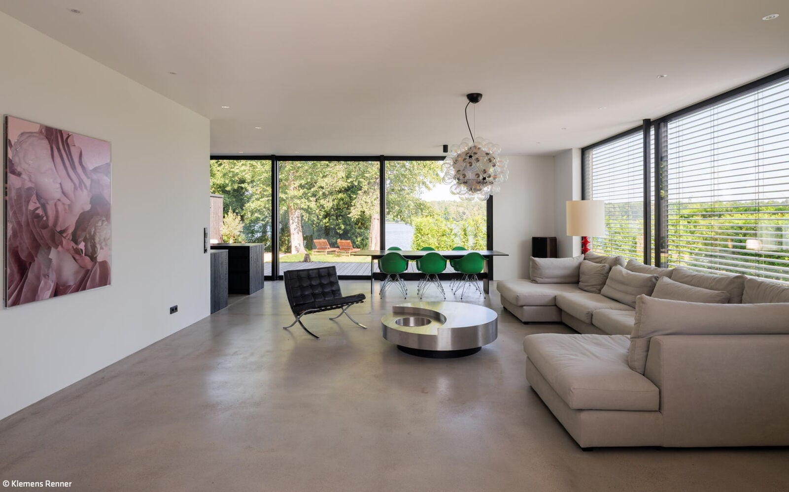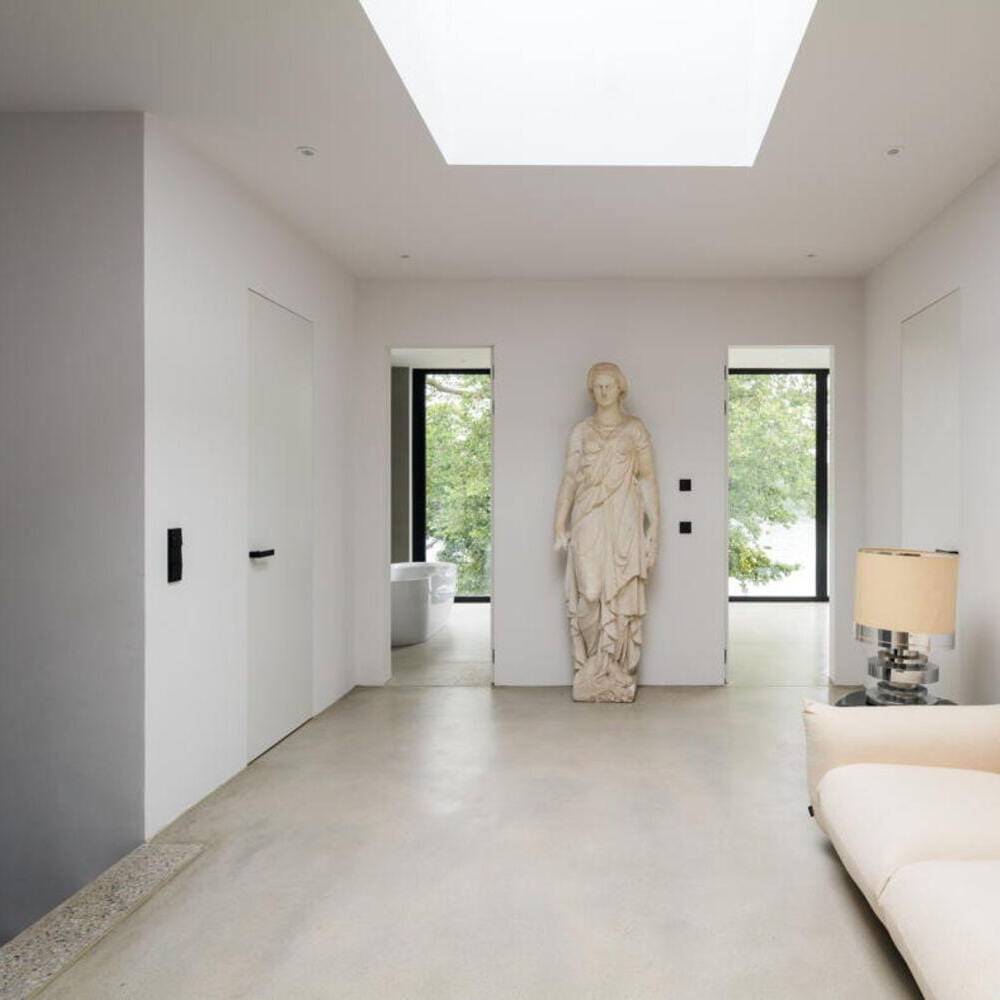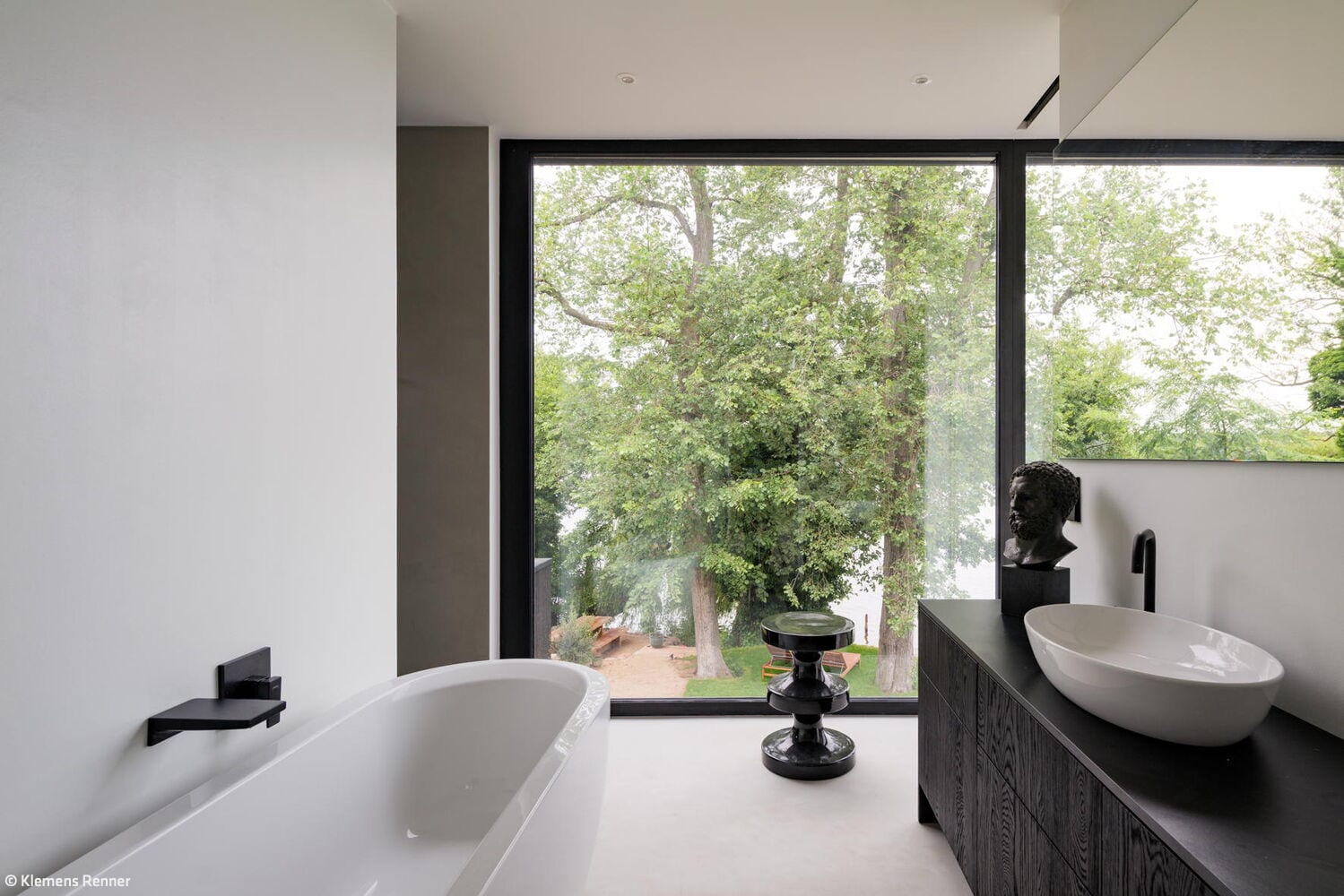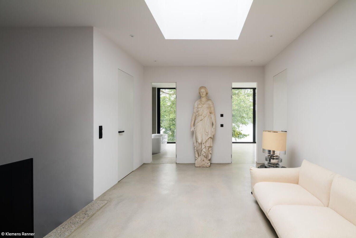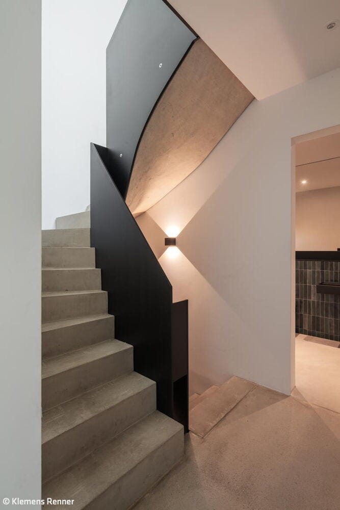 Der Stil des Hauses ist eine Reminiszenz an das alte Fischerdorf in Verbindung mit moderner Materialität und Architektursprache. Eine weitere Besonderheit sind die Panoramafenster auf der Seeseite im Osten. Auch die Südseite überrascht mit diesen großzügigen Fenstern. Neu gepflanzte Bäume und der alte Baumbestand sorgen für Sichtschutz. Aus diesen Blickwinkeln sieht das Haus wie ein Glashaus aus, das von einem Holzrahmen getragen wird. Eine vorgelagerte, großzügige Terrasse lädt zum Essen im Freien, Sonnenbaden oder einfach nur zum Entspannen ein. Als Dämmmaterial kamen Zellulose-Einblas- und Holzfaserdämmung zum Einsatz. Der geschliffene Estrichboden verbindet alle drei Geschosse über eine skulpturale Betontreppe, während er in den Badezimmern in einen farbgleichen Mikrozementboden übergeht. Durch die offene Struktur im Erdgeschoss und die großen Fensterflächen lässt sich das Draußen auch im Inneren erleben. Die Bewohner:innen können sich an großzügigen, hellen Räumen erfreuen.