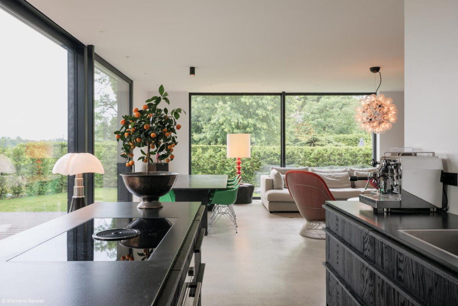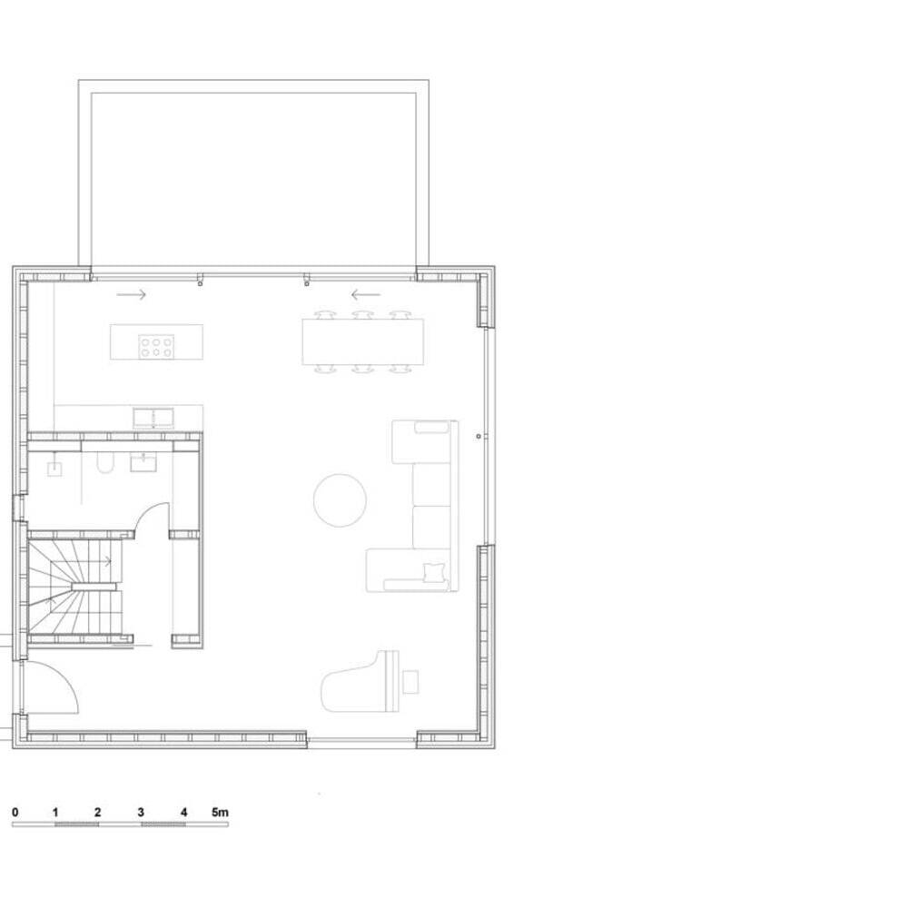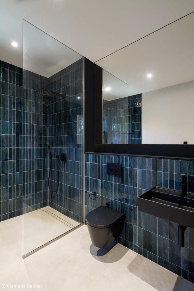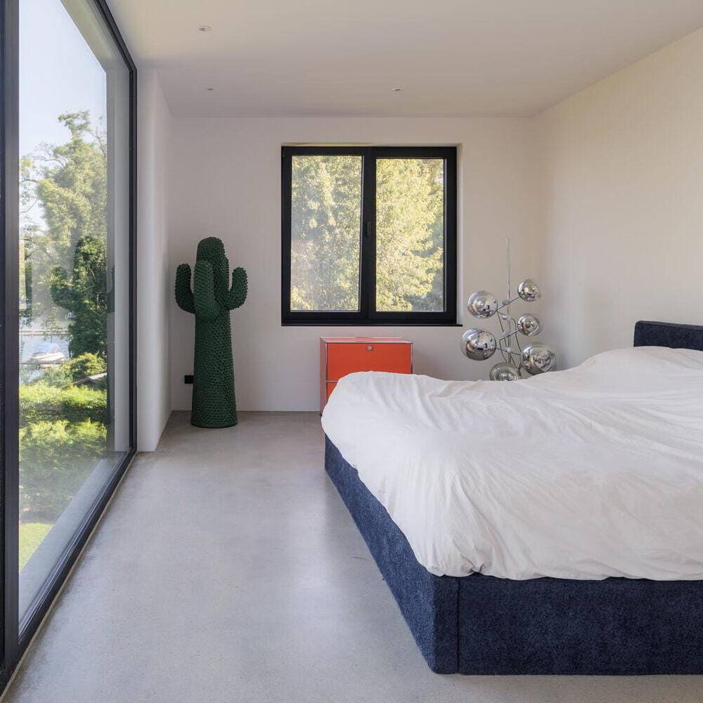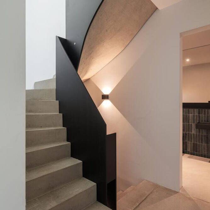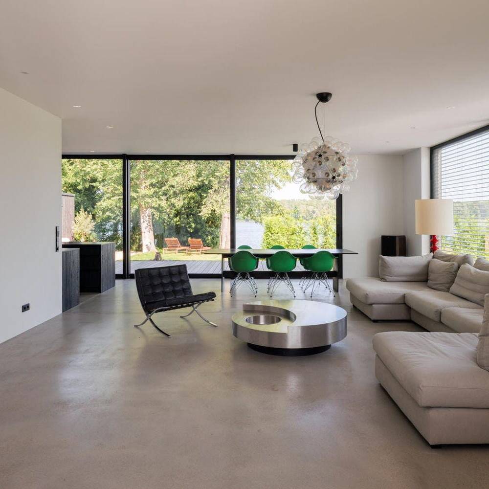 Der Stil des Hauses ist eine Reminiszenz an das alte Fischerdorf in Verbindung mit moderner Materialität und Architektursprache. Eine weitere Besonderheit sind die Panoramafenster auf der Seeseite im Osten. Auch die Südseite überrascht mit diesen großzügigen Fenstern. Neu gepflanzte Bäume und der alte Baumbestand sorgen für Sichtschutz. Aus diesen Blickwinkeln sieht das Haus wie ein Glashaus aus, das von einem Holzrahmen getragen wird. Eine vorgelagerte, großzügige Terrasse lädt zum Essen im Freien, Sonnenbaden oder einfach nur zum Entspannen ein. Als Dämmmaterial kamen Zellulose-Einblas- und Holzfaserdämmung zum Einsatz. Der geschliffene Estrichboden verbindet alle drei Geschosse über eine skulpturale Betontreppe, während er in den Badezimmern in einen farbgleichen Mikrozementboden übergeht. Durch die offene Struktur im Erdgeschoss und die großen Fensterflächen lässt sich das Draußen auch im Inneren erleben. Die Bewohner:innen können sich an großzügigen, hellen Räumen erfreuen.