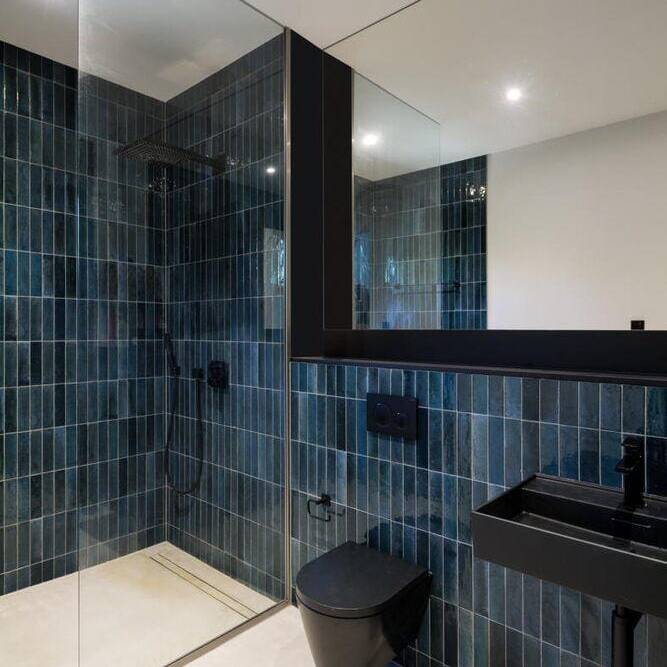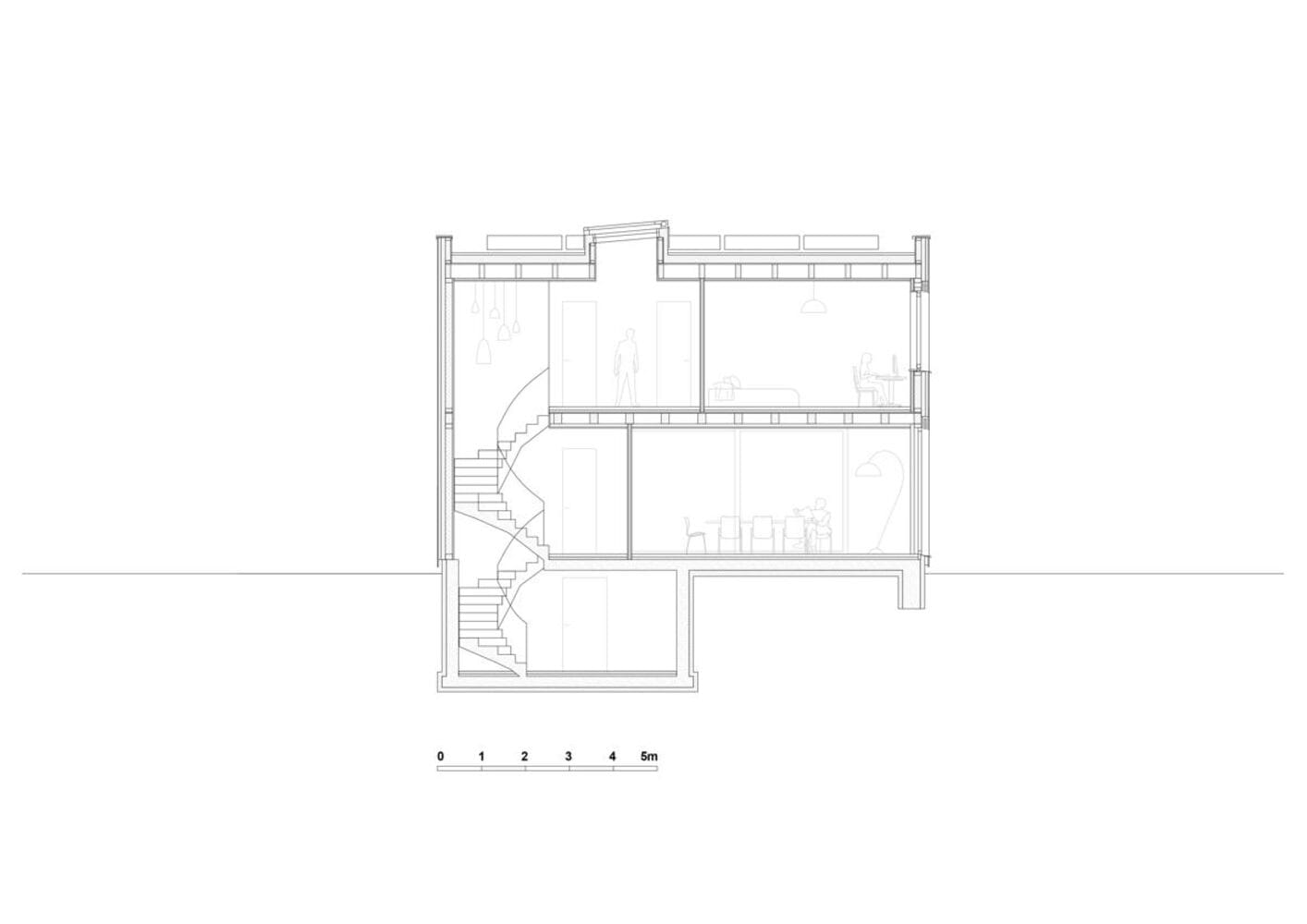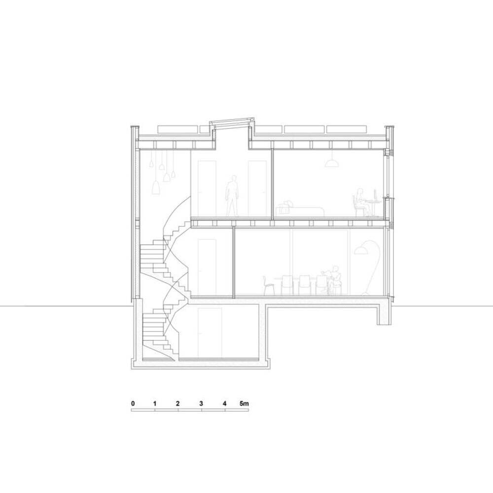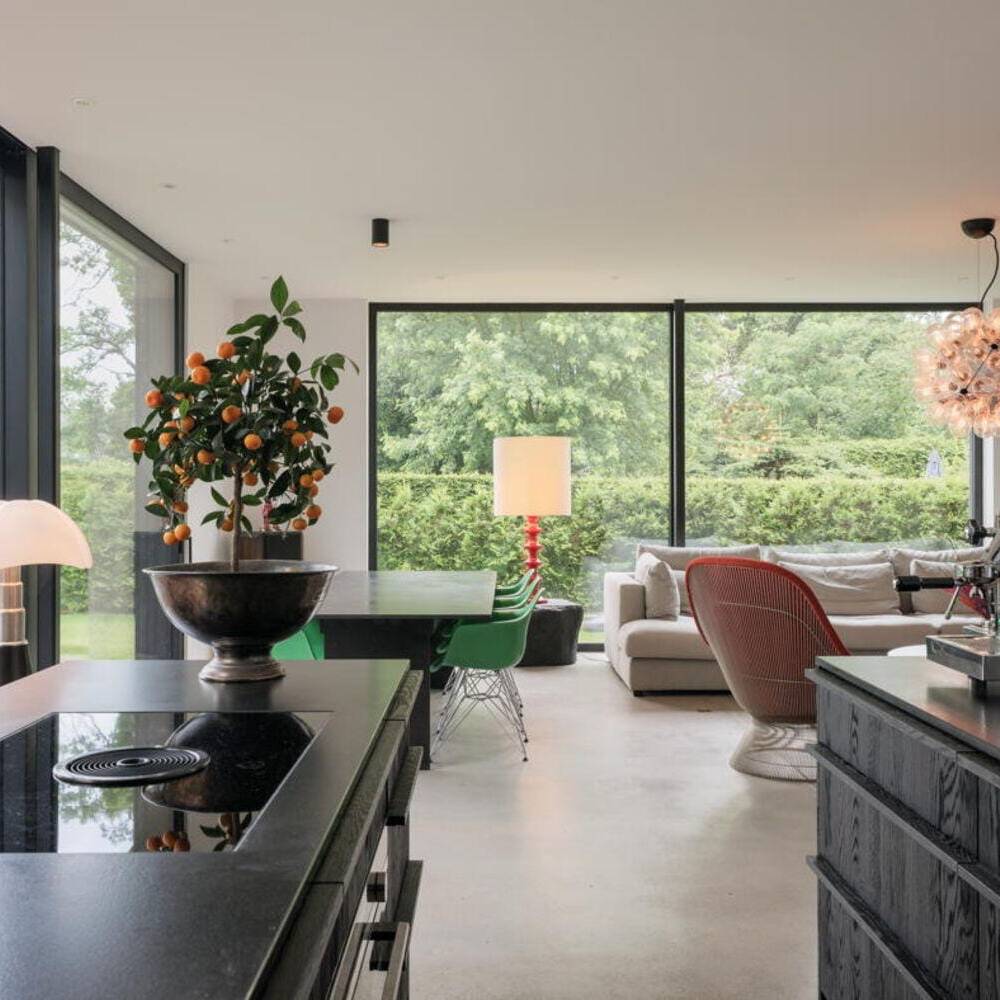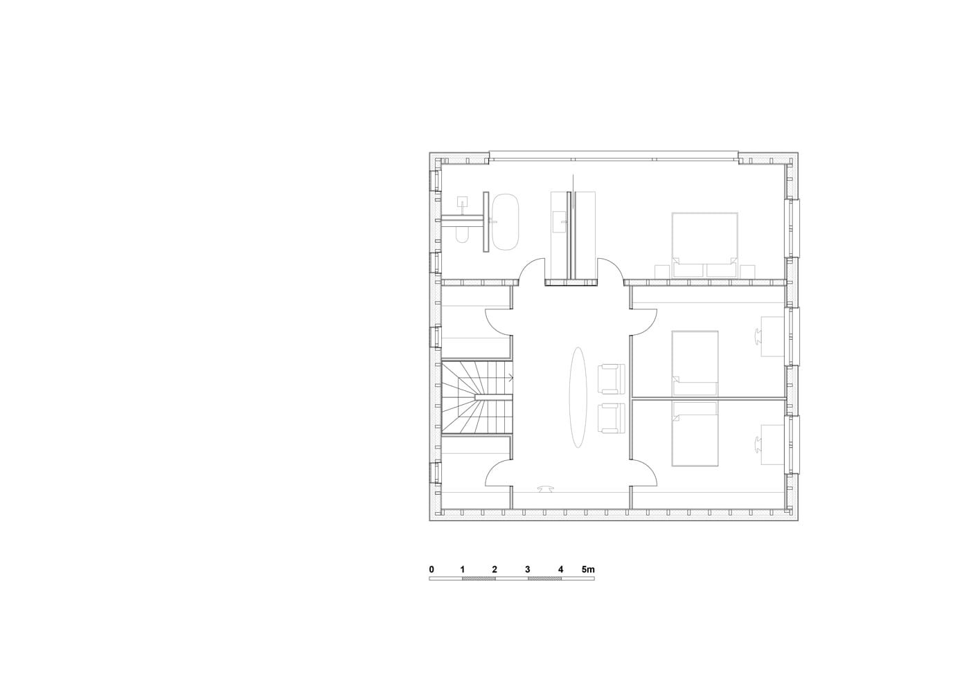 Der Stil des Hauses ist eine Reminiszenz an das alte Fischerdorf in Verbindung mit moderner Materialität und Architektursprache. Eine weitere Besonderheit sind die Panoramafenster auf der Seeseite im Osten. Auch die Südseite überrascht mit diesen großzügigen Fenstern. Neu gepflanzte Bäume und der alte Baumbestand sorgen für Sichtschutz. Aus diesen Blickwinkeln sieht das Haus wie ein Glashaus aus, das von einem Holzrahmen getragen wird. Eine vorgelagerte, großzügige Terrasse lädt zum Essen im Freien, Sonnenbaden oder einfach nur zum Entspannen ein. Als Dämmmaterial kamen Zellulose-Einblas- und Holzfaserdämmung zum Einsatz. Der geschliffene Estrichboden verbindet alle drei Geschosse über eine skulpturale Betontreppe, während er in den Badezimmern in einen farbgleichen Mikrozementboden übergeht. Durch die offene Struktur im Erdgeschoss und die großen Fensterflächen lässt sich das Draußen auch im Inneren erleben. Die Bewohner:innen können sich an großzügigen, hellen Räumen erfreuen.