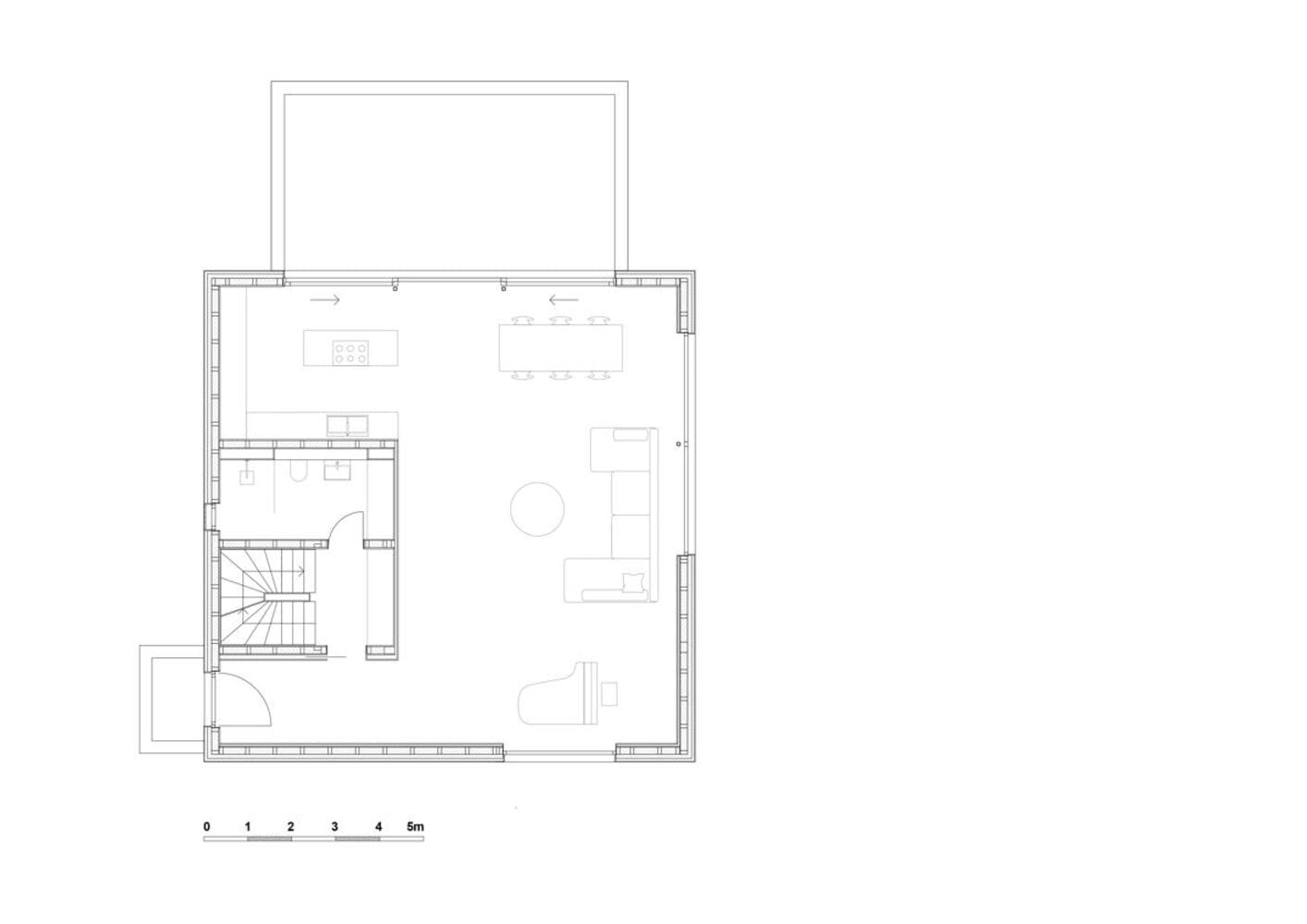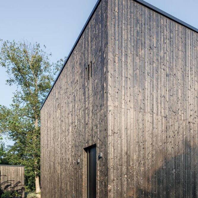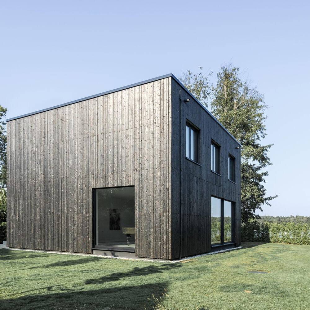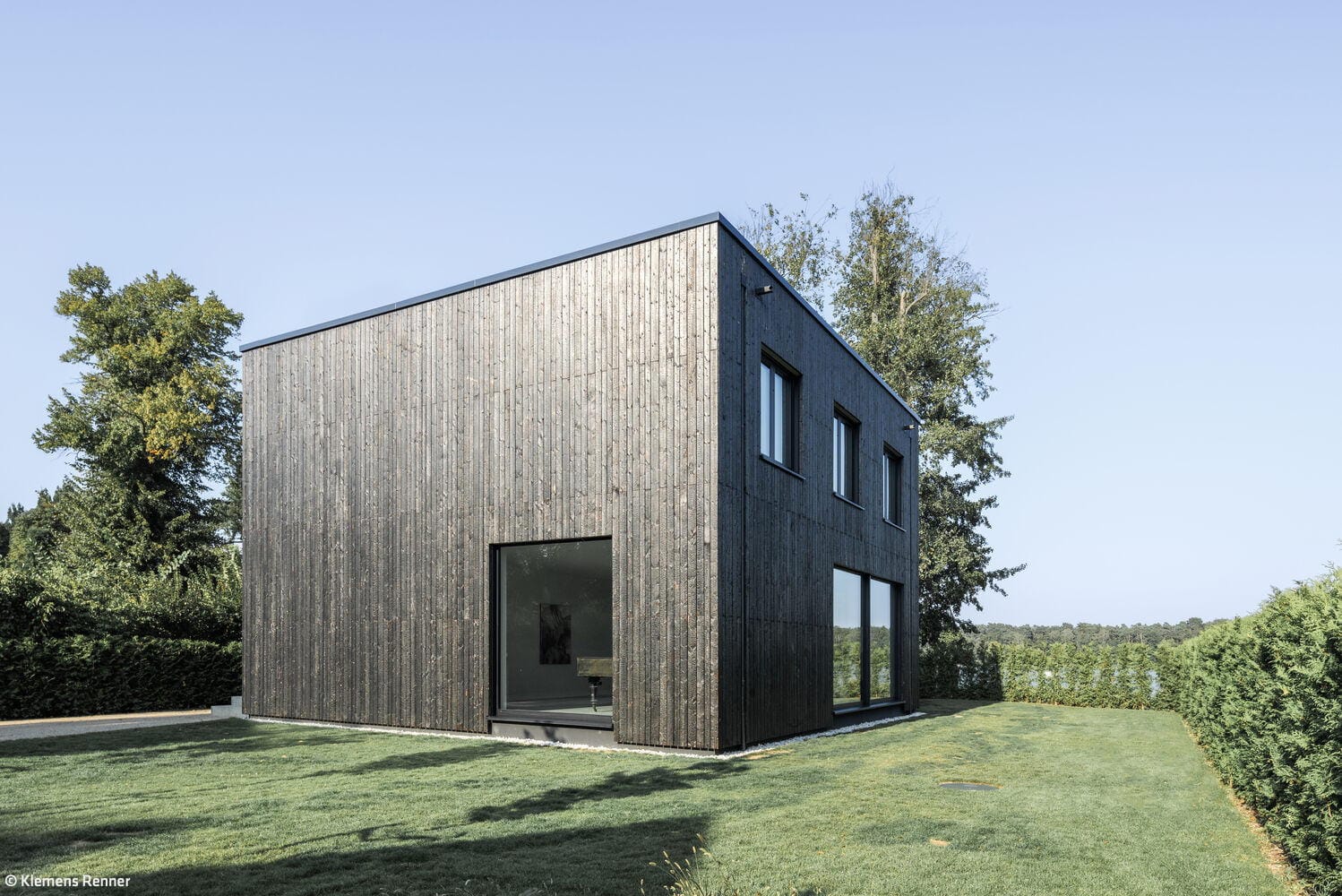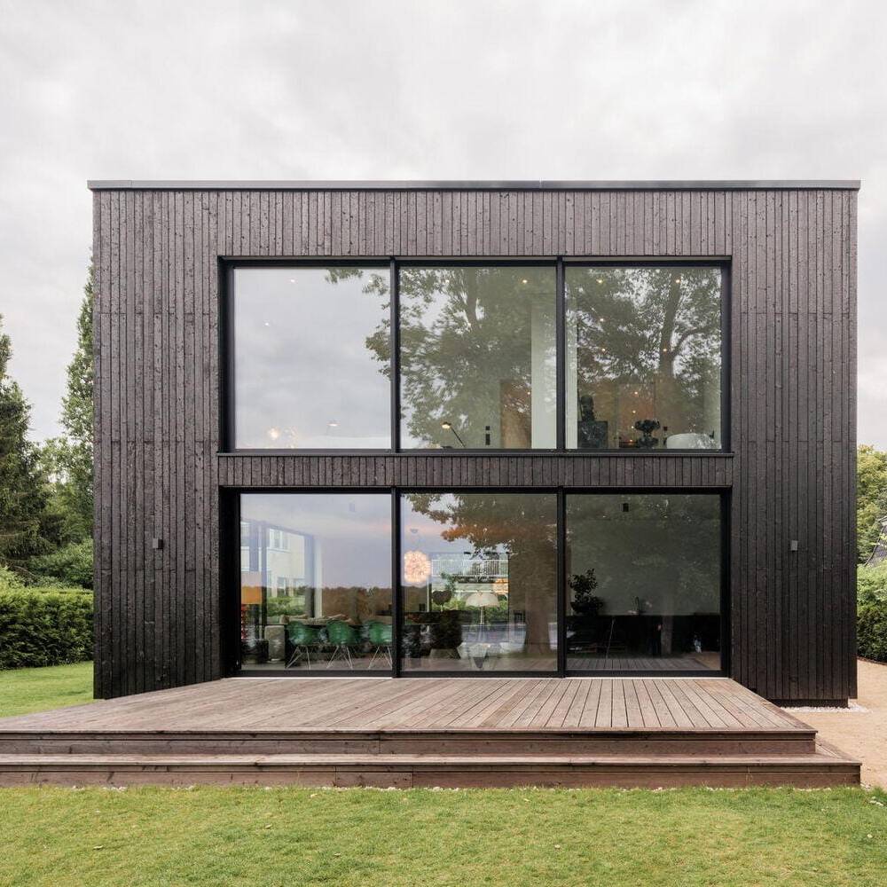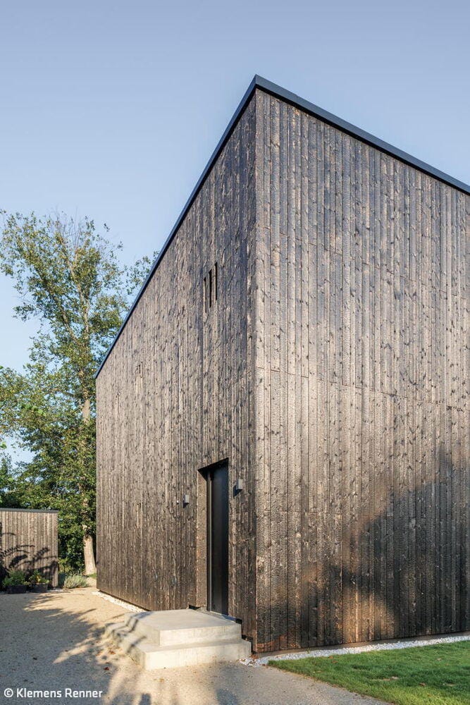 Zum Konzept des Büros gehört zudem, sich mit nachhaltigen Innovationen auseinanderzusetzen und dieses Wissen weiterzugeben – etwa durch Vorträge und die Organisation baukultureller Veranstaltungen. Und selbstverständlich gehört dazu auch die Entscheidung für nachhaltige Baumaterialien und energieeffizientes Vorgehen. Aber zurück zum „Haus am See“: Mit seiner kompakten, klaren Kubusform aus schwarzem Holz mutet es wie ein Würfel an – bis es seine Raffinessen preisgibt: Es handelt sich um einen Holzständerbau mit einer Holzbalkendecke. Das auffälligste Merkmal ist die Fassade aus einer vertikalen, nach der Shou-Sugi-Ban-Methode verkohlten Holzschalung. Um hier eine natürlichere Textur zu erzielen, variieren die Bretter in der Breite. Seine schwarze Erscheinung verweist auf die alten Fischerhütten und Bootshäuser, wie sie teilweise noch heute in der Nachbarschaft zu finden sind und schafft dadurch eine Verbindung zu seinem Umfeld.