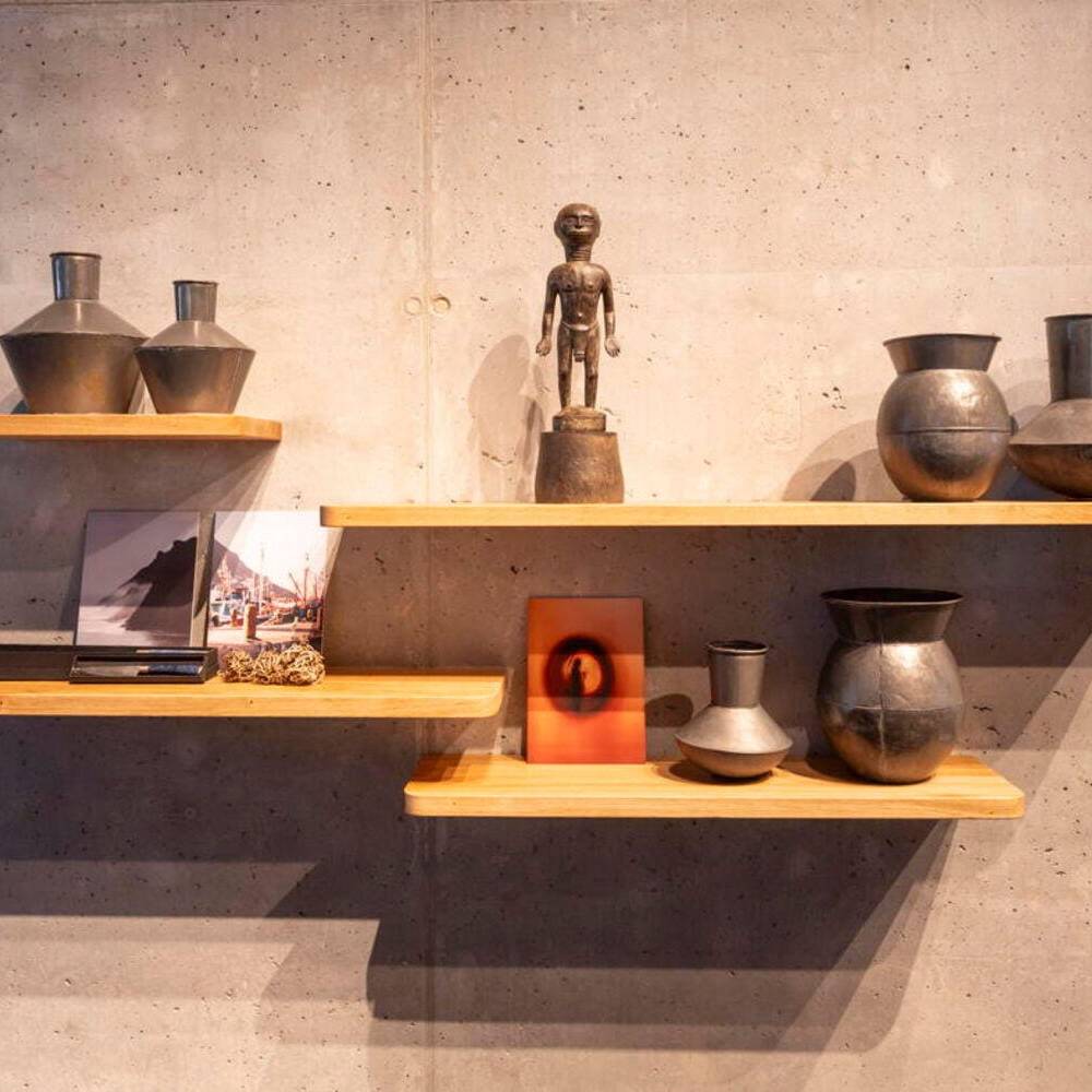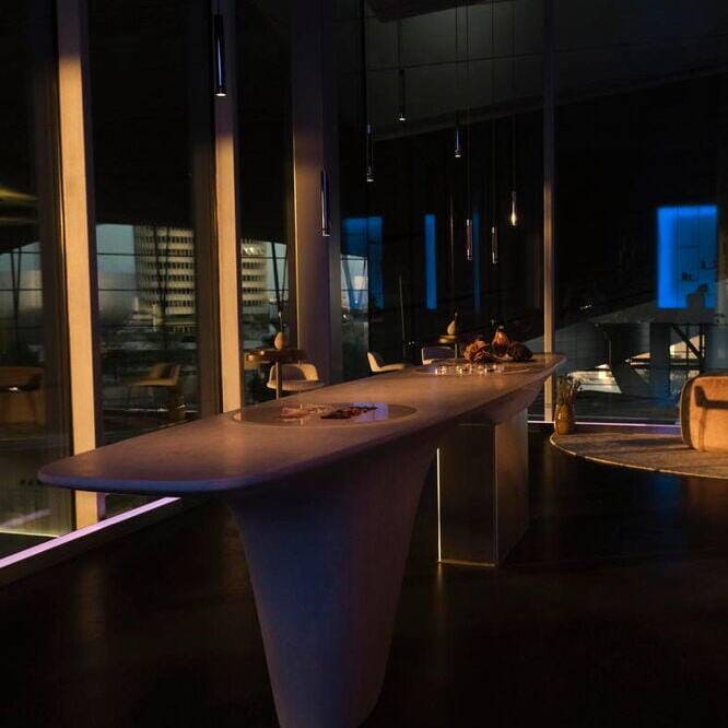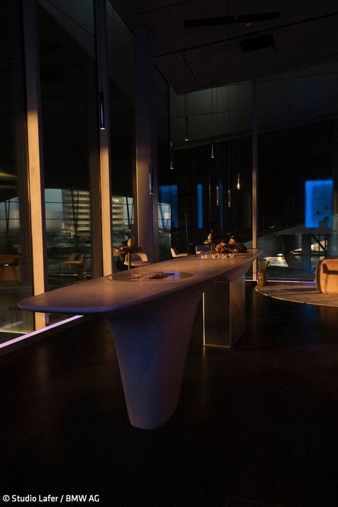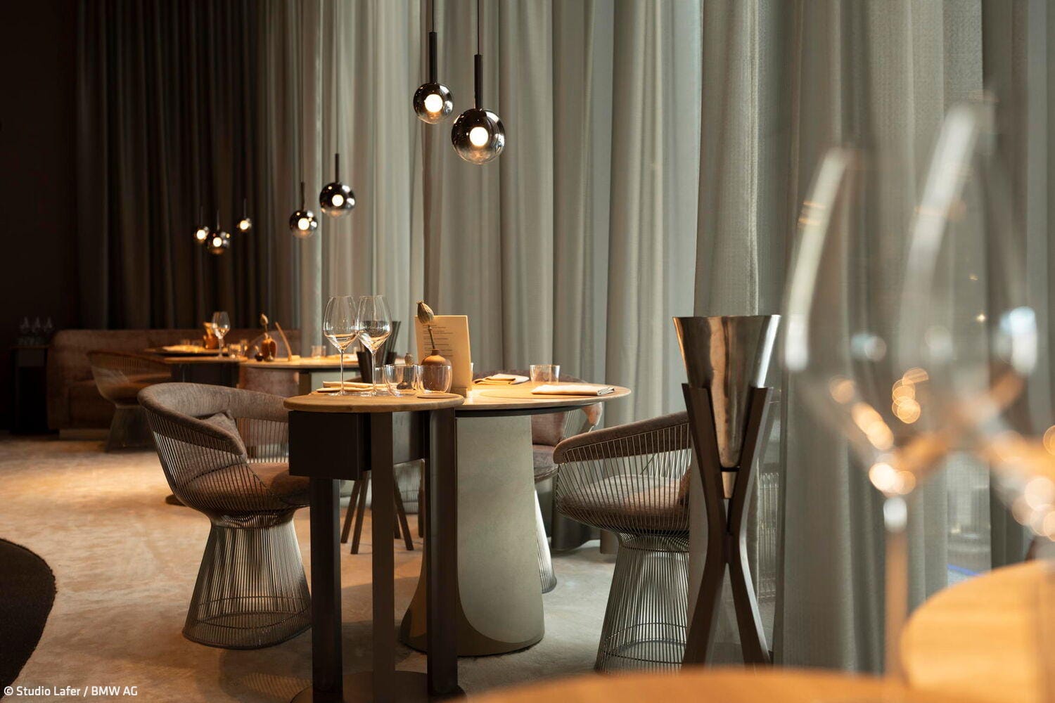 Unter der Wolke präsentiert sich ein Monolith aus dunkel schimmerndem brasilianischem Titanium-Naturstein, knapp fünf Tonnen schwer. Hier werden Speisen vor den Augen der Gäste angerichtet: Verborgen von einer halbtransparenten Spiegelfläche befindet sich hinter ihm ein Küchenraum für die Chefs. Die insgesamt 42 Sitzplätze verteilen sich auf verschiedene Bereiche: offen mit weitem Blick oder intim und geschützt, einige davon mit direktem Blick auf den Abholbereich der Neuwagen. Speziell entworfene Tische mit hellen Natursteinplatten und Gatsby-inspirierte Stühle ergänzen das edle Ambiente. Sie werden von elegant-zurückhaltenden Pendel-Glasleuchten in Szene gesetzt, in denen das Licht zu schweben scheint, während ihre weiche, warme Lichtstimmung jedes Menü wie eine leise Inszenierung begleitet.
