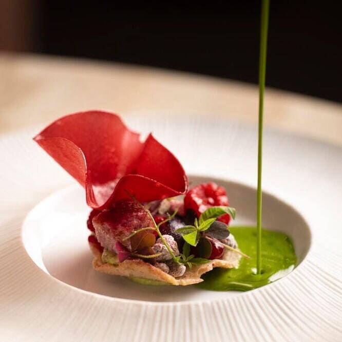 Das Restaurant thront im dritten Stock über den weitläufigen Hallen der ikonischen BMW-Welt und bietet eine ganz eigene, fast magisch anmutende Interior-Welt: Hier trifft die moderne Formensprache der Automarke – klar, reduziert, technisch präzise – auf organische Materialien und künstlerische Details. Die Verbindung von Automobildesign, Technologie und Erlebniswelt der BMW-Welt mit der feinen Gastronomie von Käfer eröffnete den Gestaltenden die Möglichkeit, Architektur und Design neu zu denken – als multisensorisches Erlebnis. Vom Empfang bis zum Gastraum entsteht eine klare Abfolge von Eindrücken – ähnlich einem Theaterstück, das mit jedem Schritt eine neue Szene eröffnet. An der Biophilic Bar, gefertigt aus Perlino Marmor, machen kunstvoll präsentierte Zutaten des Menüs bei einem Aperitif neugierig auf die nächsten Gänge. Anschließend serviert die Slim Bar einen persönlichen Cocktail, bevor Gäste über das Chef’s Atelier, dekoriert mit Reisefotos und exotischem Küchengerät, in den Hauptraum gelangen. Dort zieht die „Dining-Cloud“ – eine riesige, schwebende Wolke aus feinem Textil – alle Blicke auf sich: Gefertigt vom Schweizer Couture-Haus Jakob Schlaepfer, reagiert sie auf Licht – und changiert vom goldenen Schimmer der „Golden Hour“ bis zum tiefen Blau der Nacht. Der Lichtkünstler Oscar Zabala lässt dazu Projektionen über die Wolke tanzen, inspiriert von Farben und Texturen der Gerichte.